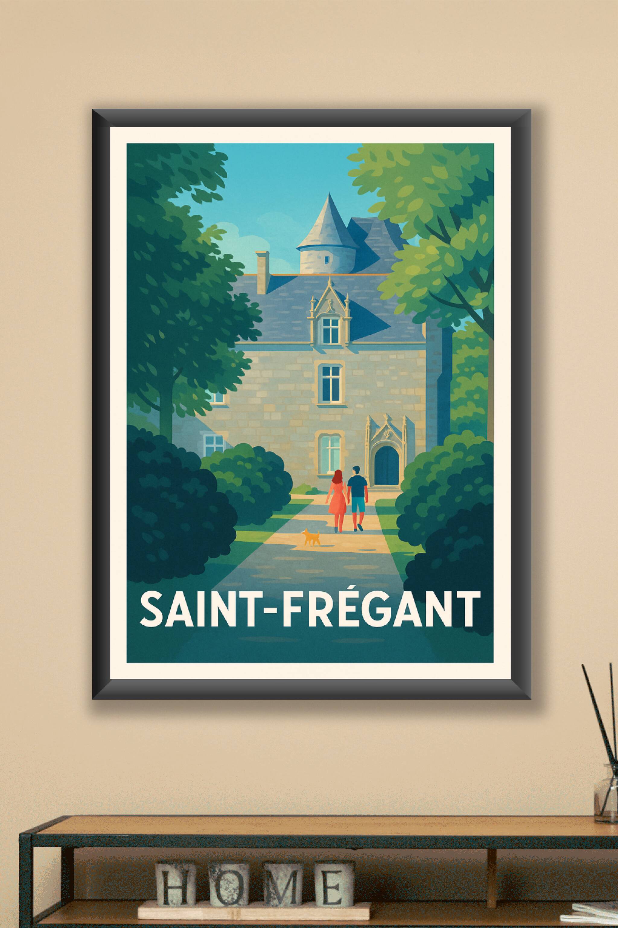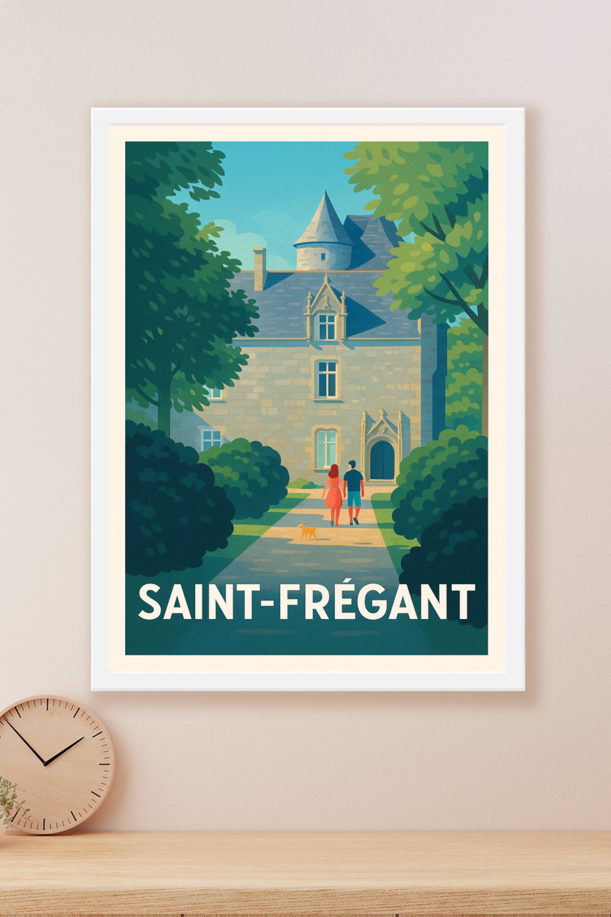 Découvrez l'élégance paisible de Saint-Frégant avec cette affiche illustrée mettant en scène une promenade romantique devant un château historique....