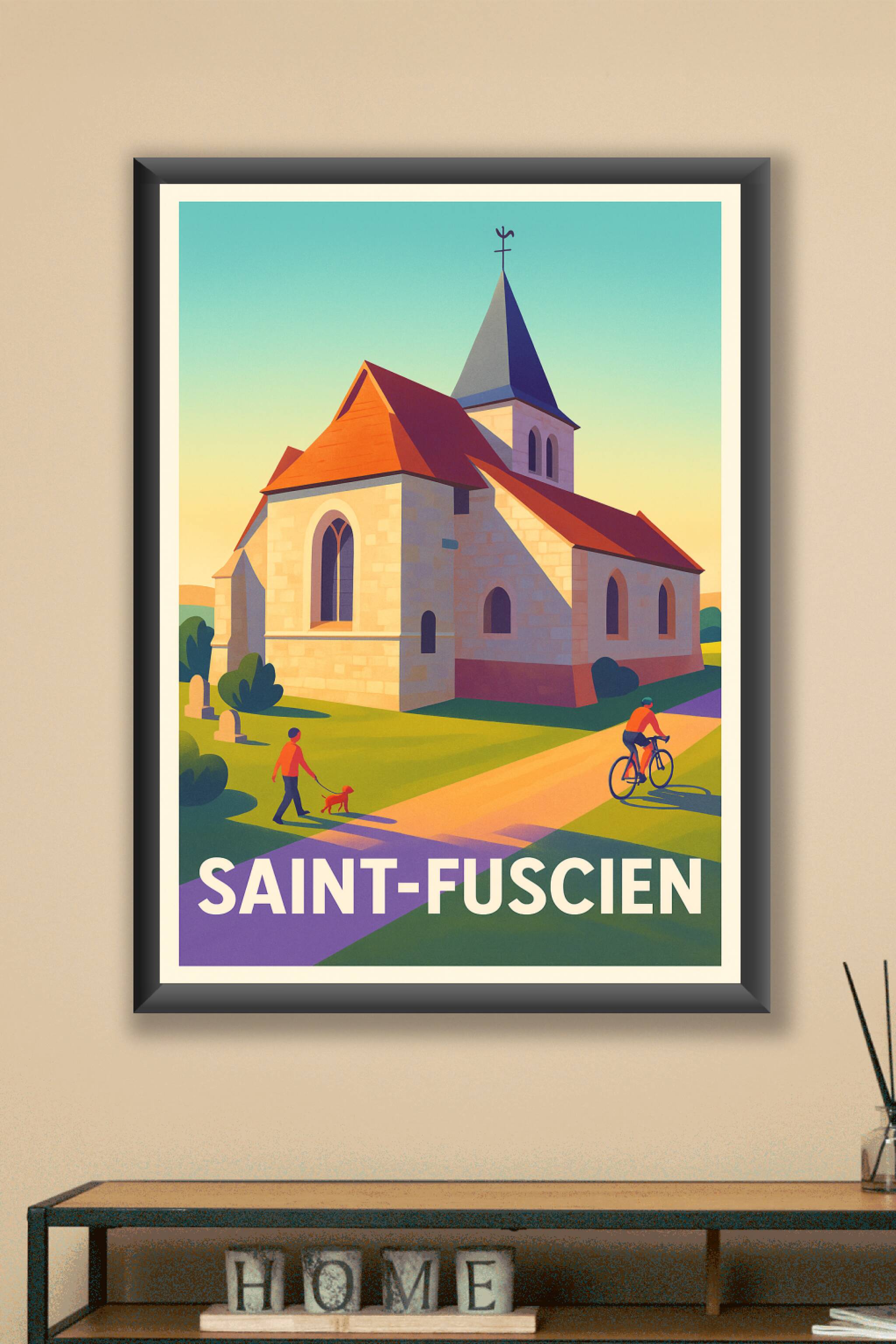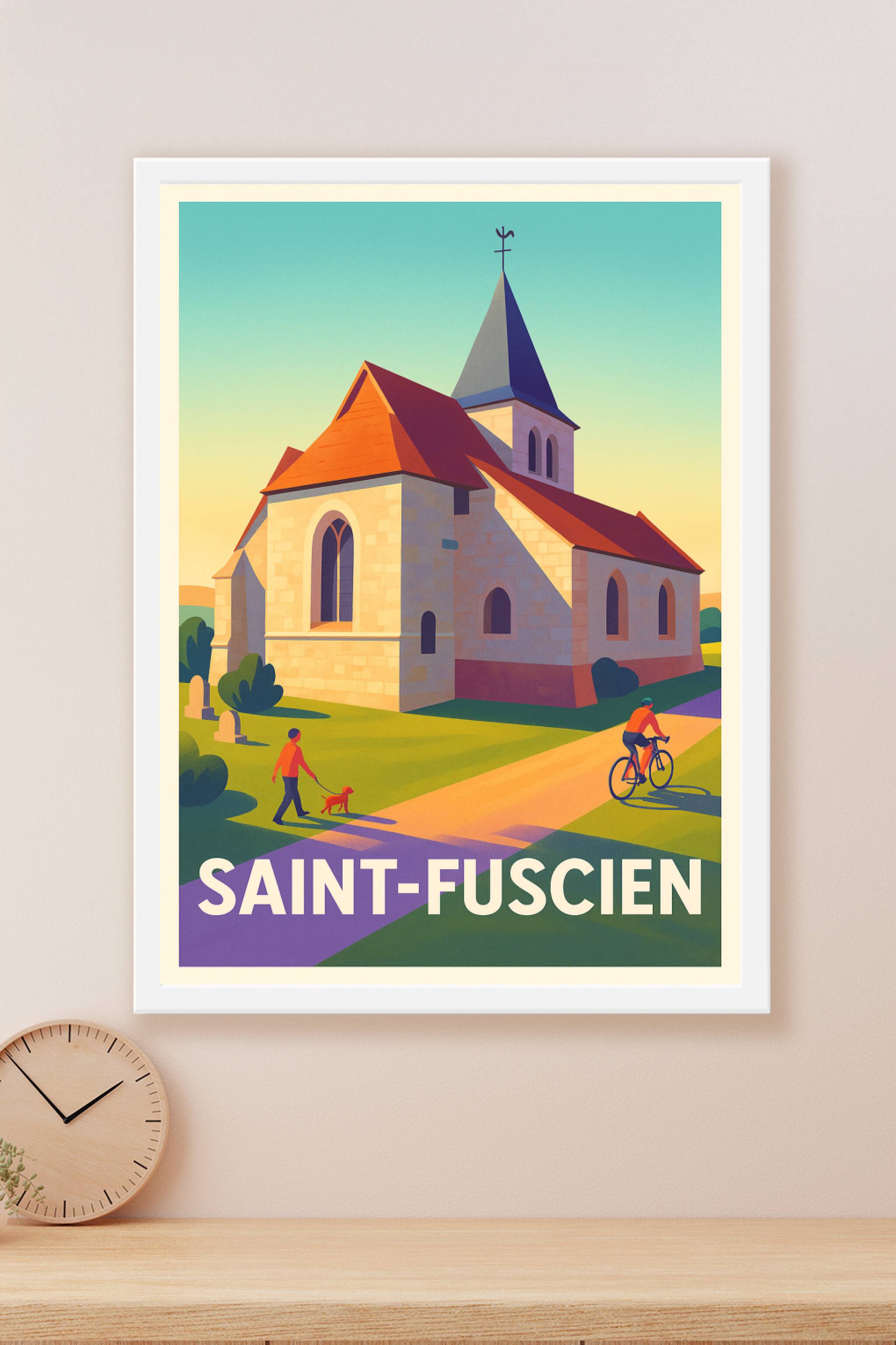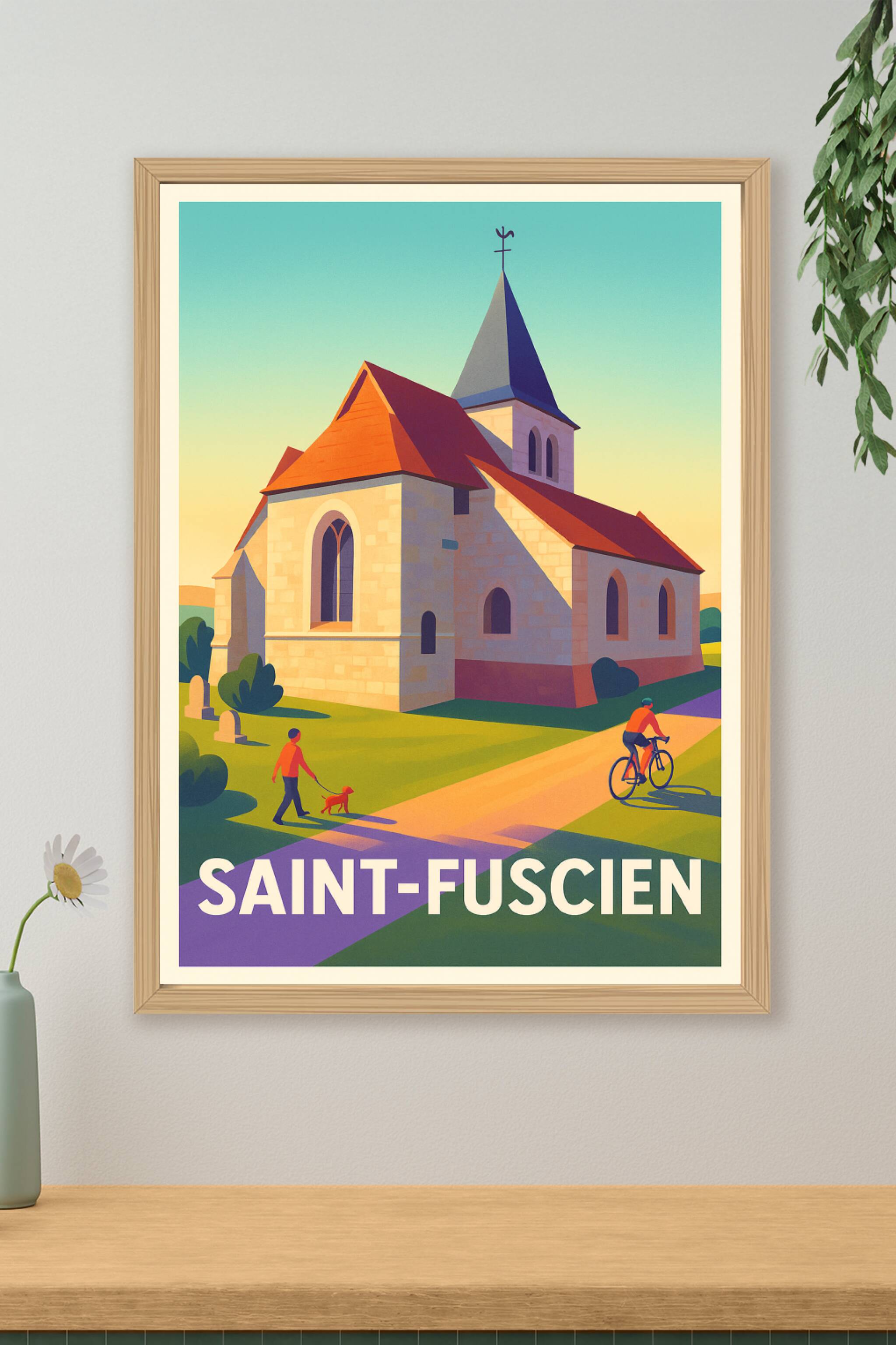 Découvrez la beauté paisible de Saint-Fuscien avec cette affiche illustrée mettant en avant son église emblématique baignée par une lumière douce e...