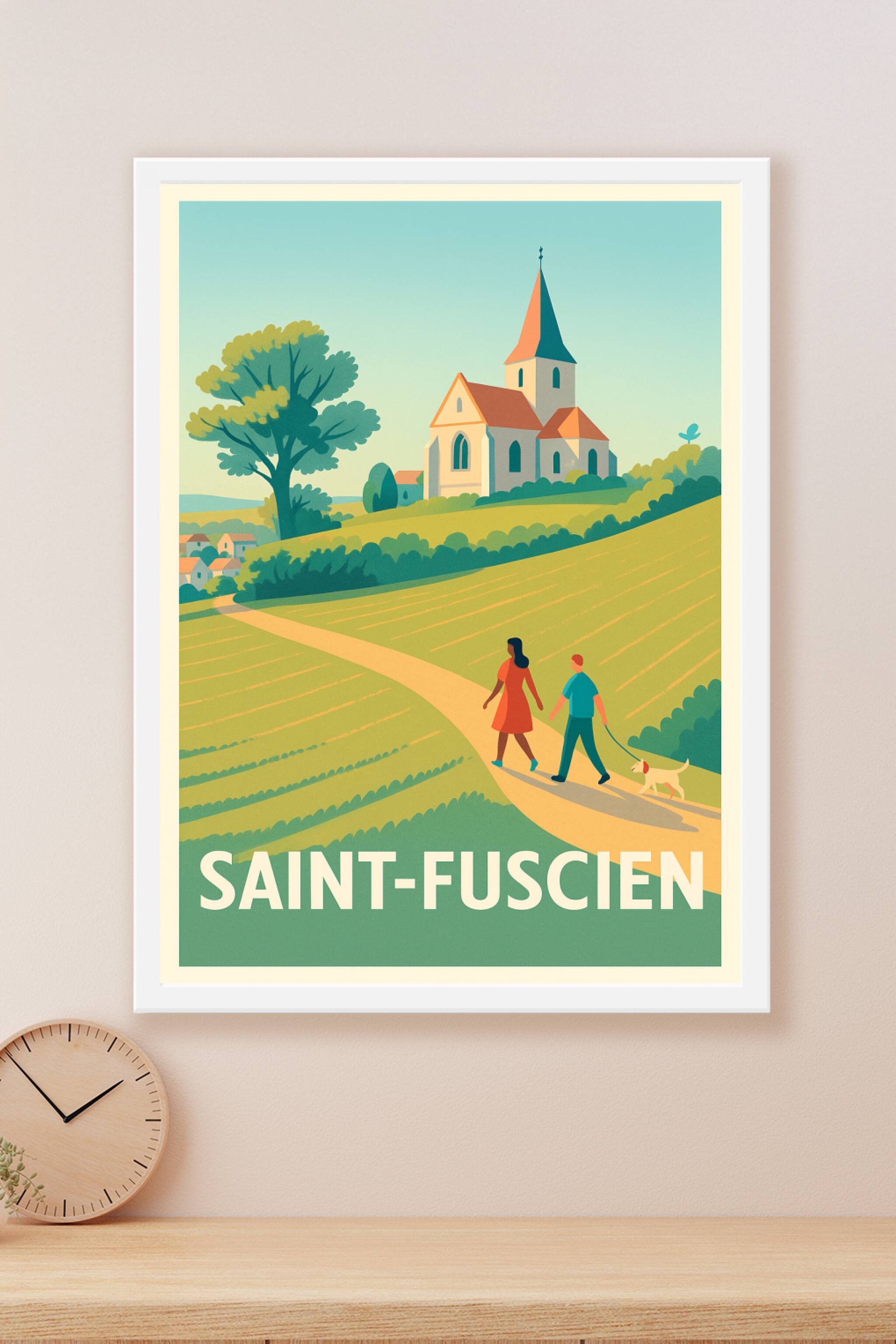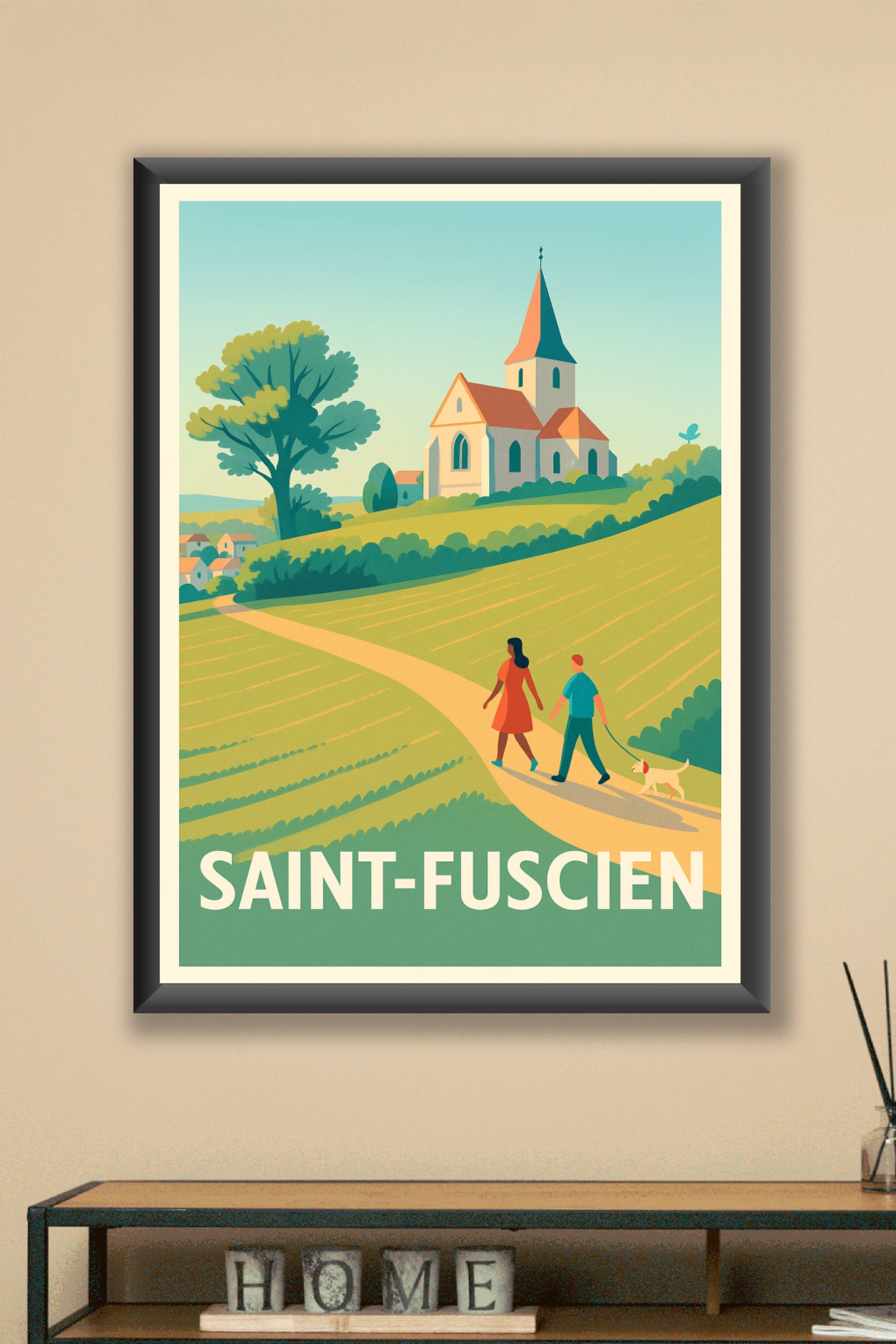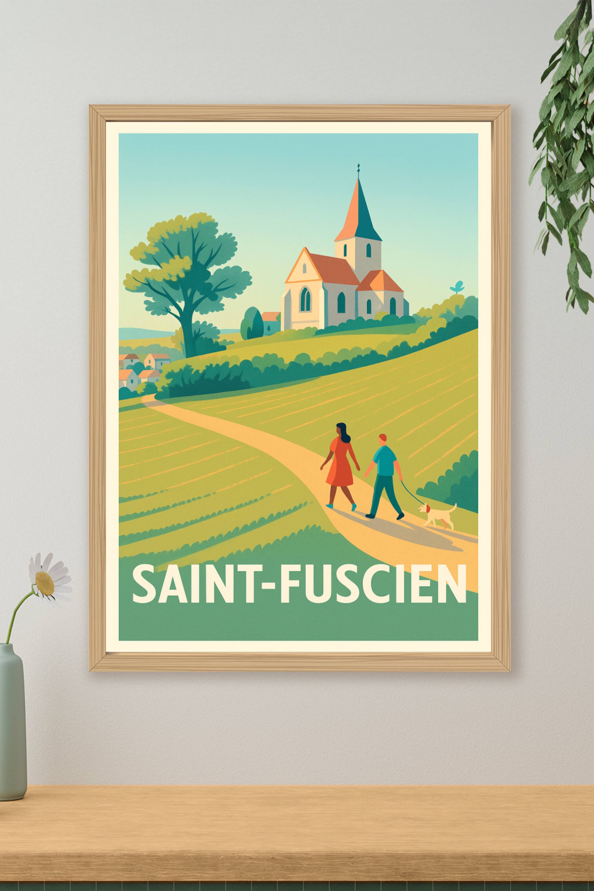 Découvrez la douce ambiance champêtre de Saint-Fuscien à travers cette affiche illustrée, mettant en scène un couple se promenant au pied d'une égl...