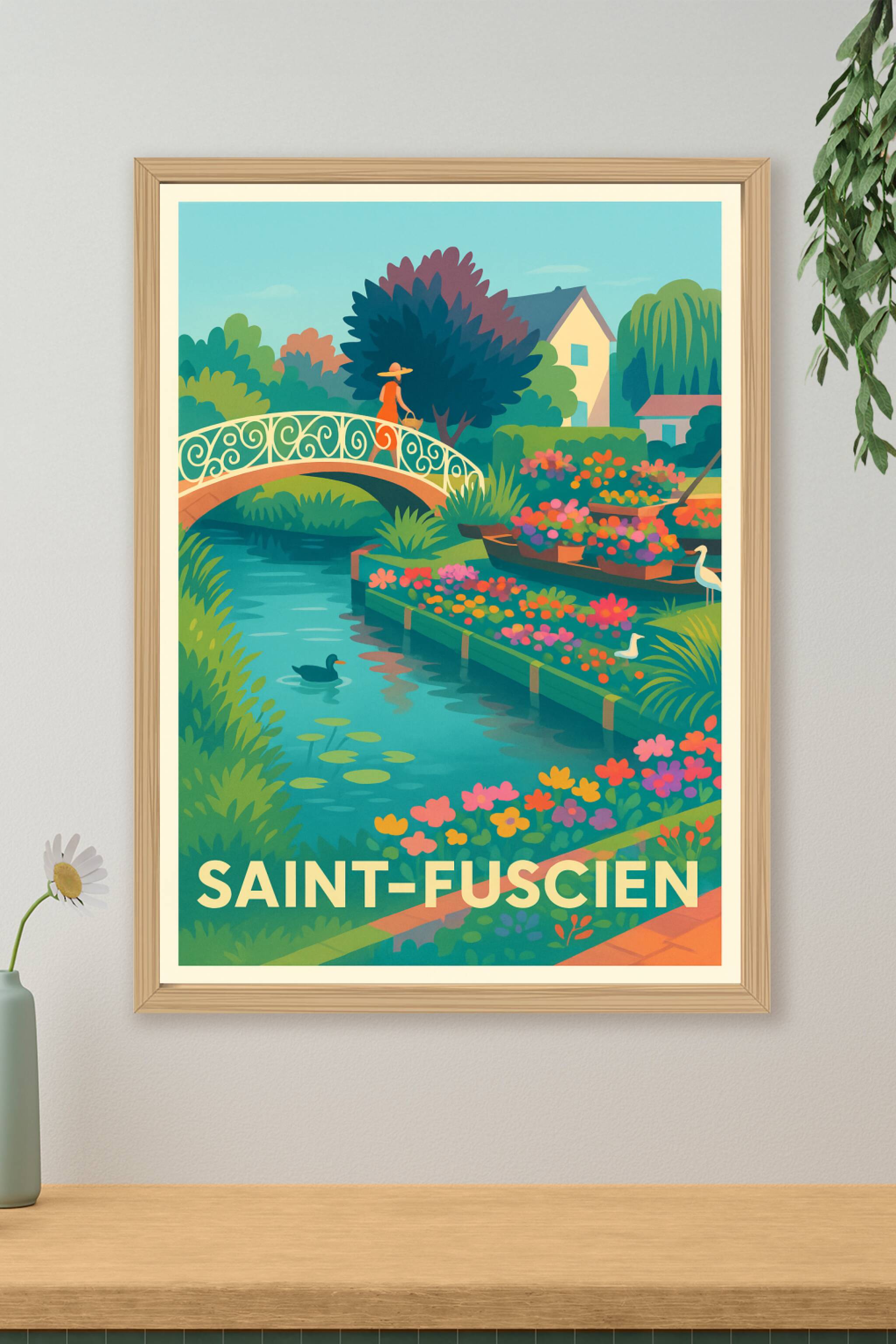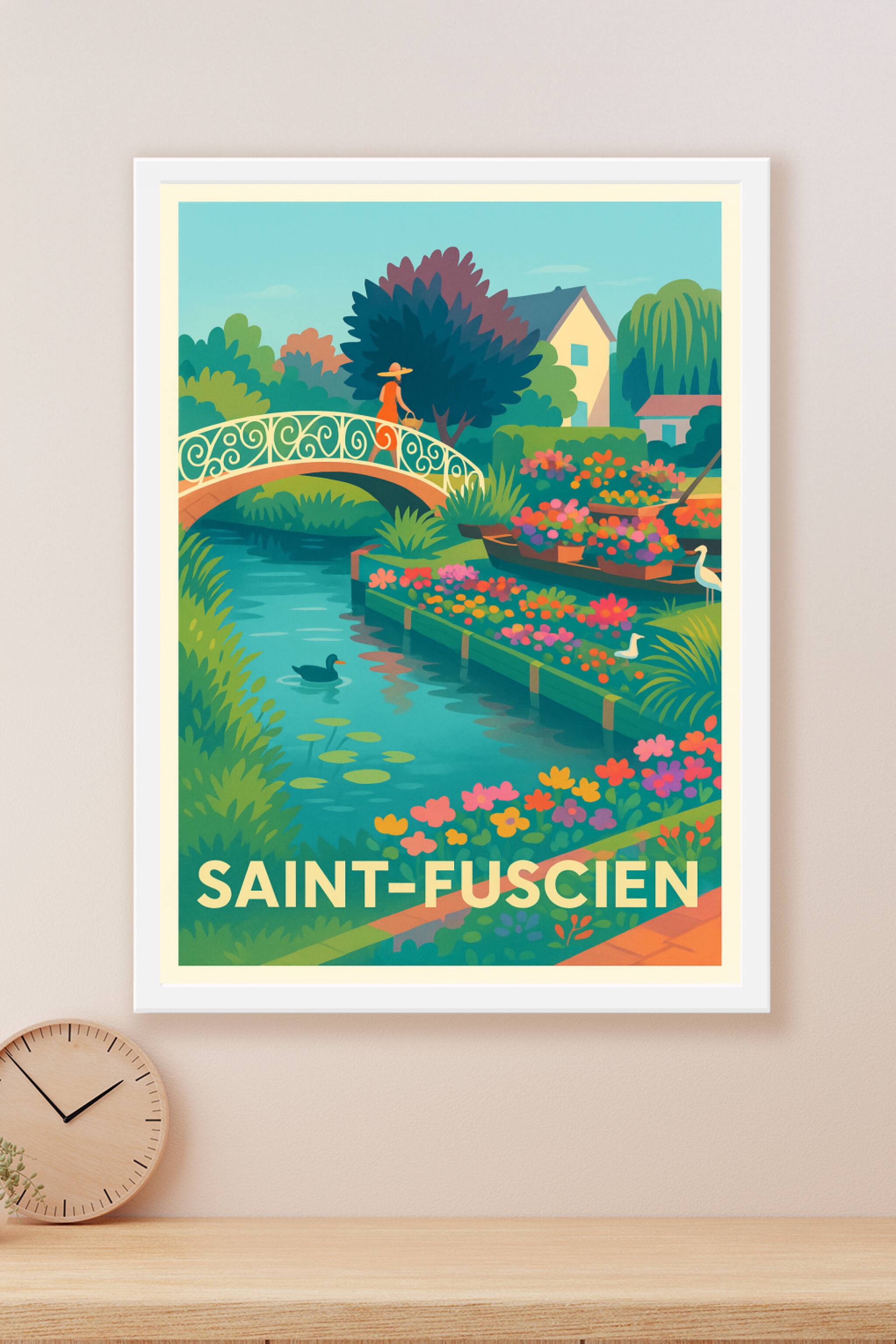 Découvrez la douceur bucolique de Saint-Fuscien avec cette affiche illustrée aux couleurs vibrantes et harmonieuses. Ce poster met en scène un pont...