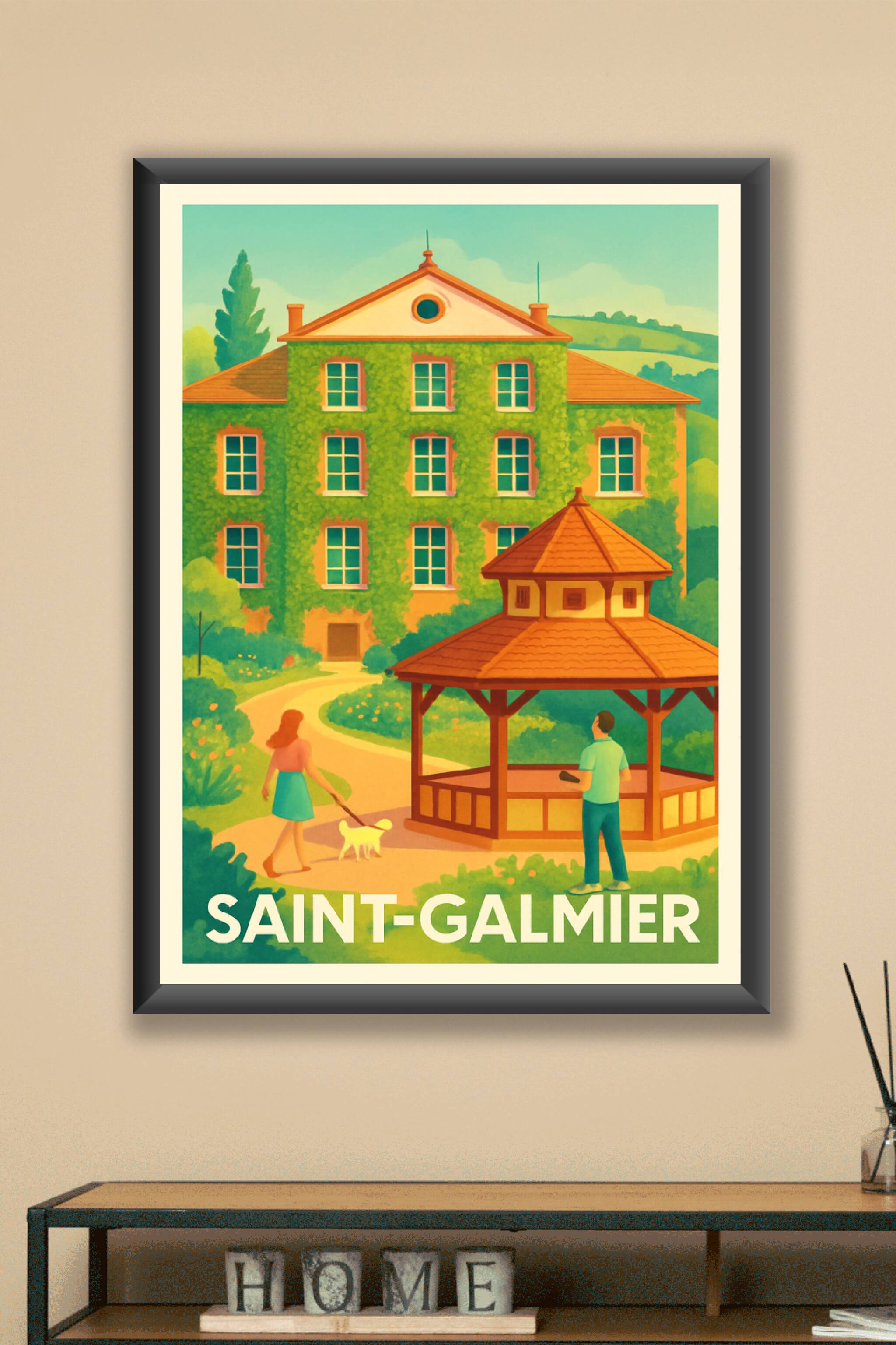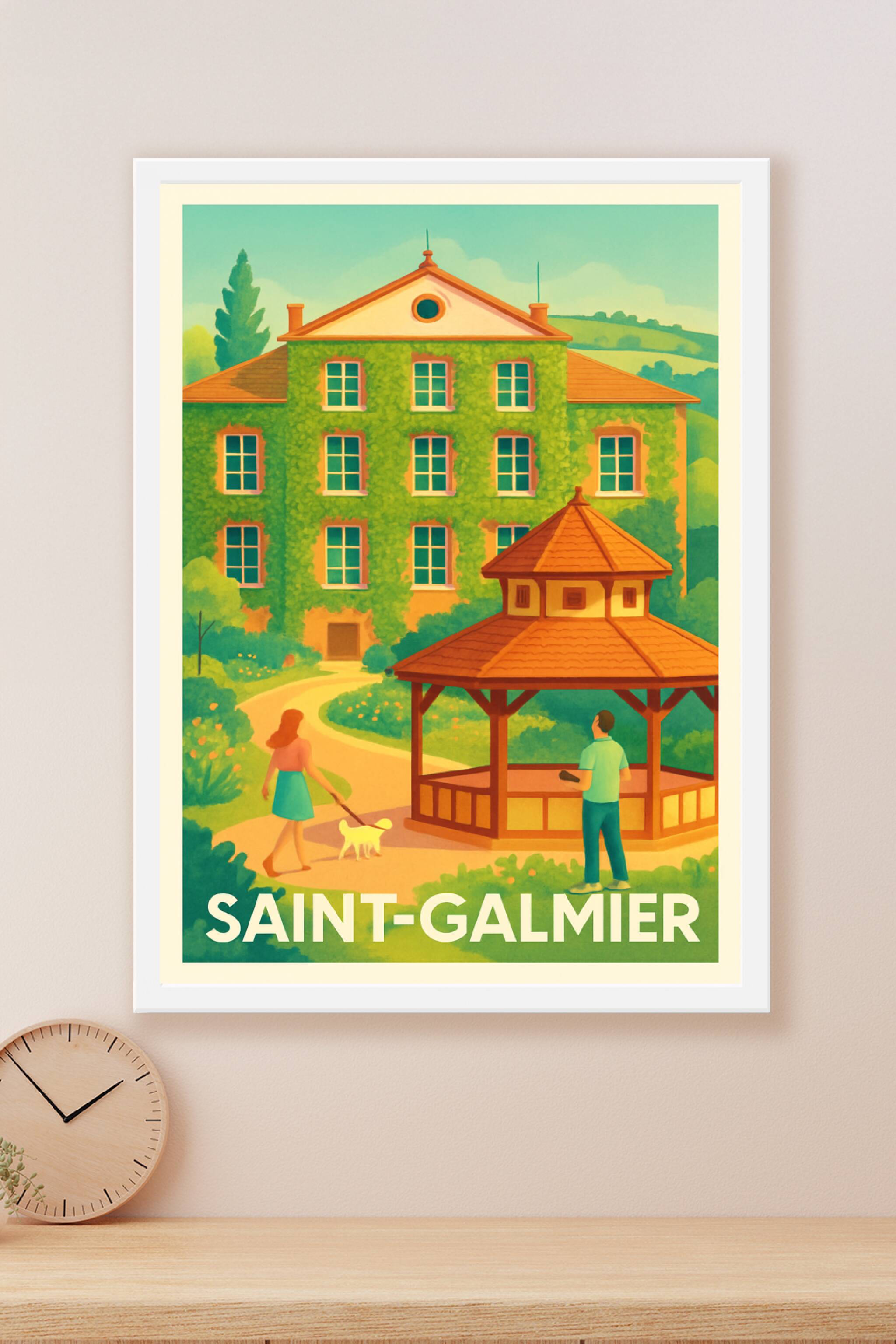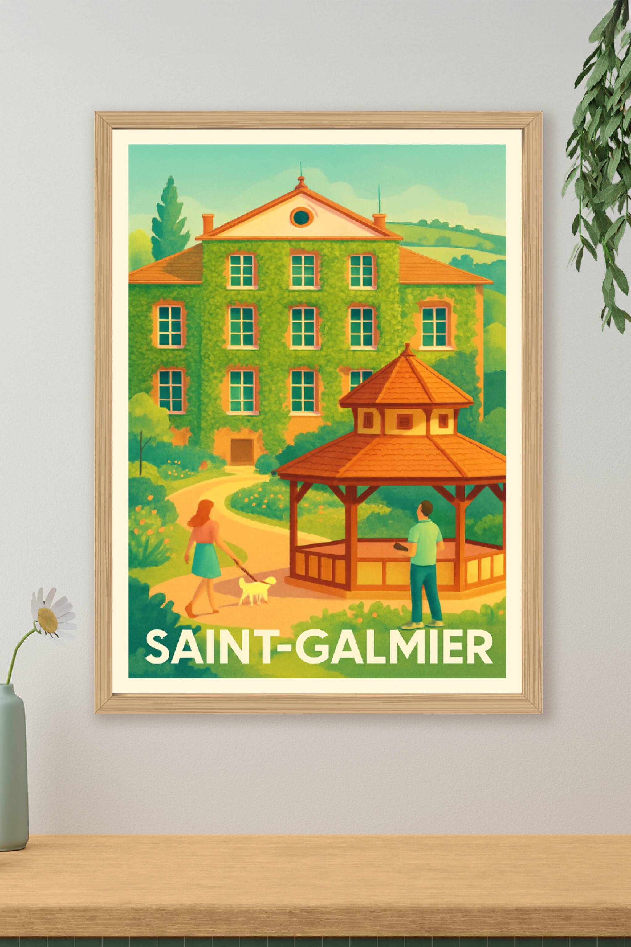 Découvrez l'élégance intemporelle de Saint-Galmier avec cette affiche illustrée aux teintes douces et chaleureuses. Ce poster met en scène une mais...