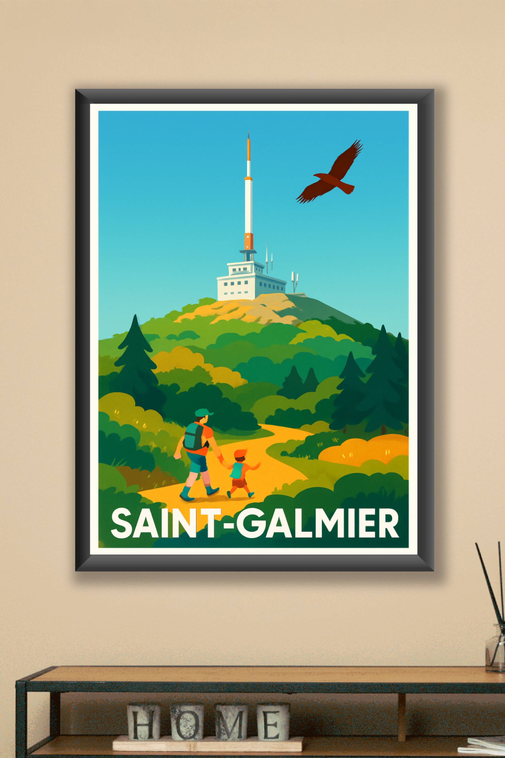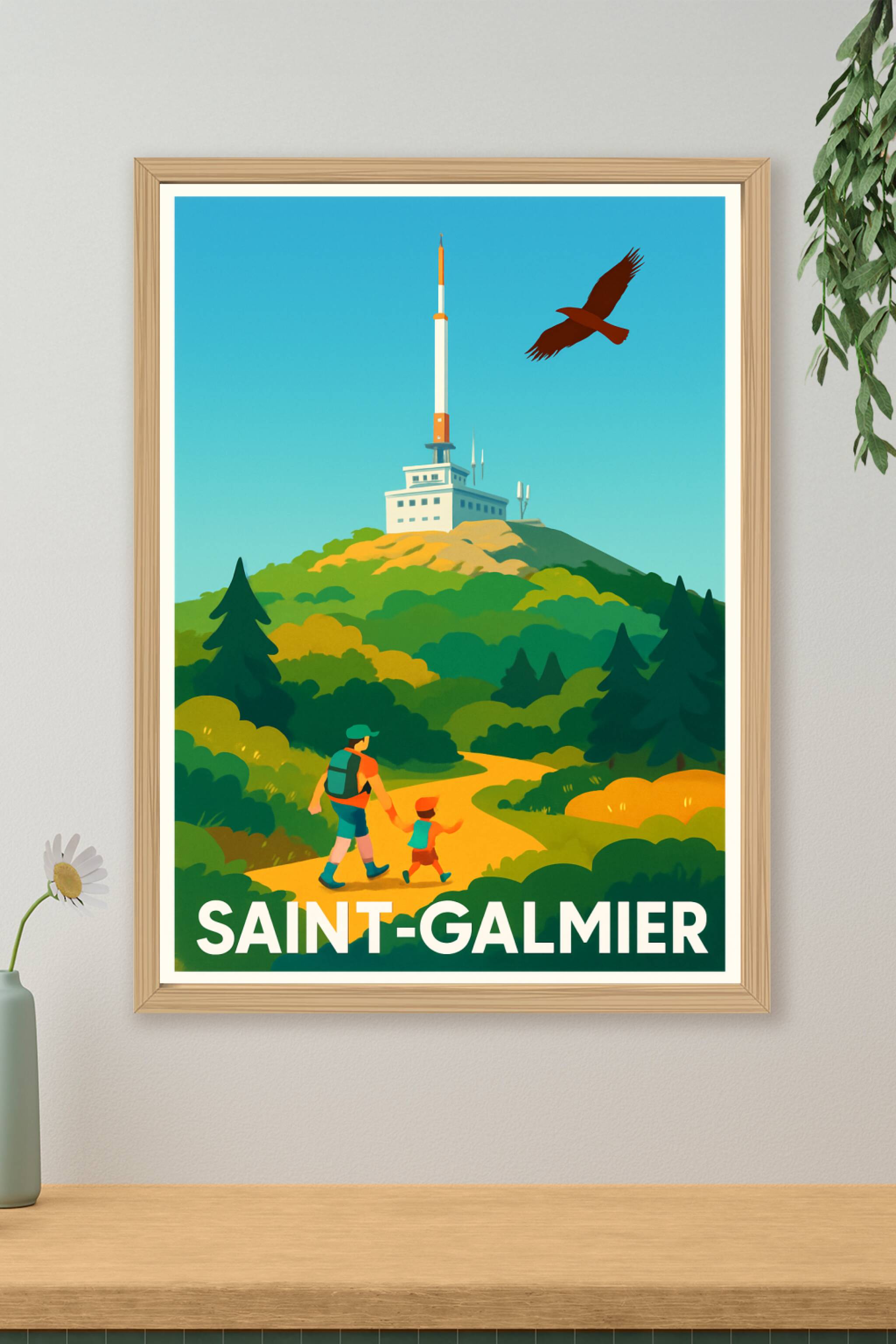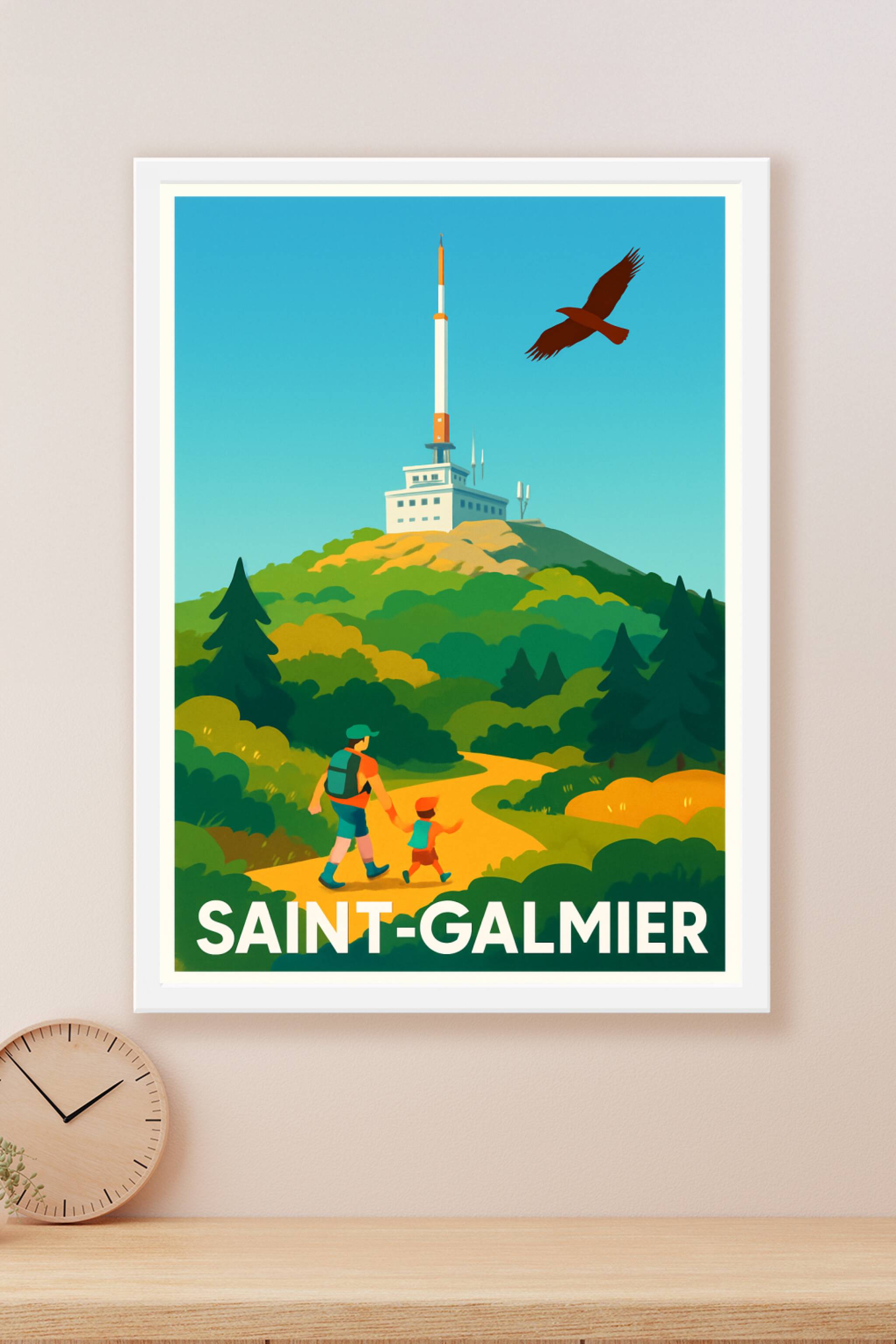 Découvrez la tranquillité et la beauté naturelle de Saint-Galmier avec cette superbe affiche illustrée, mettant en scène une randonnée familiale ve...