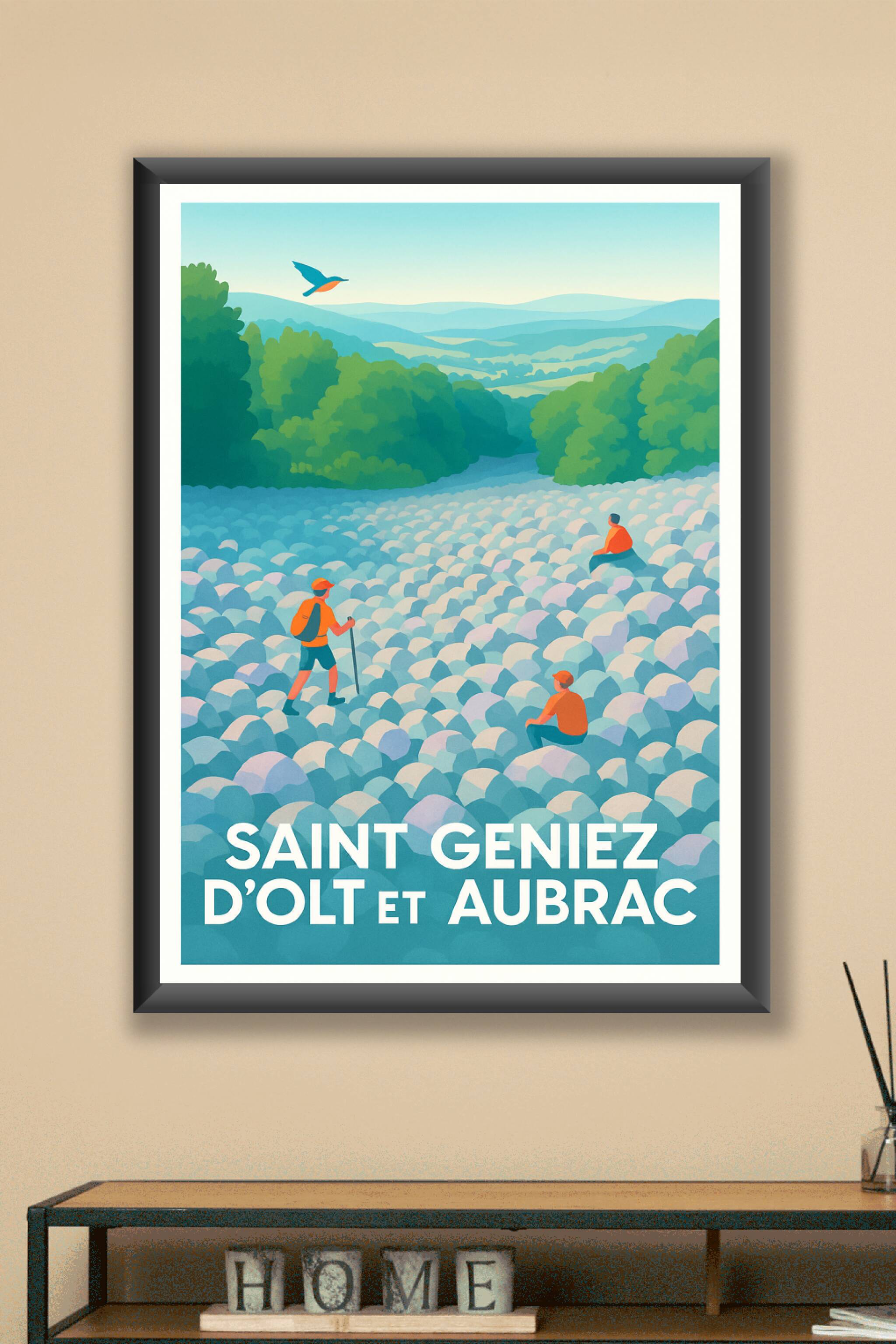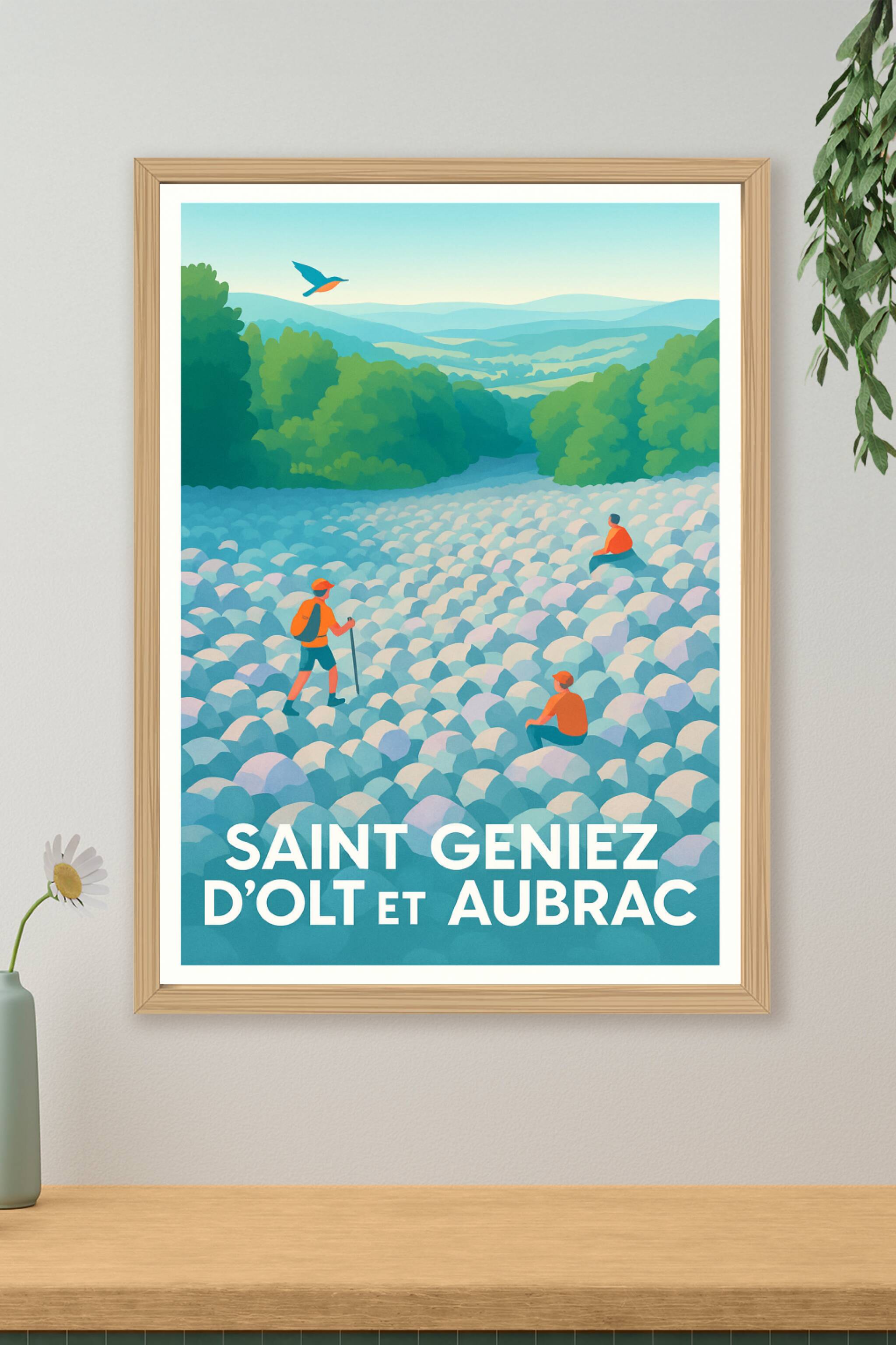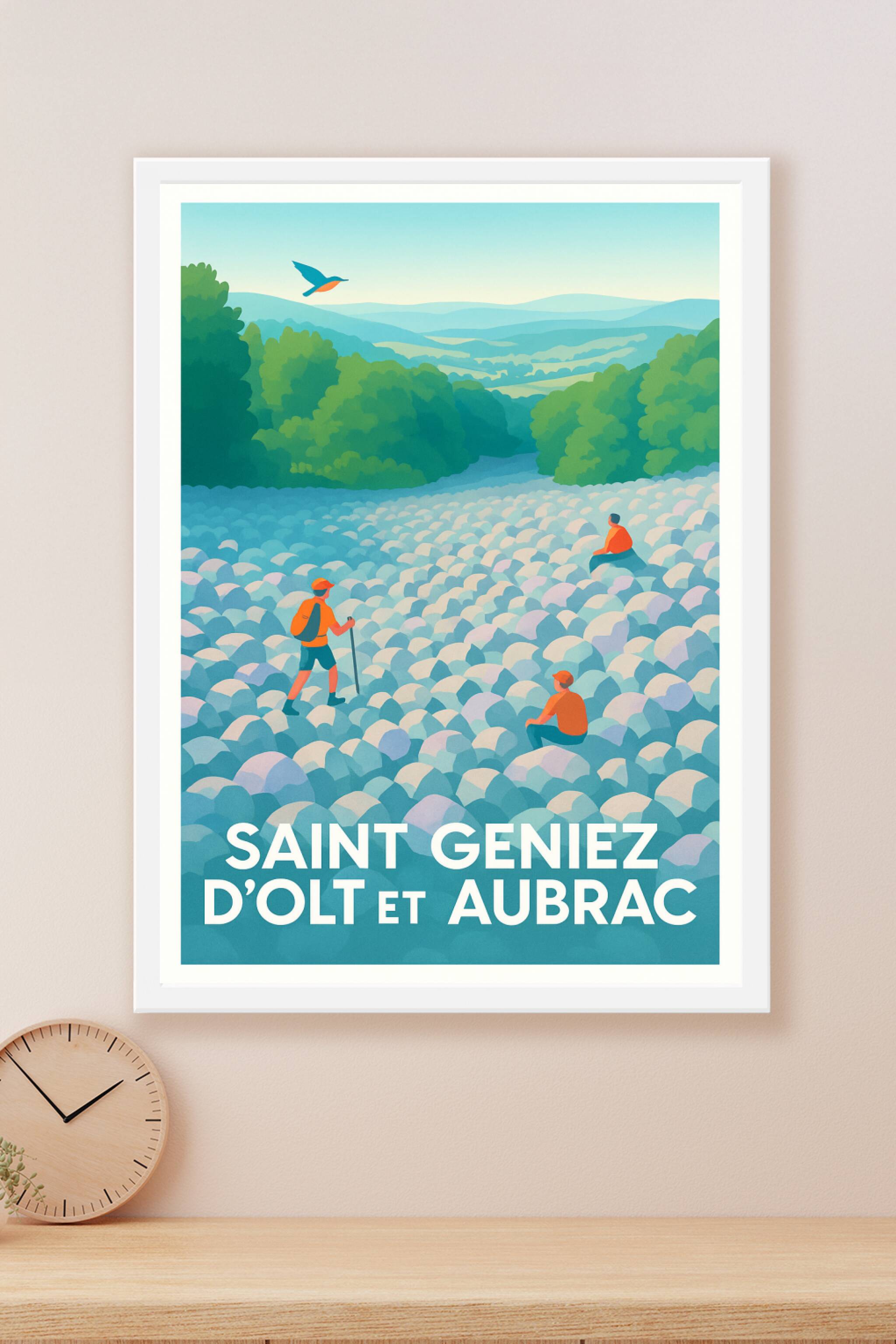 Découvrez la sérénité des paysages vallonnés et des rivières rocailleuses de Saint Geniez d'Olt et Aubrac à travers cette affiche illustrée au styl...