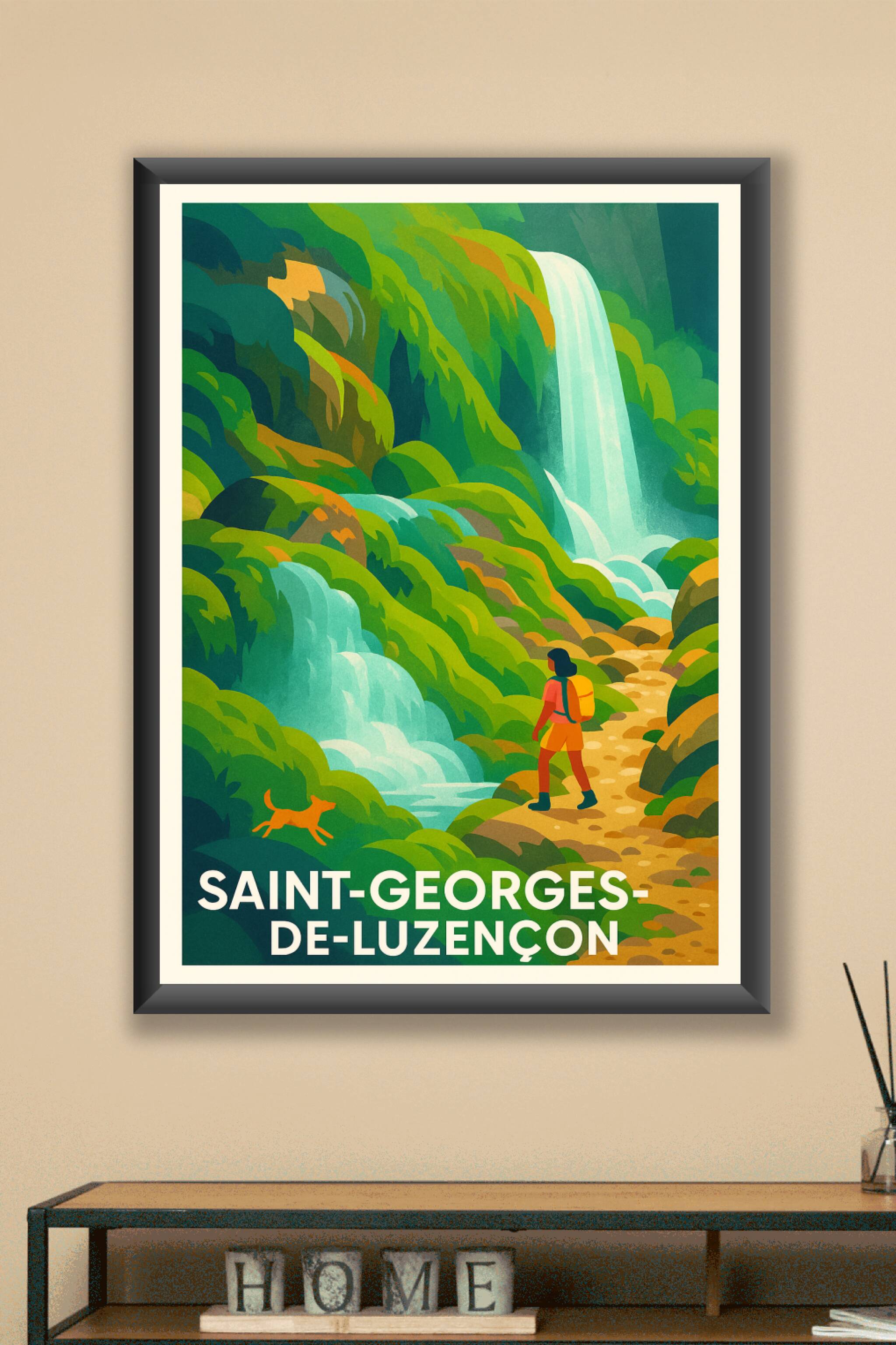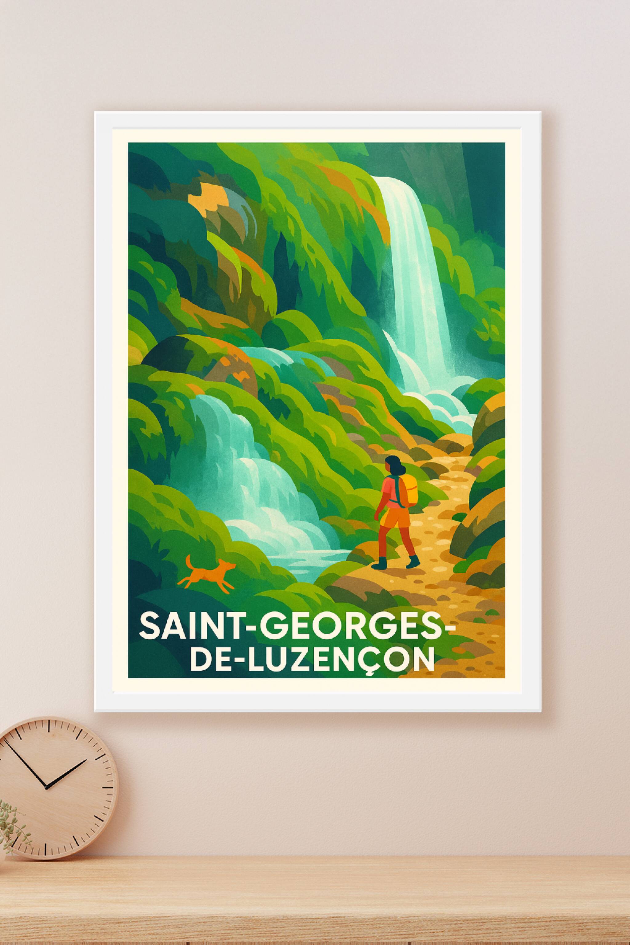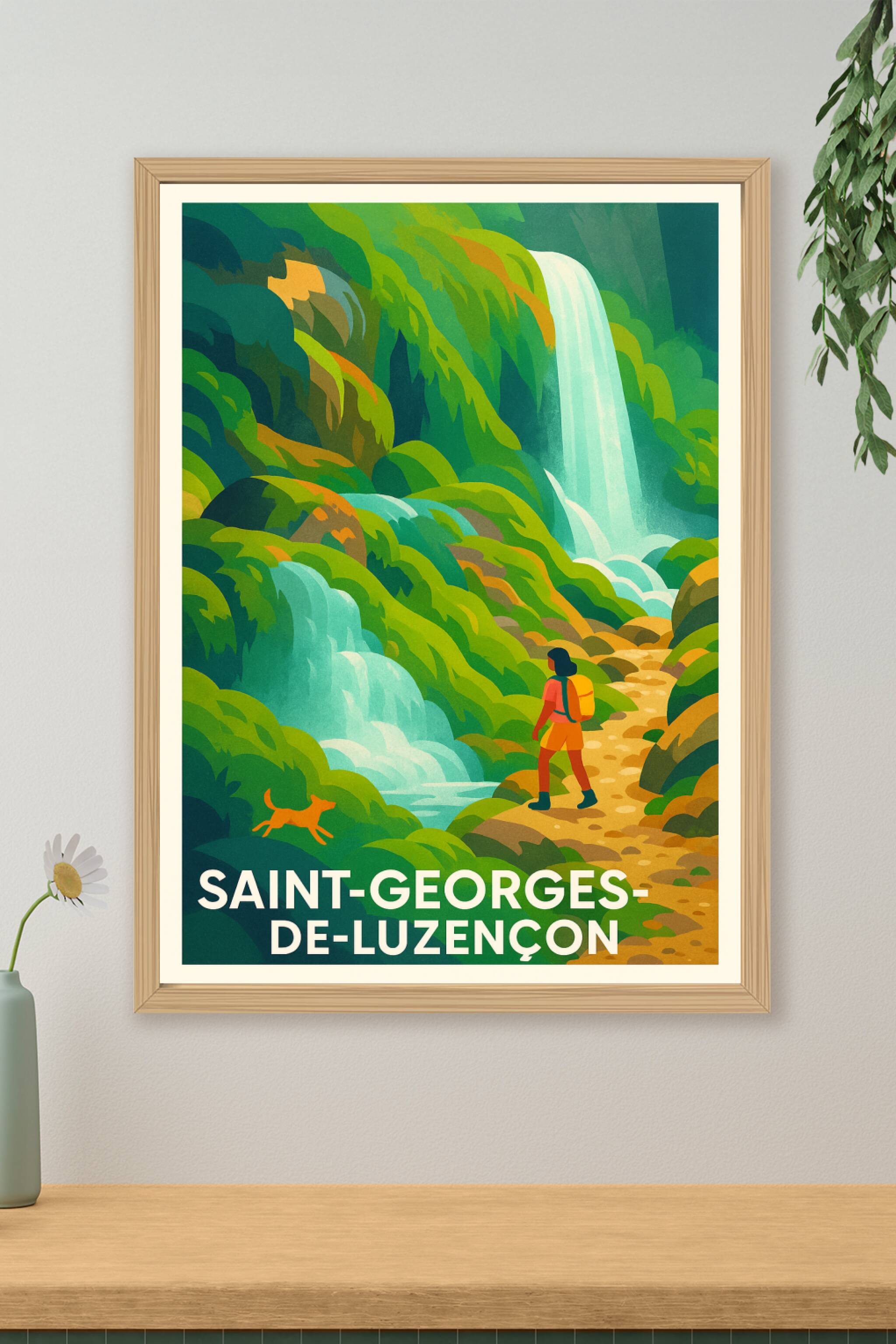 Découvrez la beauté sauvage de Saint-Georges-de-Luzençon avec cette affiche illustrée mettant en scène une randonnée au cœur d'une nature luxuriant...