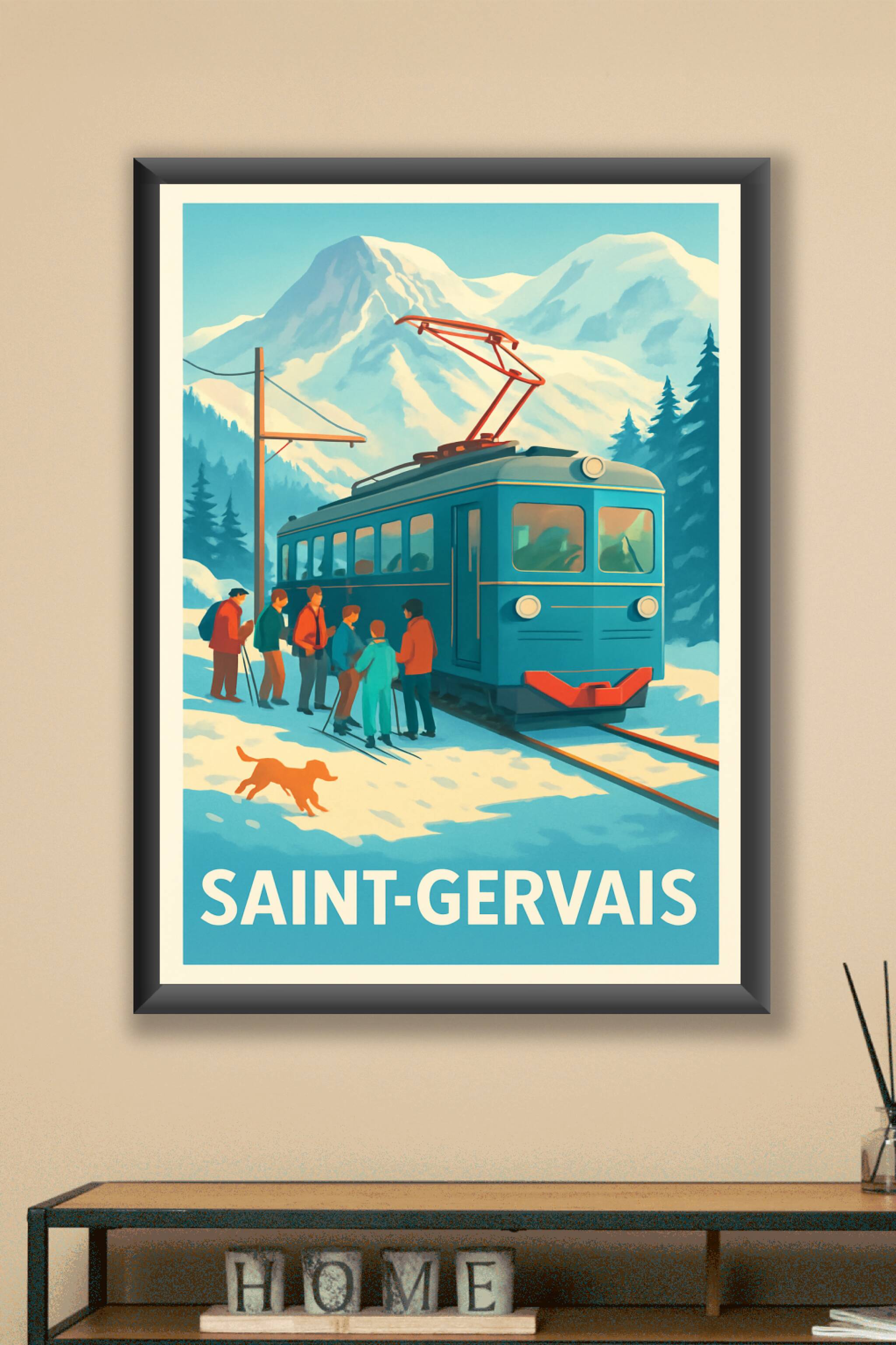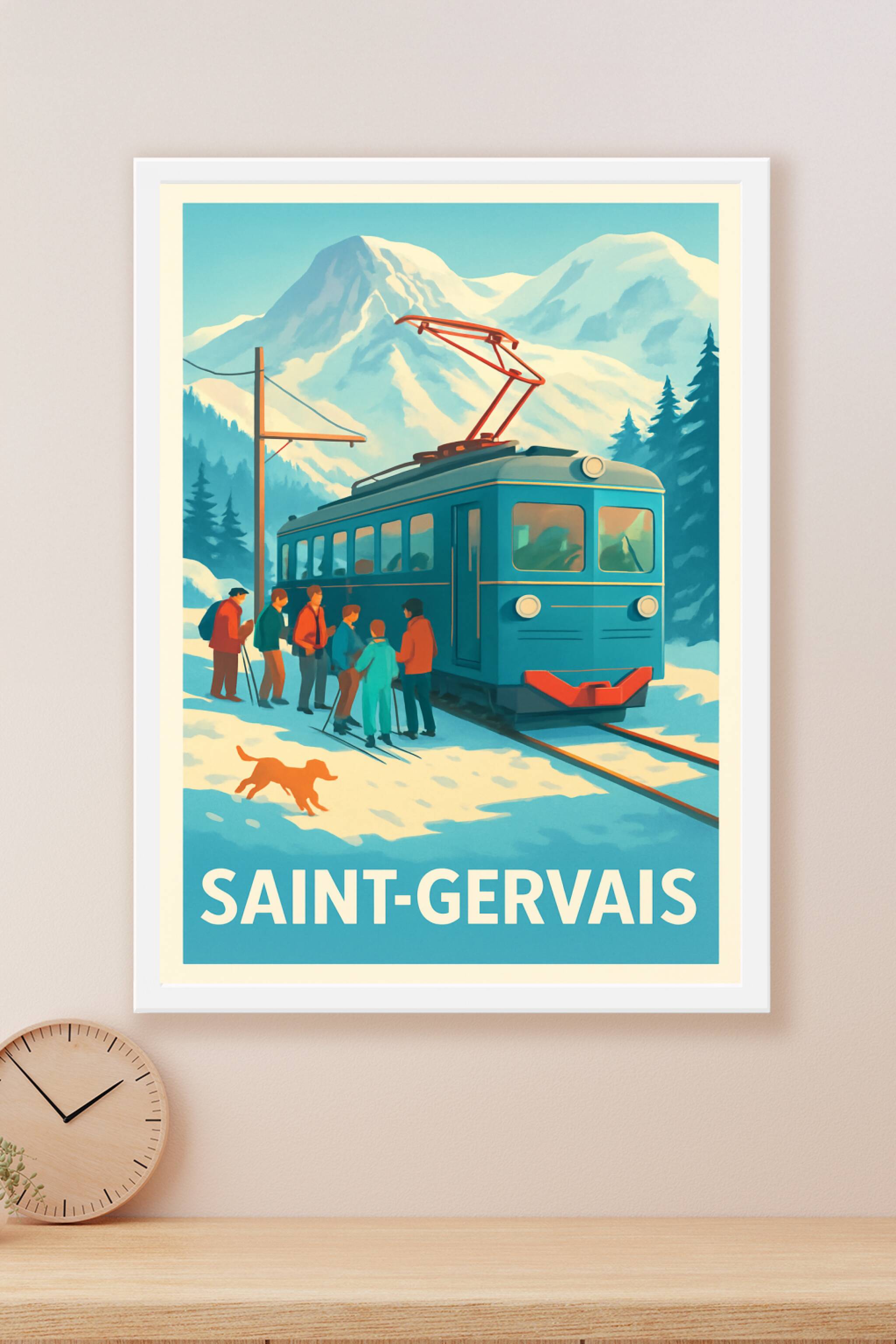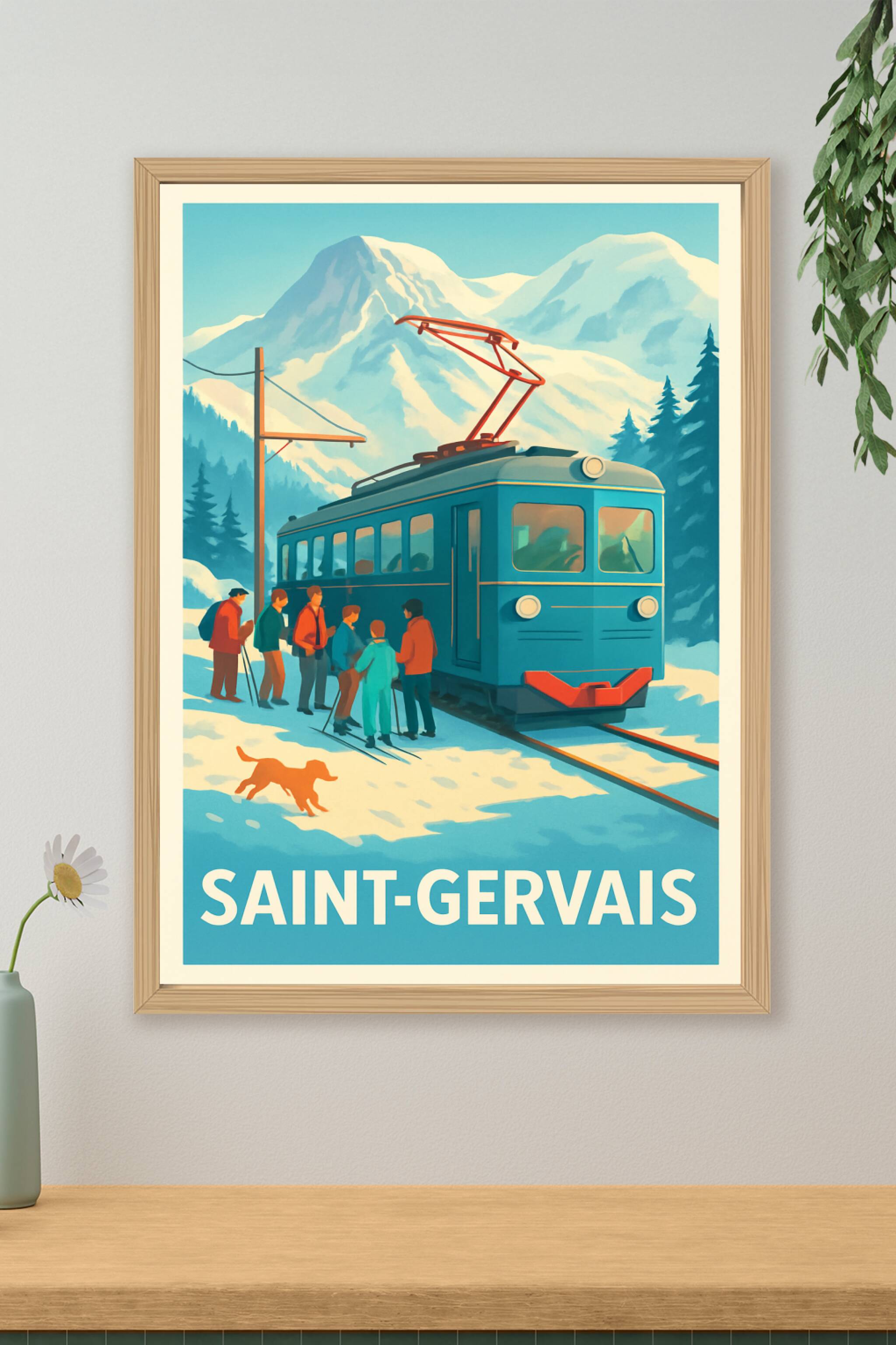 Découvrez la magie des Alpes avec cette affiche vintage représentant un train bleu emblématique traversant la neige à Saint-Gervais, entouré de ski...