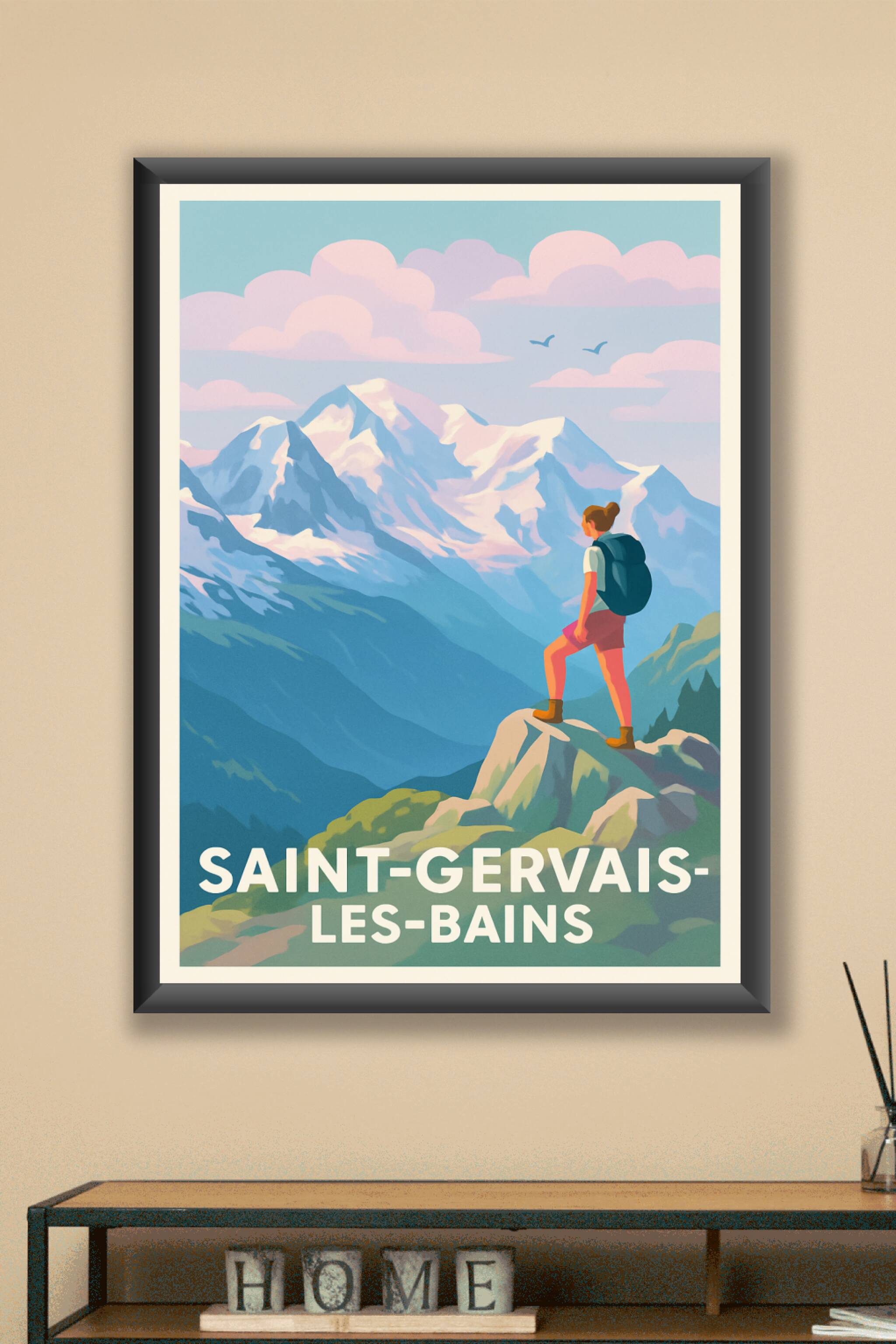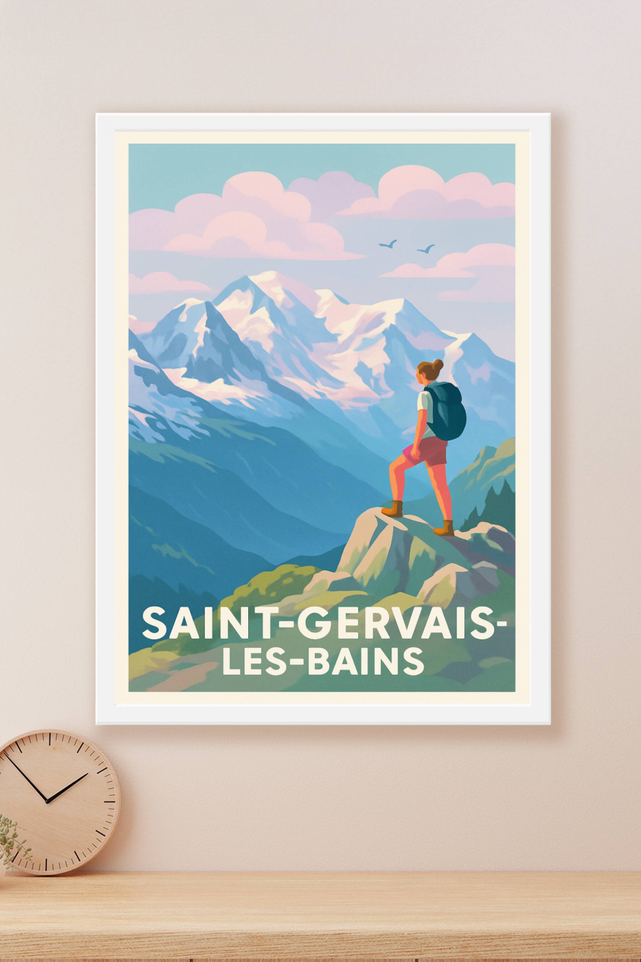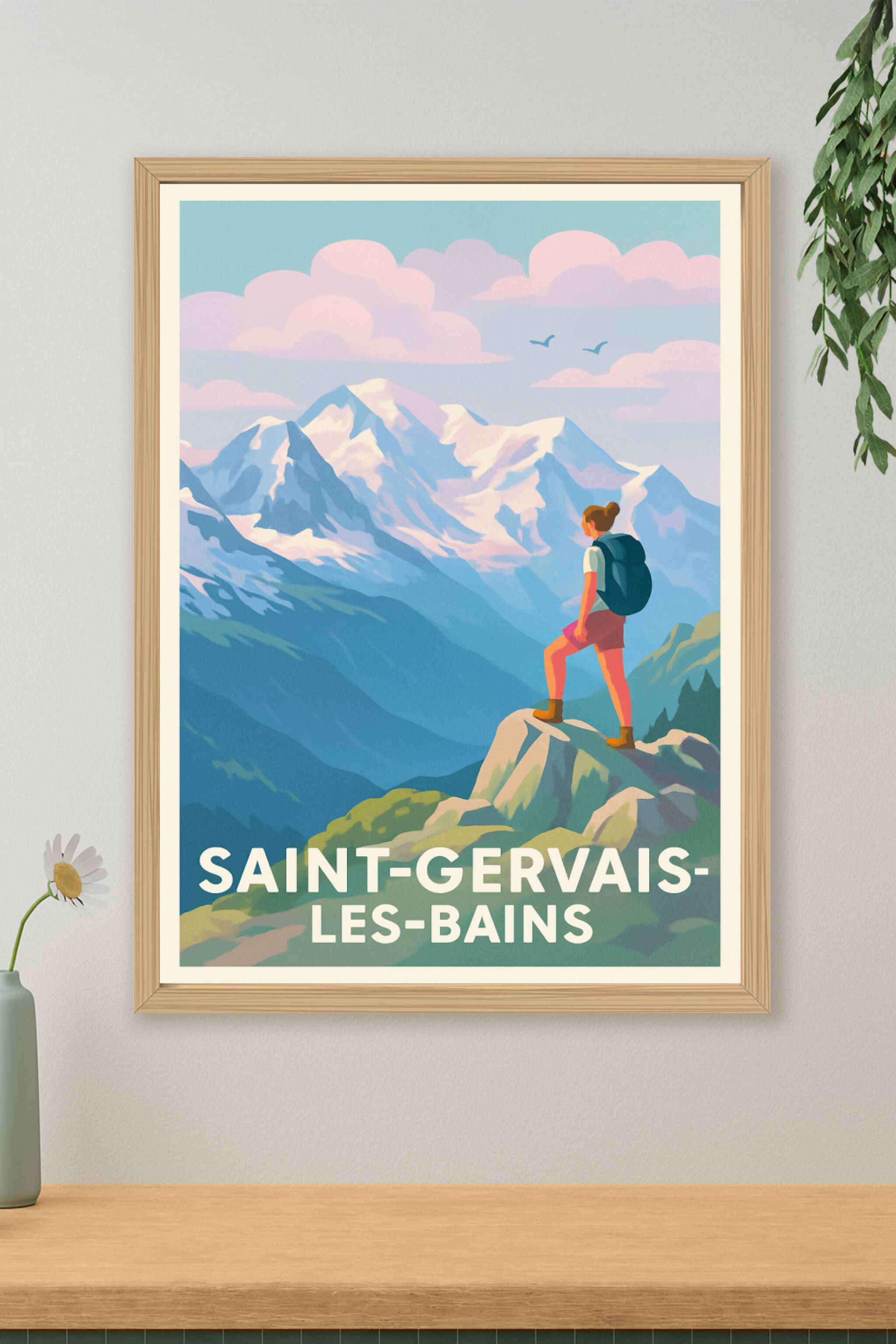Découvrez l'atmosphère inspirante de Saint-Gervais-les-Bains à travers cette affiche d'exception illustrant un randonneur face aux montagnes enneig...
