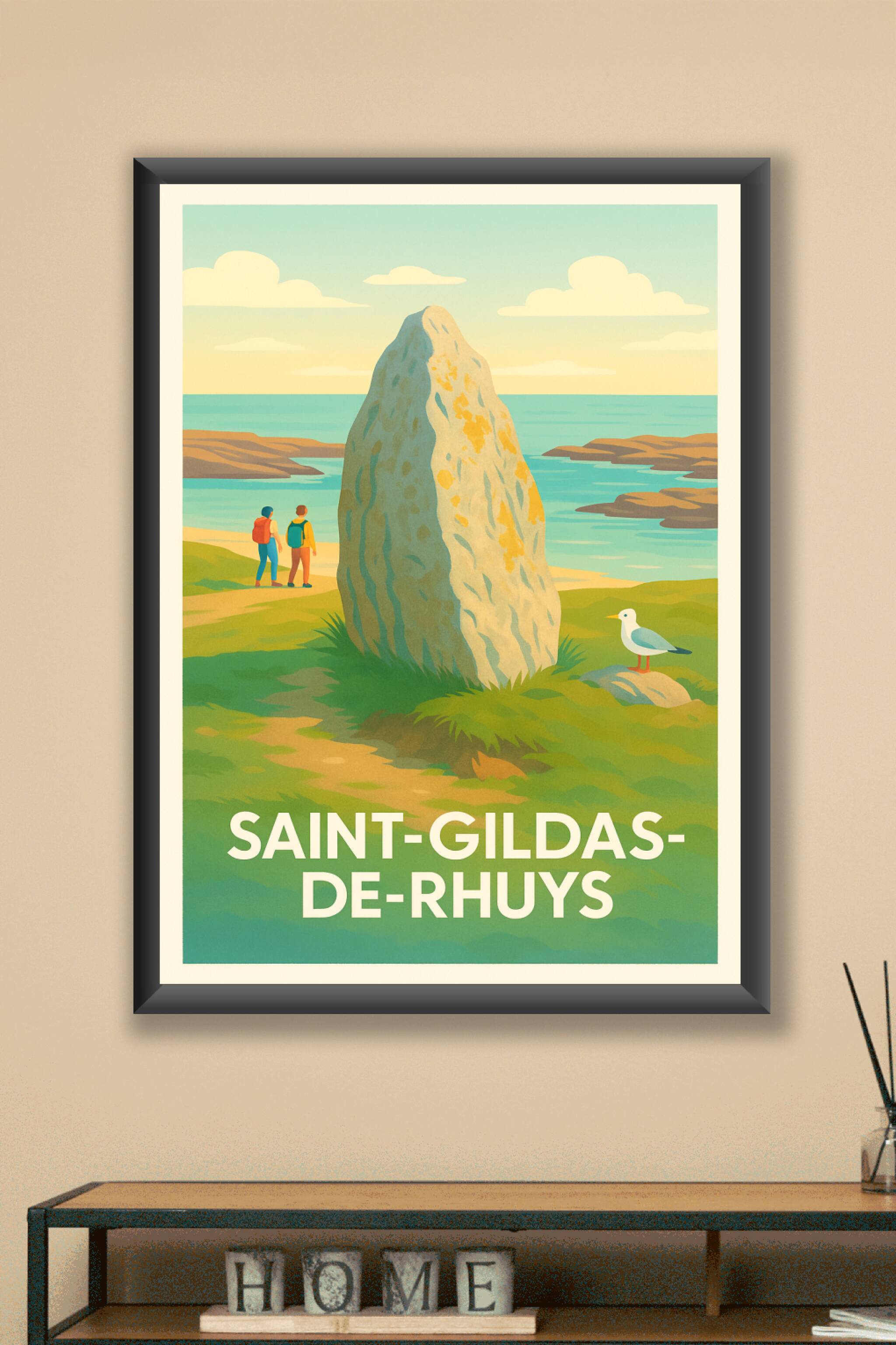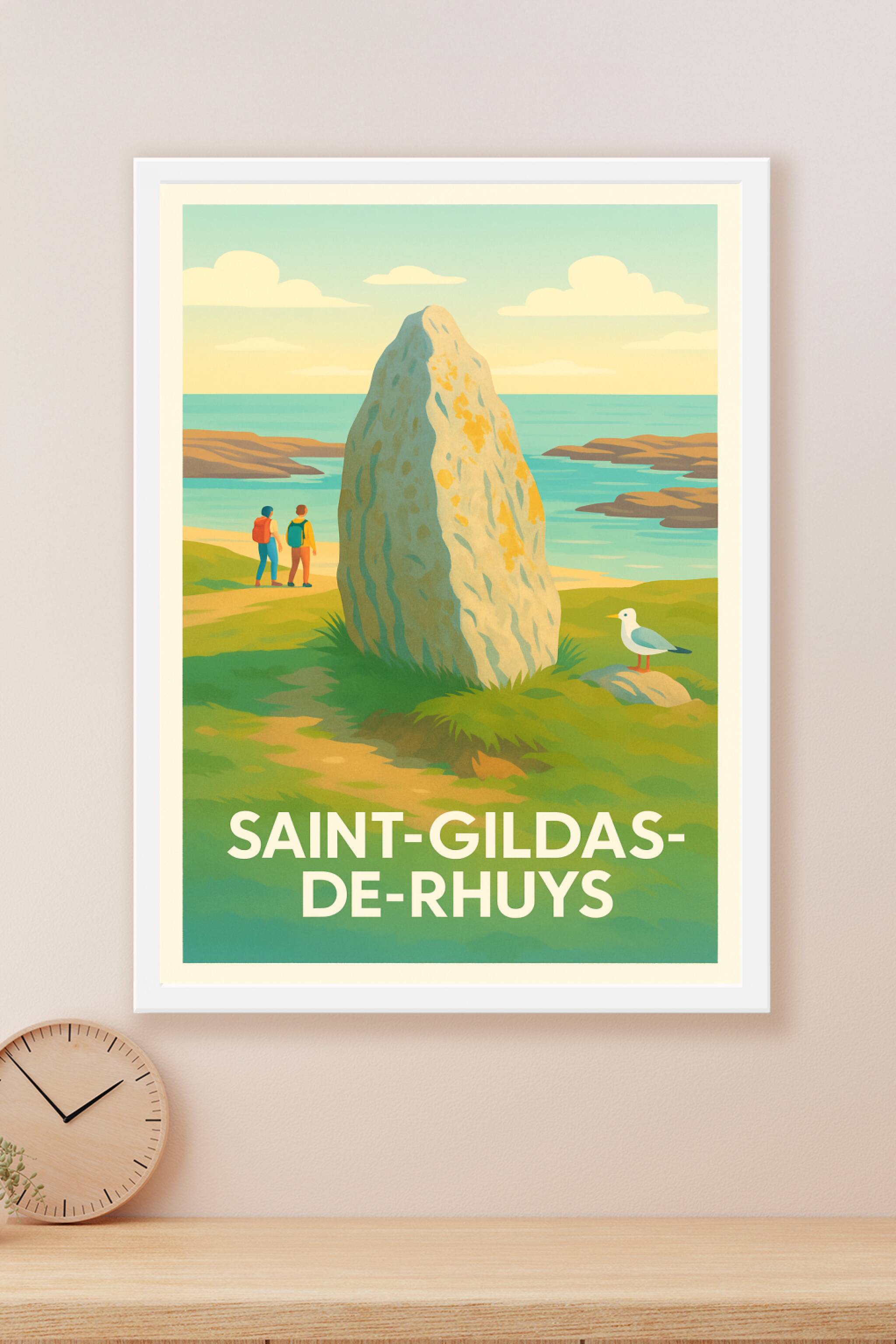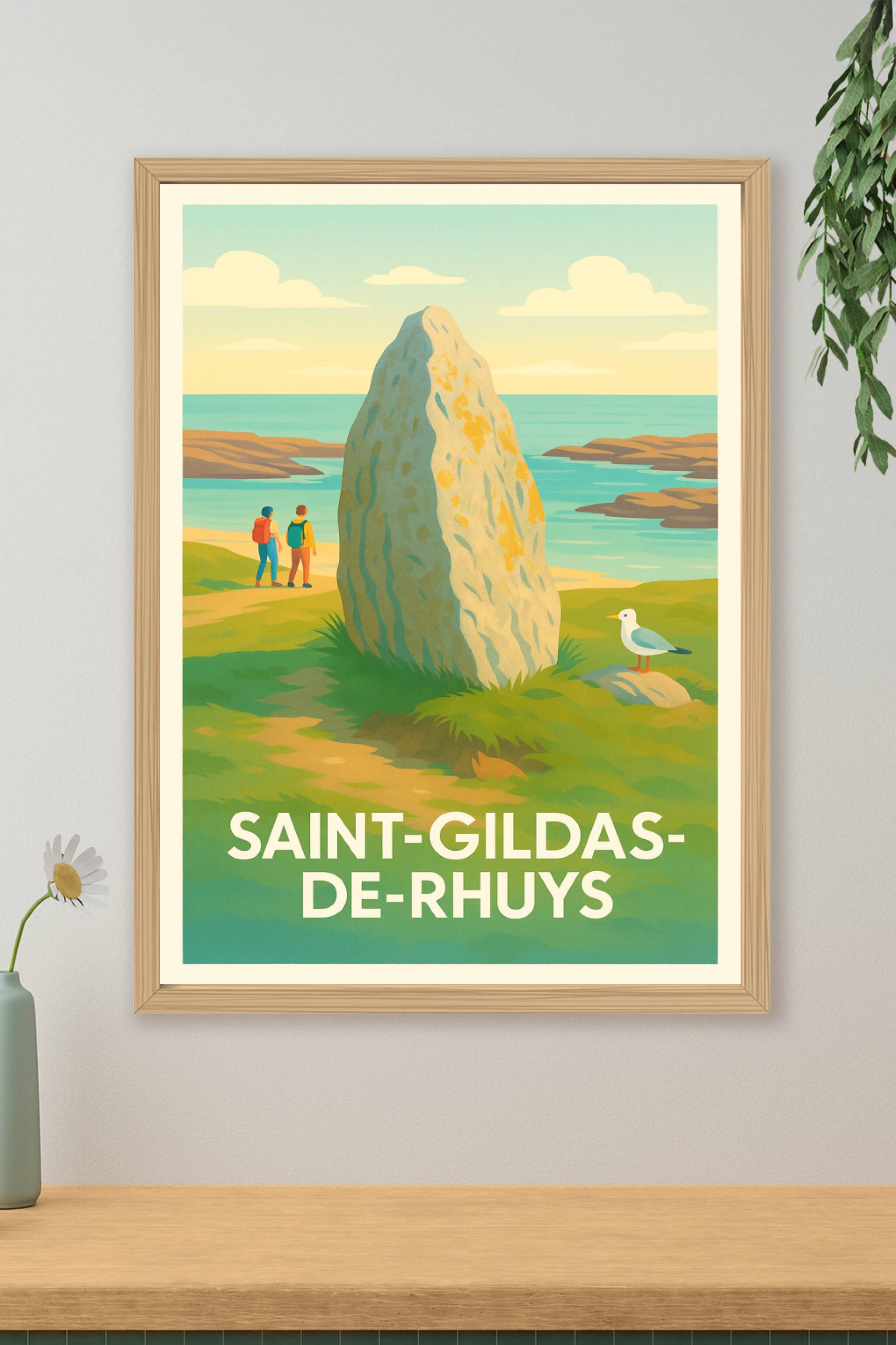 Découvrez la sérénité et la beauté sauvage de Saint-Gildas-de-Rhuys avec cette affiche au style vintage qui met en valeur les paysages côtiers et l...