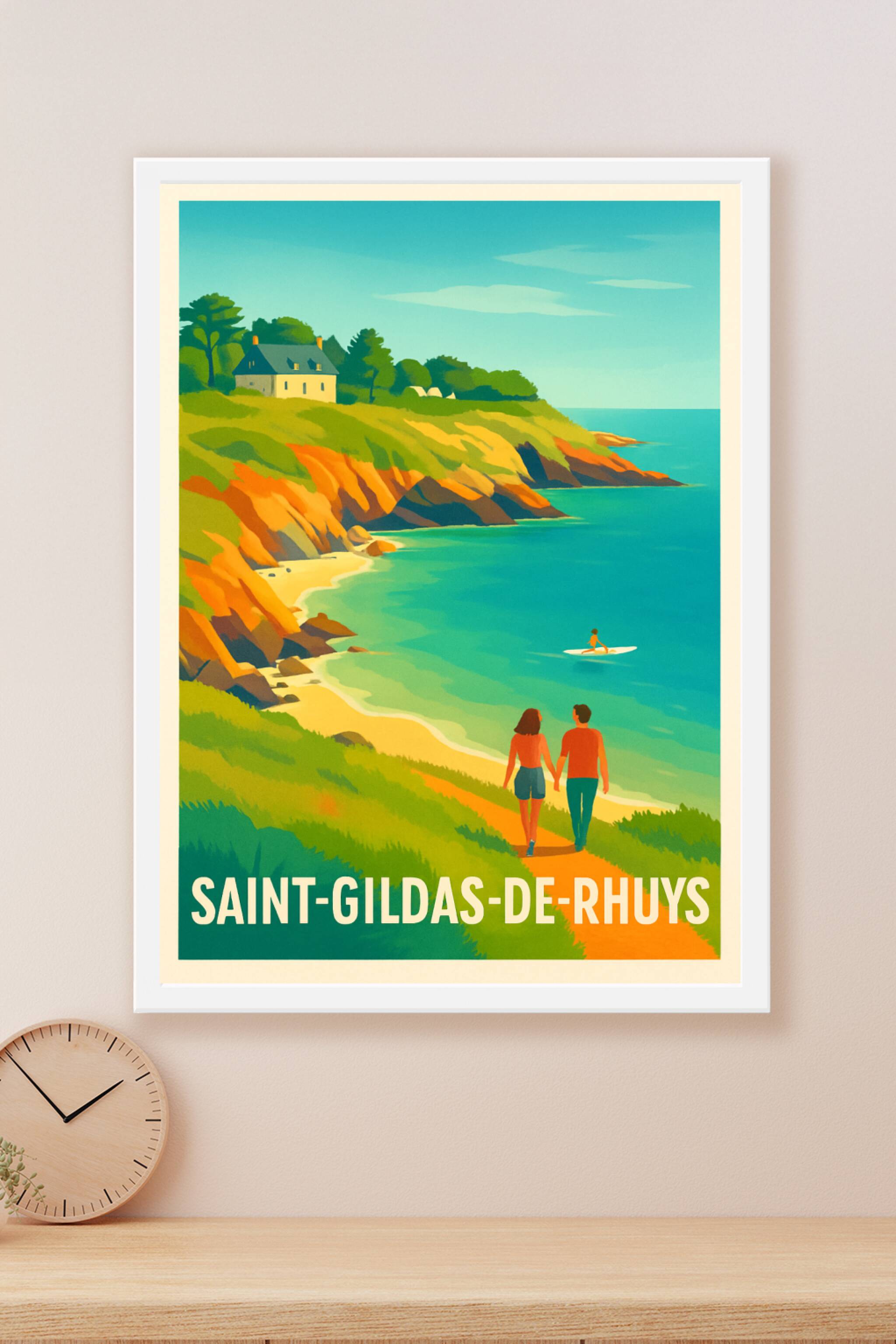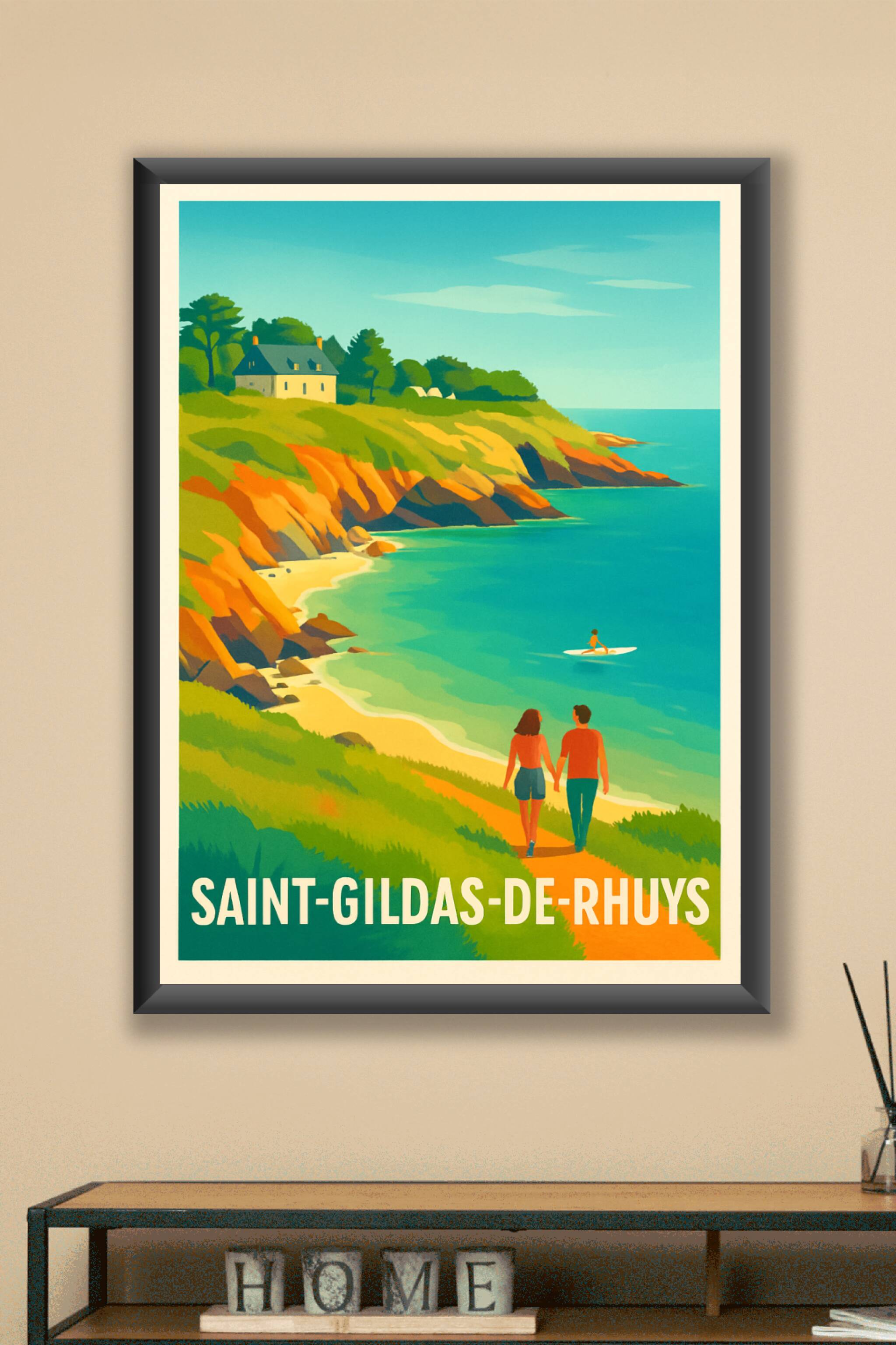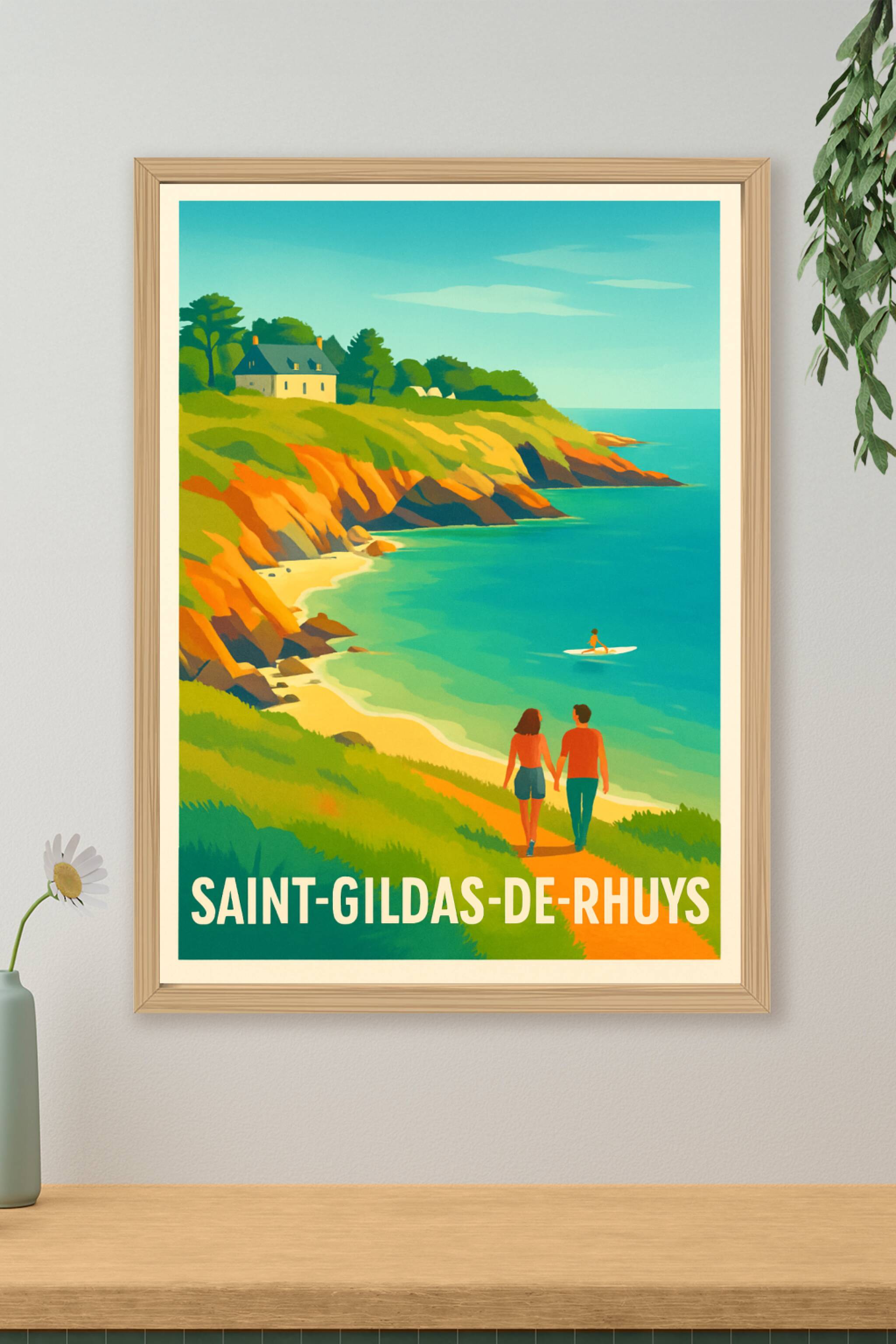 Découvrez la beauté sauvage de la côte bretonne avec cette affiche vintage illustrant un couple se promenant le long du sentier côtier de Saint-Gildas-de-Rhuys. Les falaises ocres contrastent magnifiquement avec l'eau turquoise et le ciel azur, symbolisant une escapade pleine de douceur et de sérénité.Cette affiche est imprimée en tirage "Fine Art" sur papier 305g coton pour une qualité d'impression exceptionnelle, fidèle aux couleurs éclatantes et aux détails précis de l'illustration. Disponible en formats A1 à A4, avec ou sans cadre, ce poster apportera une touche artistique et apaisante à votre intérieur, parfaite pour les amateurs de paysages marins bretons.Prolongez l'évasion avec un tirage premium 100% fabriqué en France, idéal pour décorer votre salon, bureau ou chambre, ou offrir un cadeau authentique et raffiné.