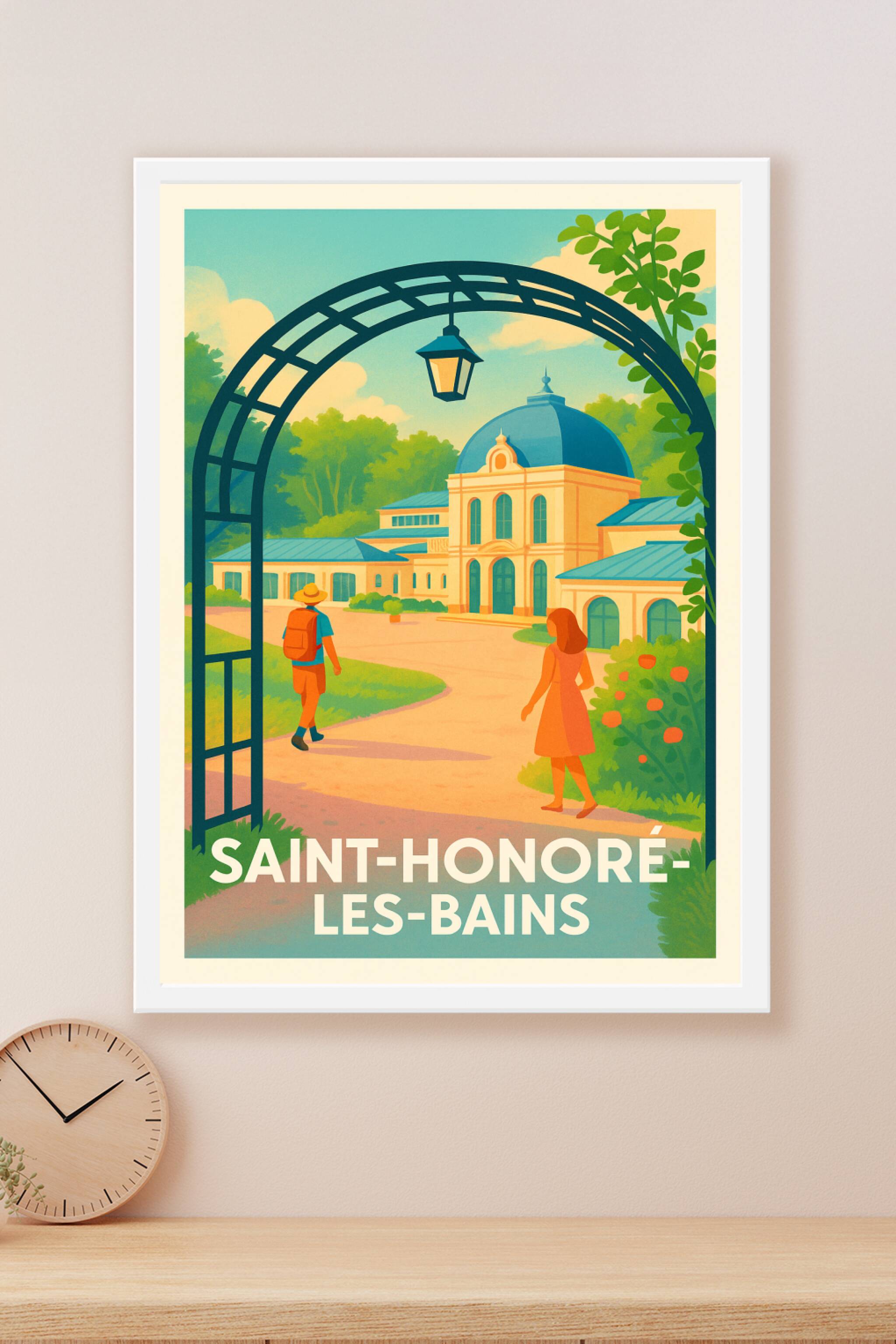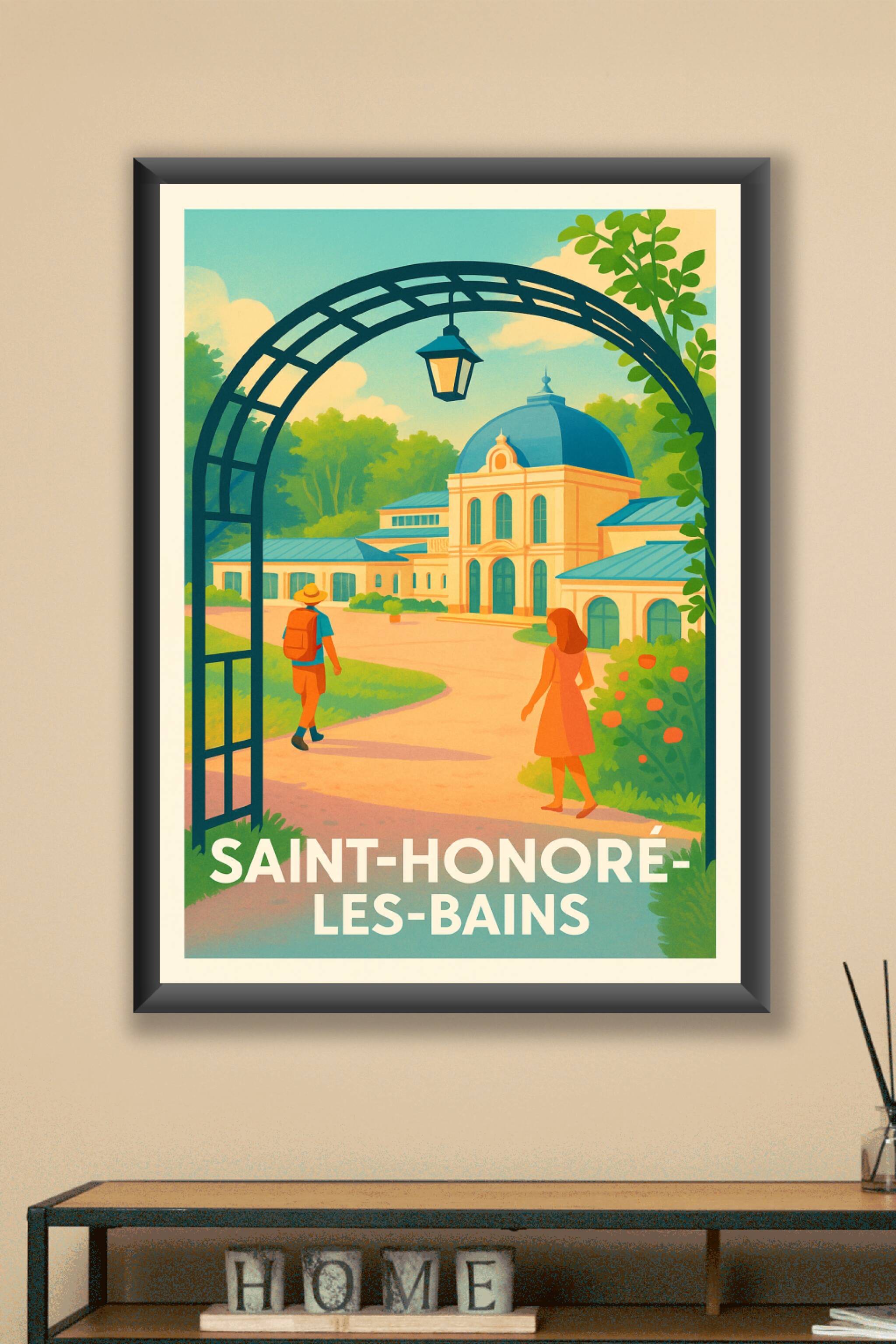Laissez-vous séduire par le charme raffiné de Saint-Honoré-les-Bains, immortalisé dans cette affiche illustrée aux couleurs douces et harmonieuses....