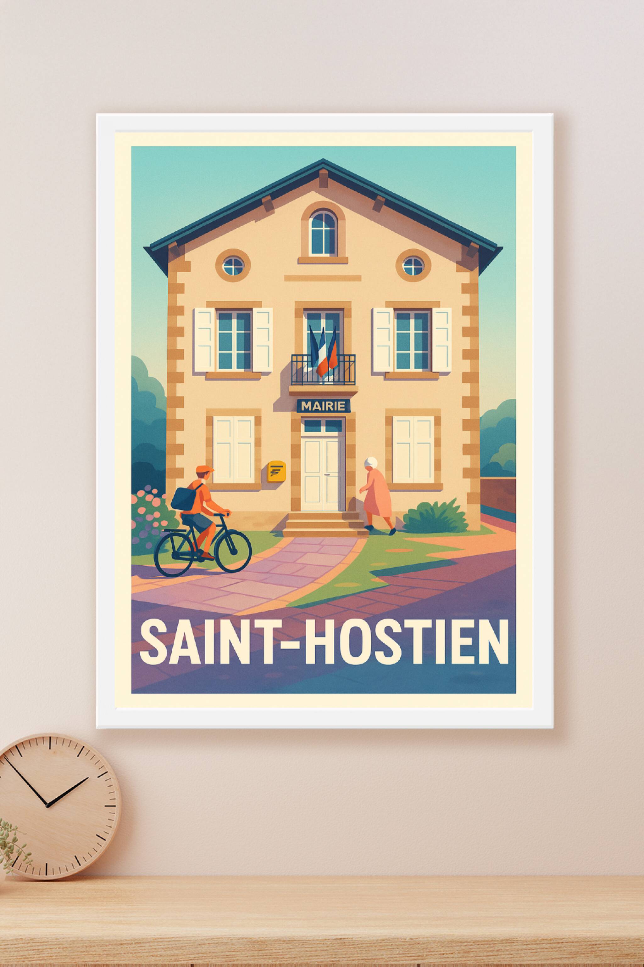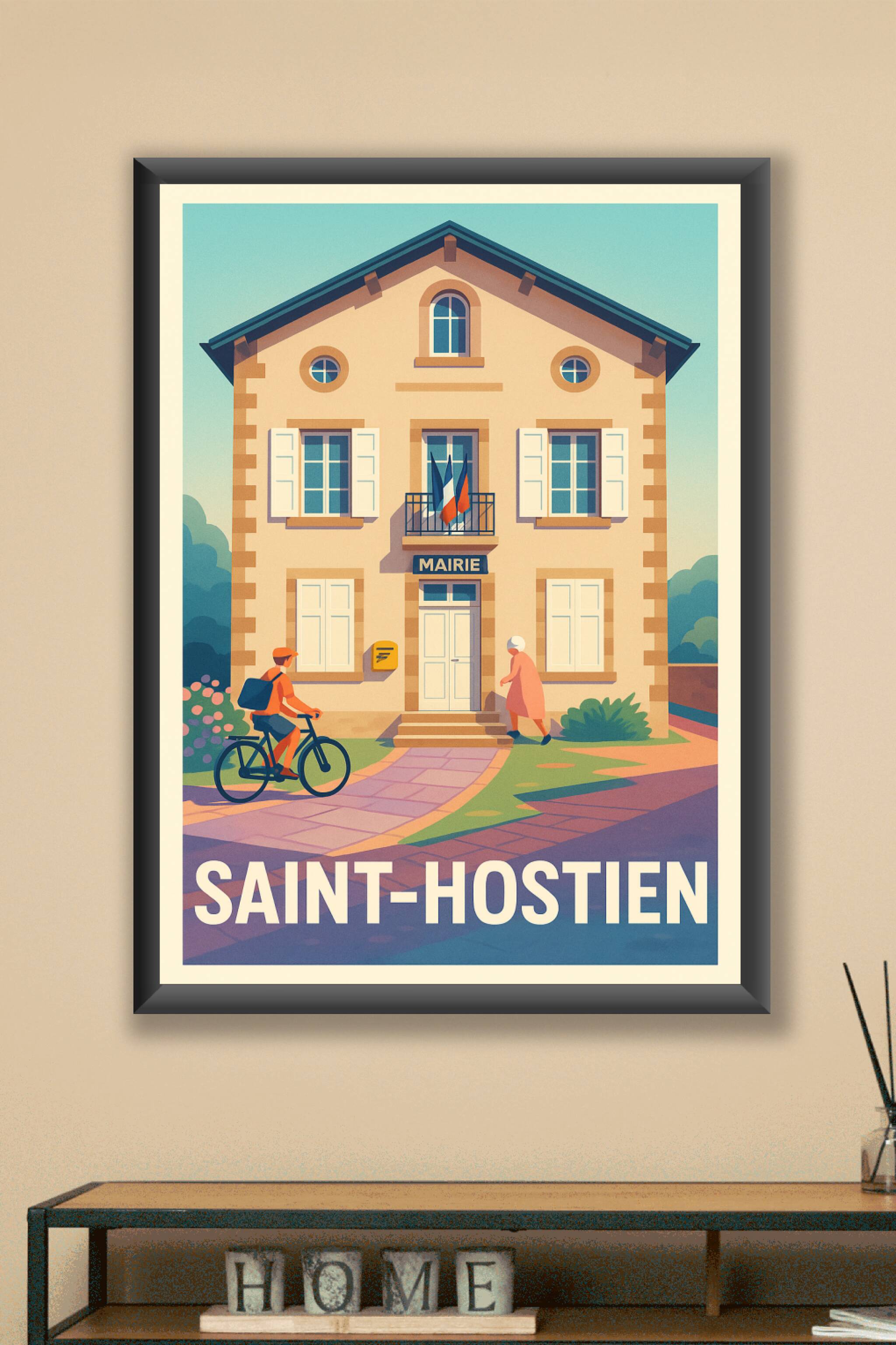 Apportez une touche de sérénité et d'authenticité à votre intérieur avec cette affiche représentant la mairie de Saint-Hostien dans une ambiance do...