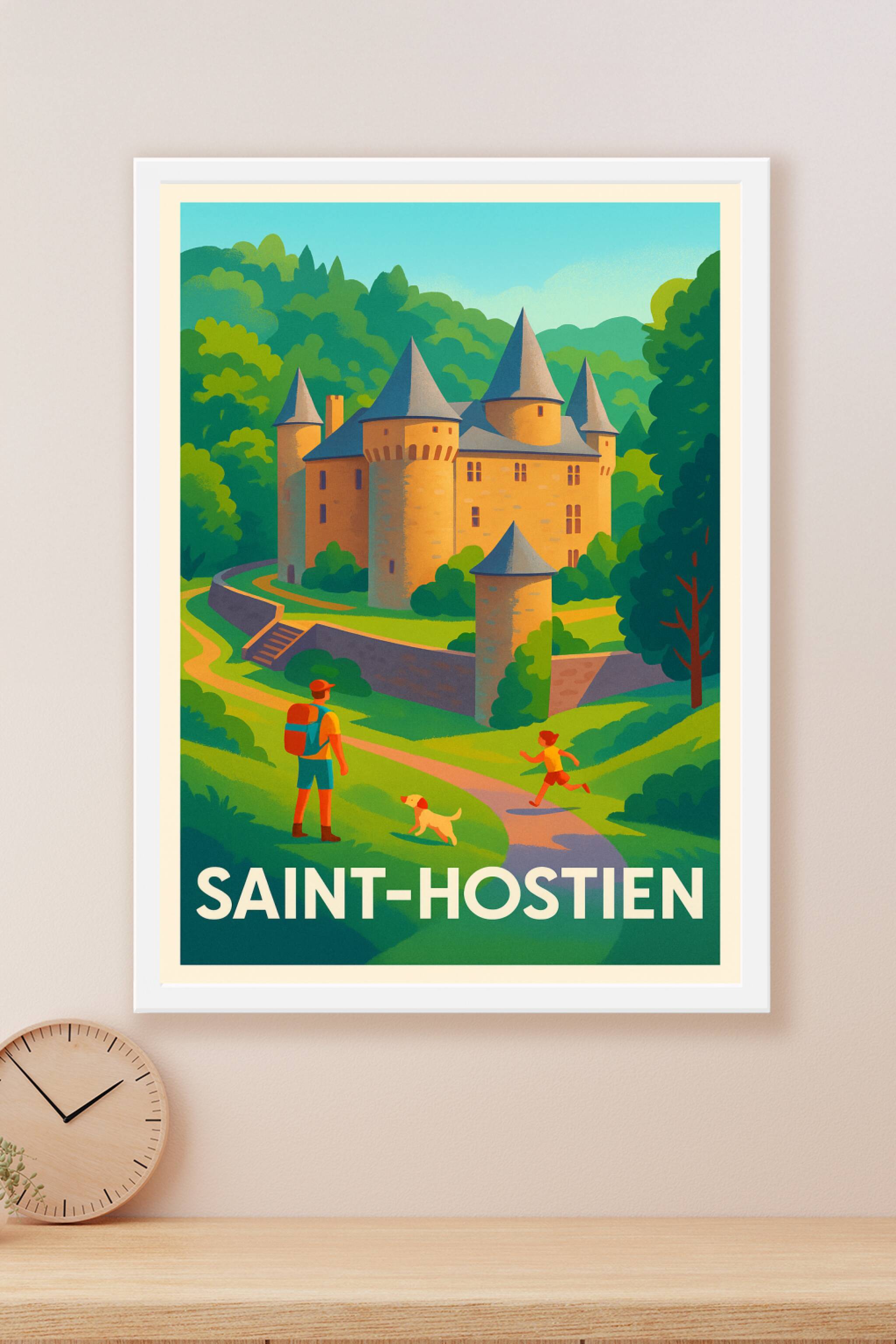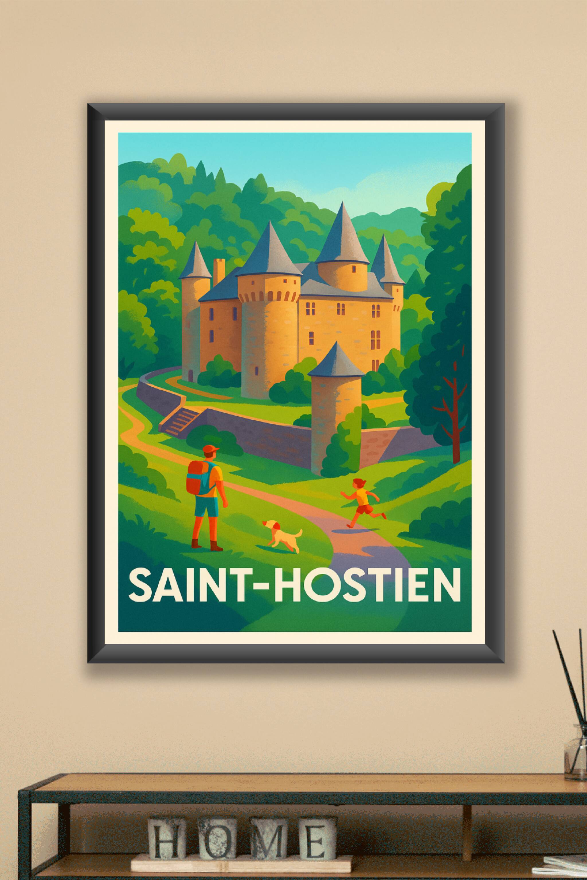 Découvrez la sérénité de Saint-Hostien à travers cette affiche au style vintage mettant en scène son château emblématique entouré de verdure luxuri...