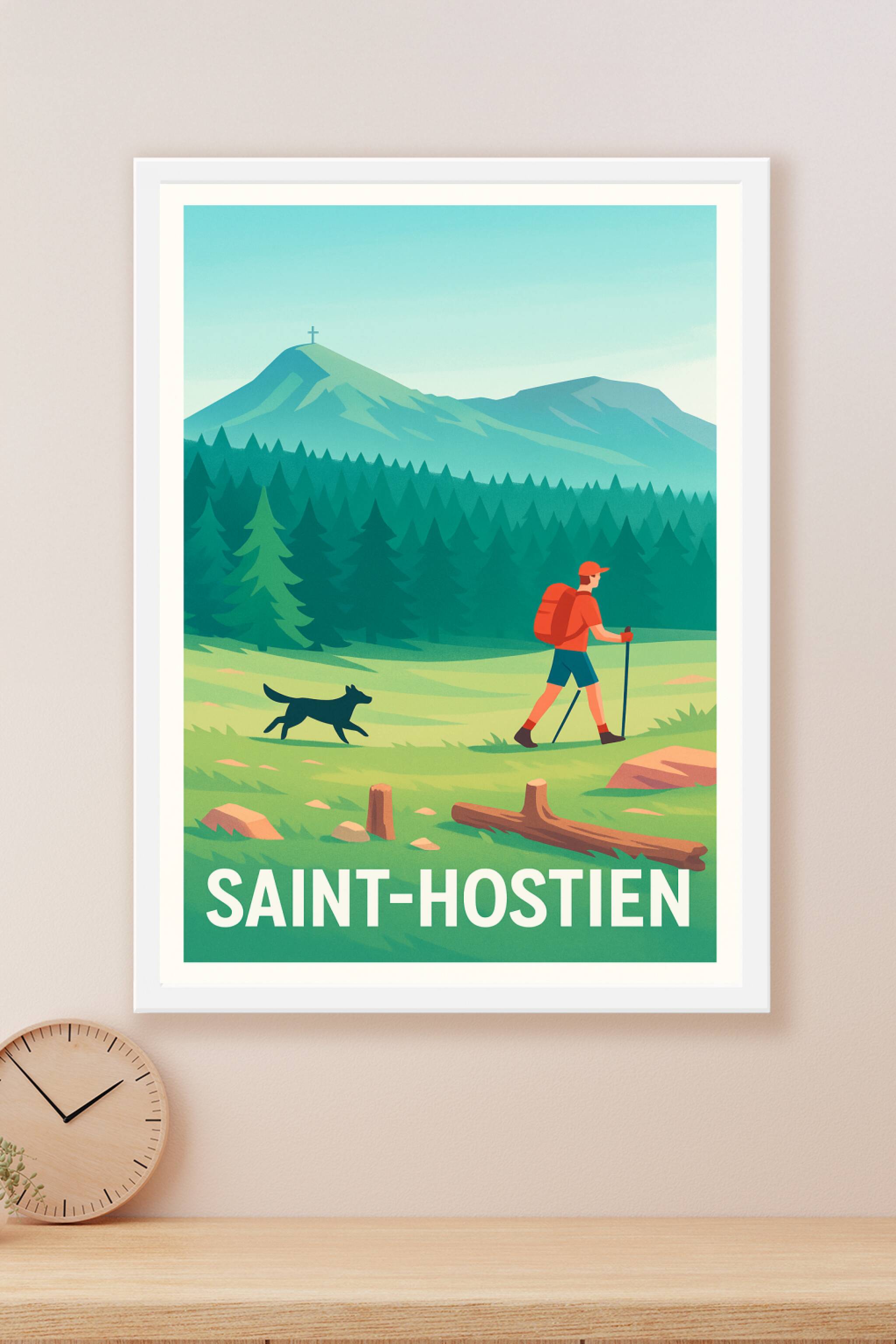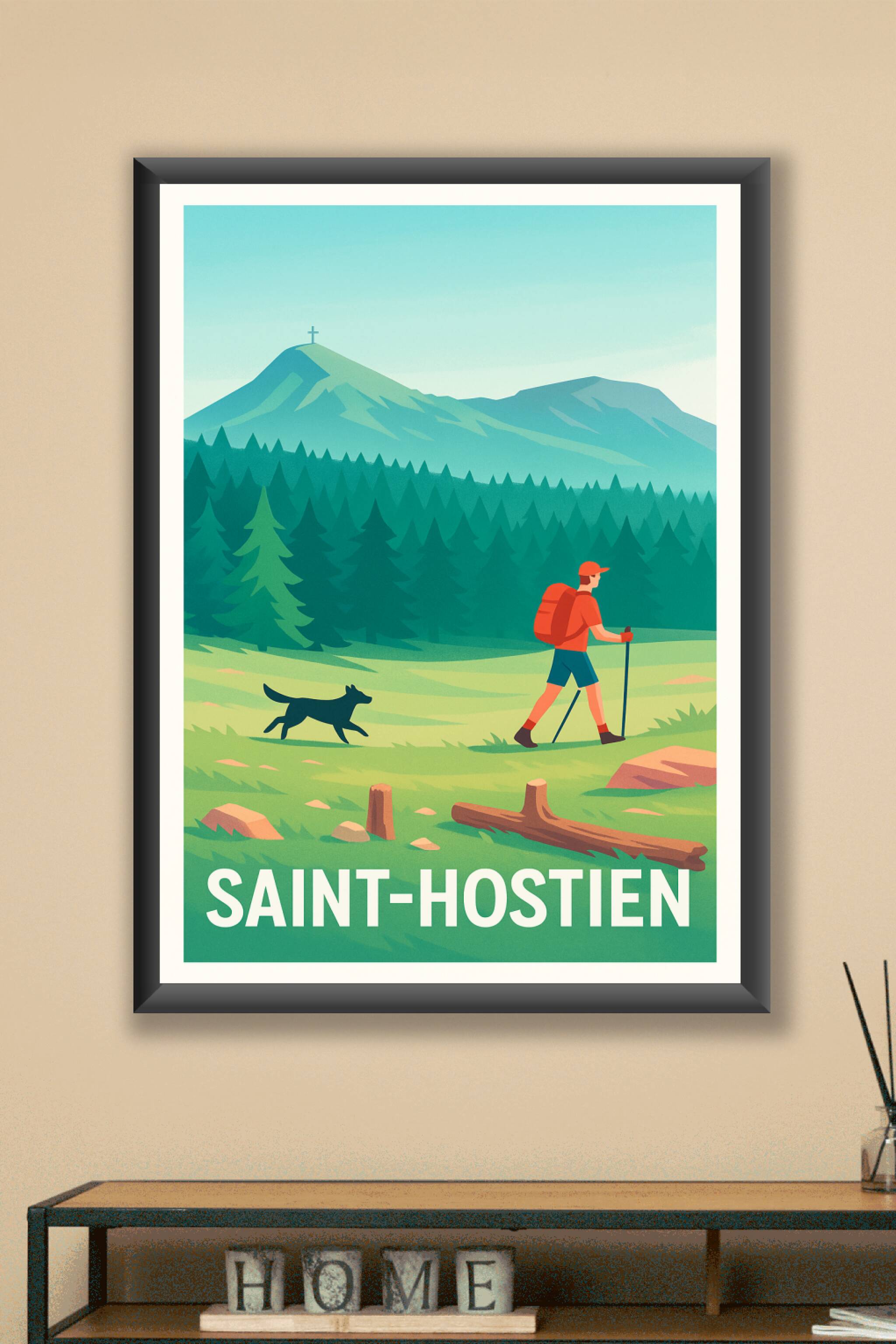 Embarquez pour une escapade pleine de sérénité avec cette affiche illustrant un randonneur accompagné de son chien dans les paysages verdoyants de Saint-Hostien, dominés par la silhouette emblématique de la montagne au sommet marqué par une croix. Ce poster invite à la découverte des grands espaces et à la douceur des balades en pleine nature.Cette affiche est proposée en tirage "Fine Art" sur papier coton 305g, garantissant une qualité d'impression exceptionnelle, aux couleurs éclatantes et durables. Disponible en formats A1 à A4, avec ou sans cadre, elle s'adapte à tous les intérieurs, qu'ils soient modernes ou plus classiques.Faites entrer un souffle d'air pur et un esprit d'aventure dans votre décoration grâce à ce poster aux finitions haut de gamme, 100% fabriqué en France.