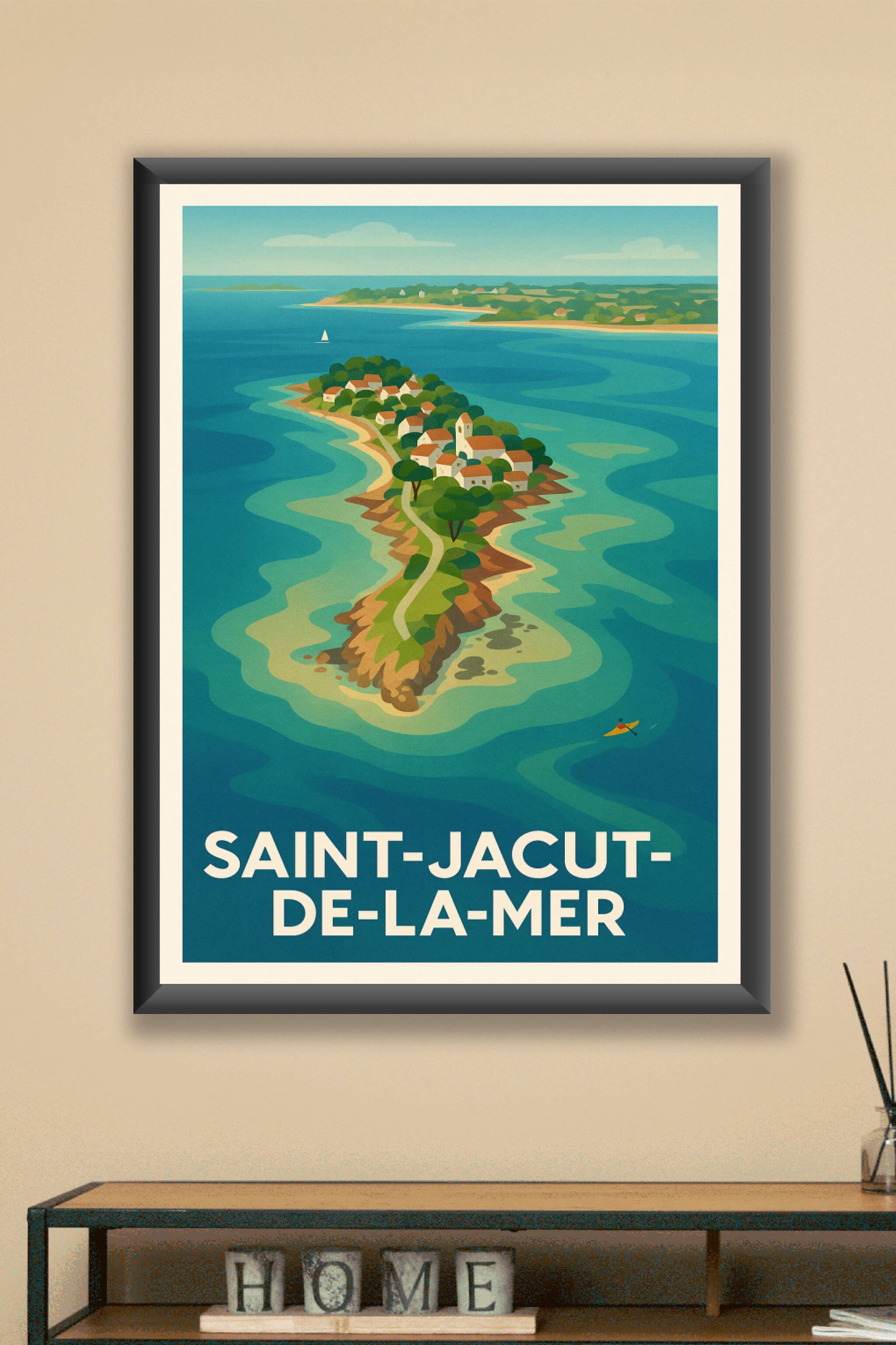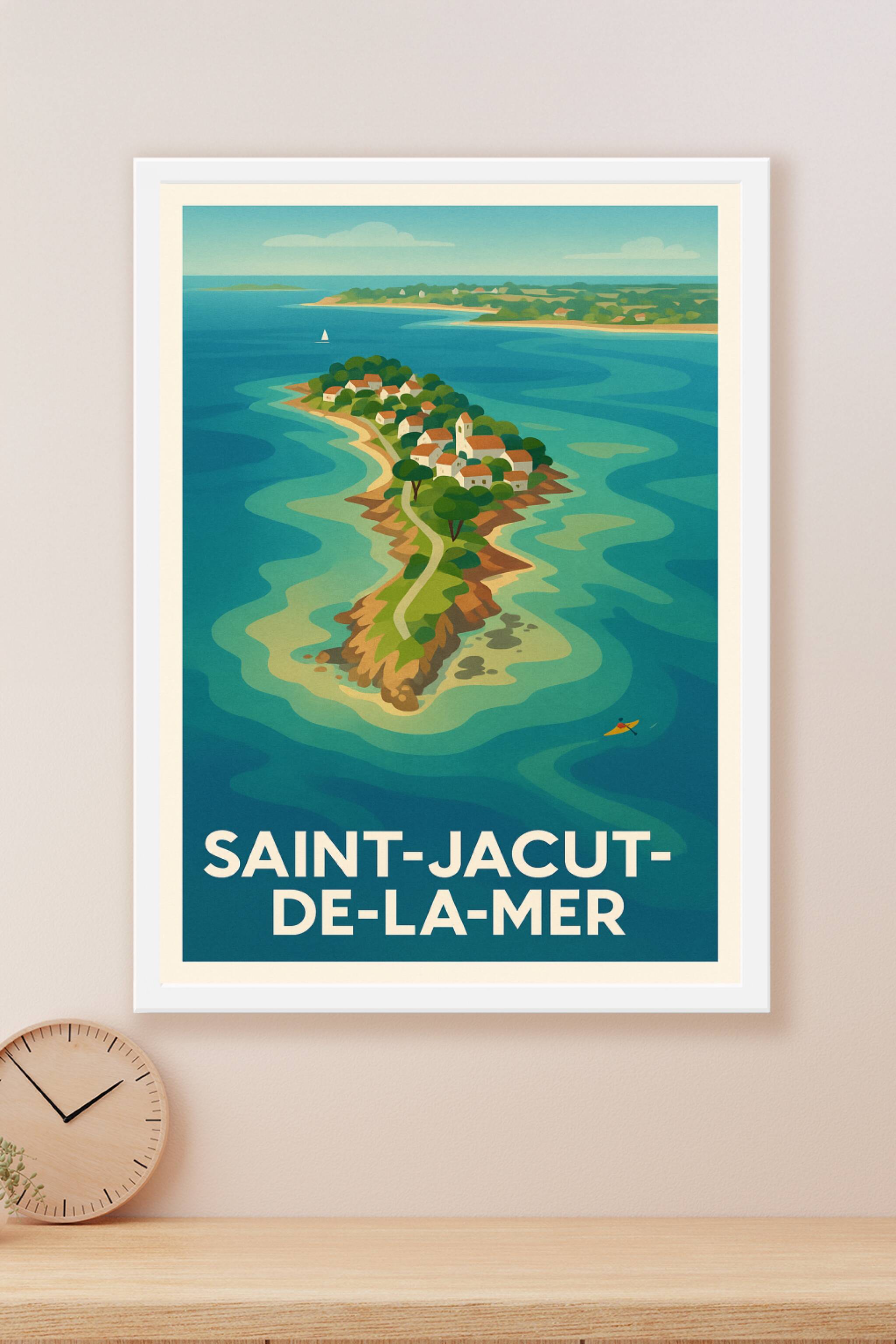 Découvrez la beauté pittoresque de Saint-Jacut-de-la-Mer avec cette affiche illustrée aux couleurs douces et aux formes harmonieuses, qui mettent e...