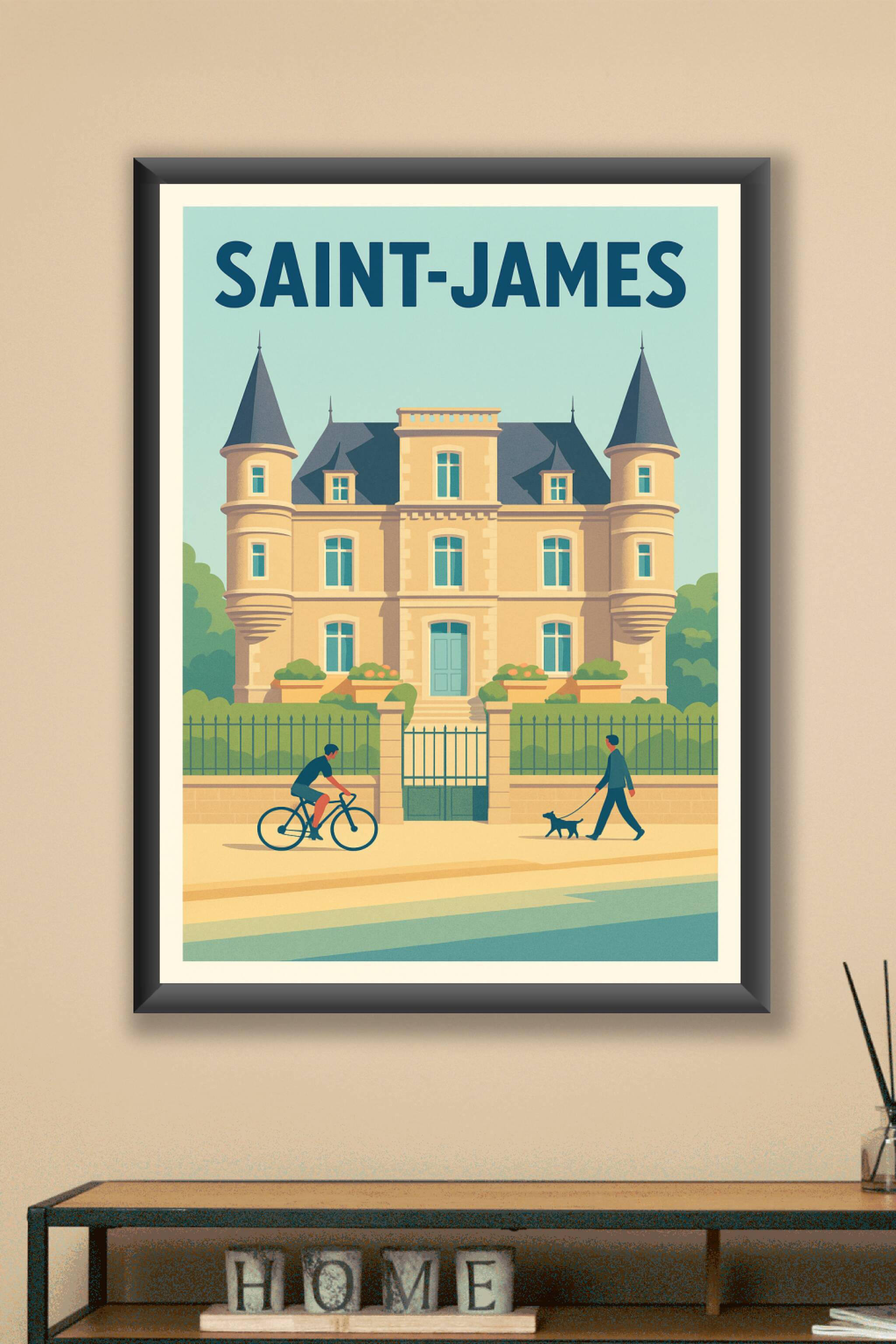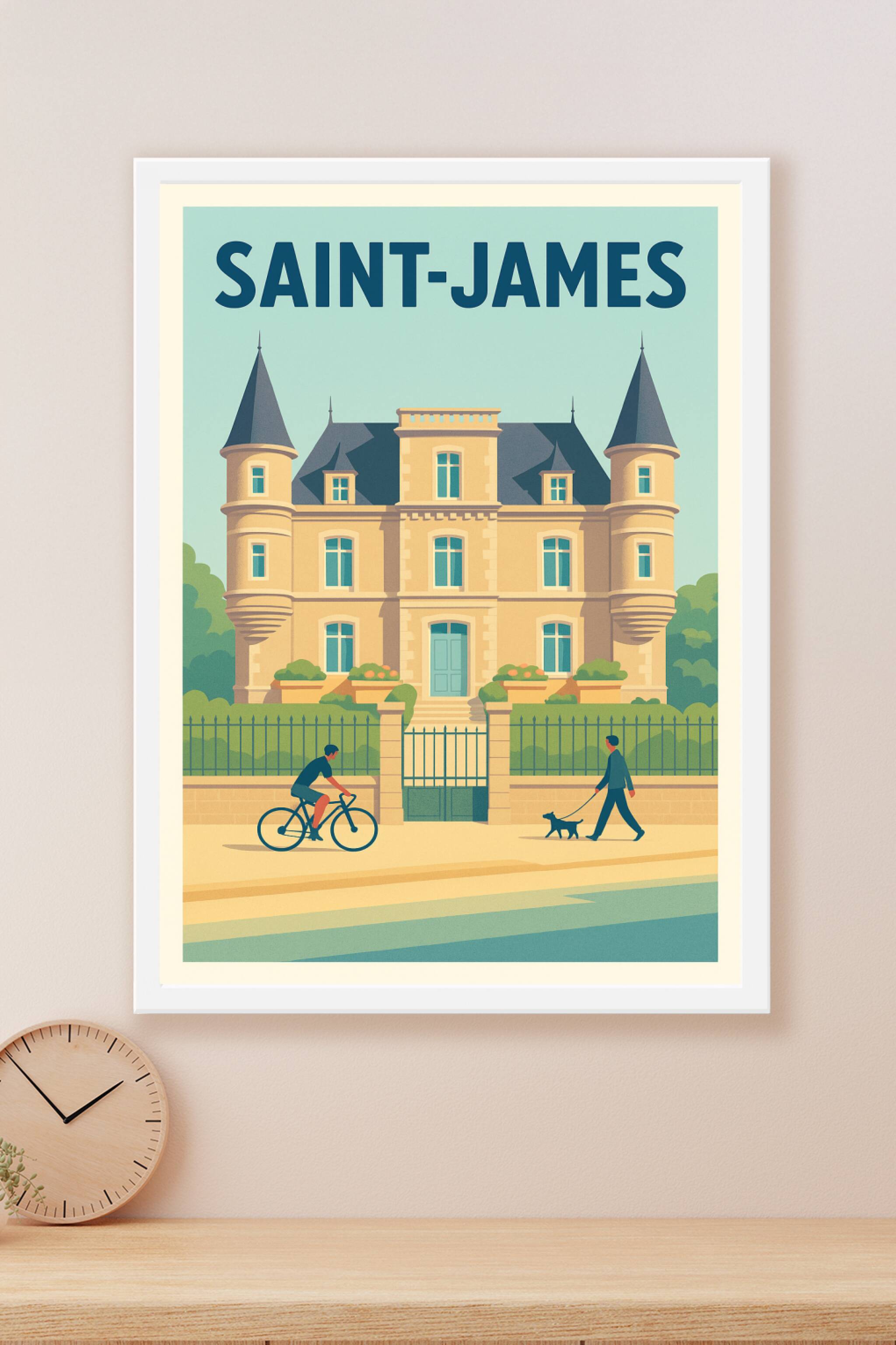 Découvrez l'élégance intemporelle de Saint-James avec cette affiche illustrée mettant en scène une belle demeure traditionnelle et ses environs pai...