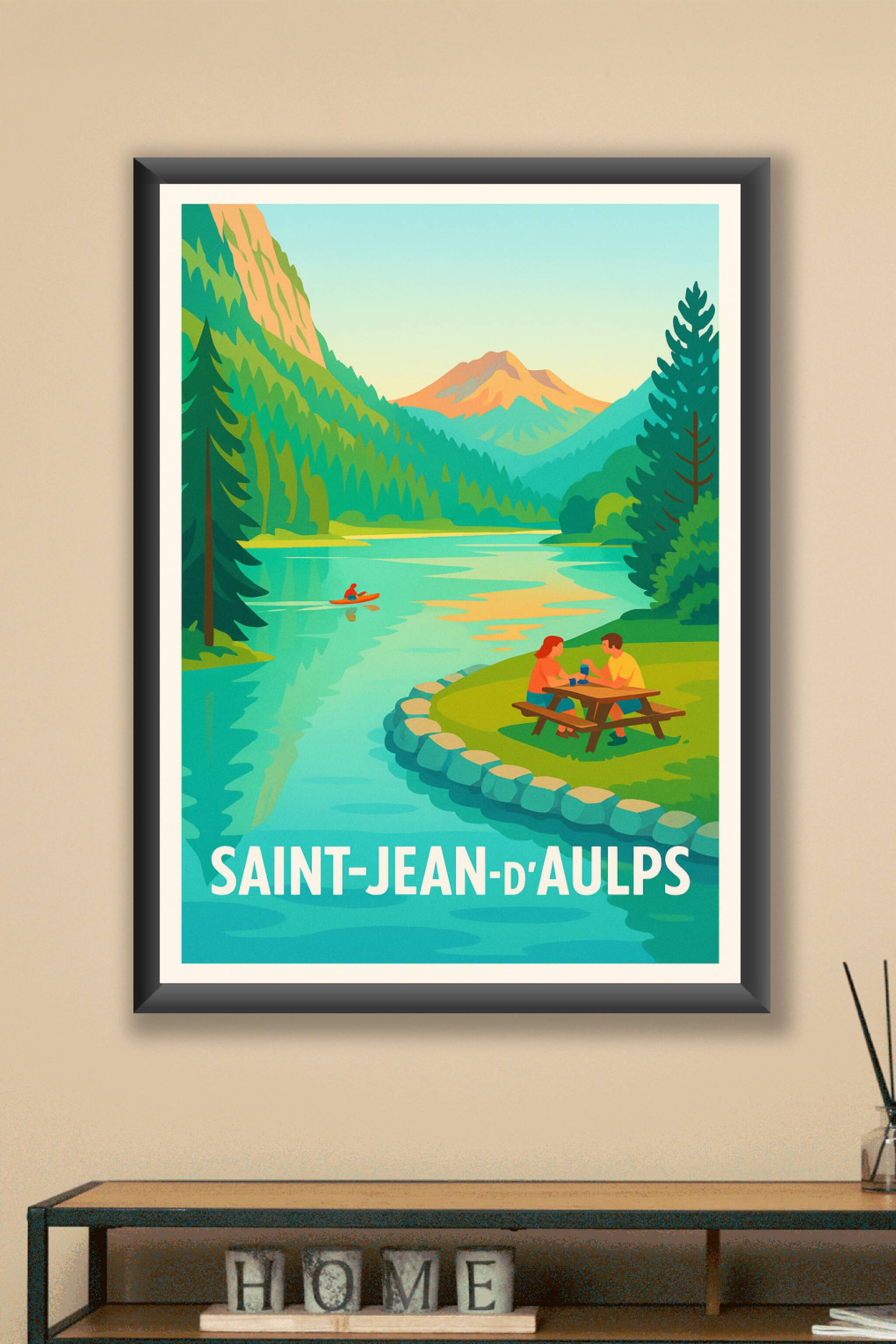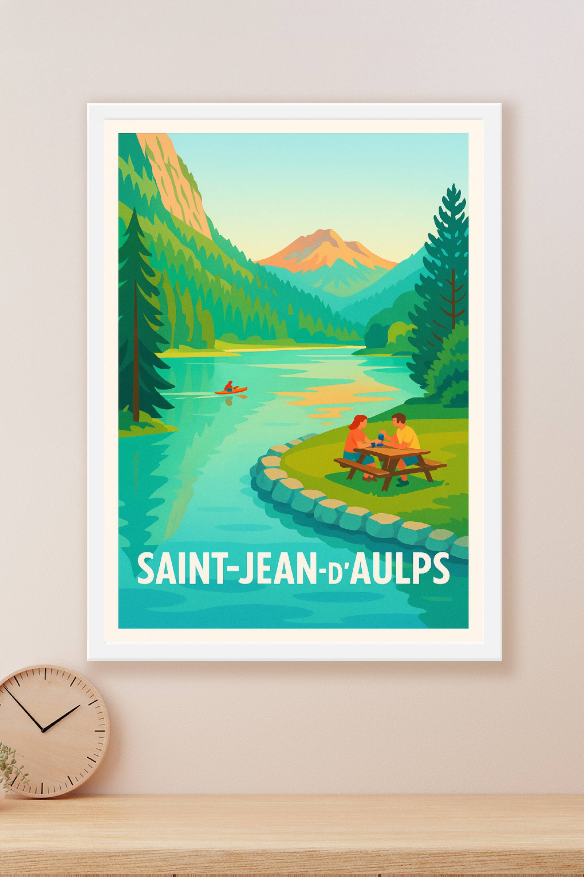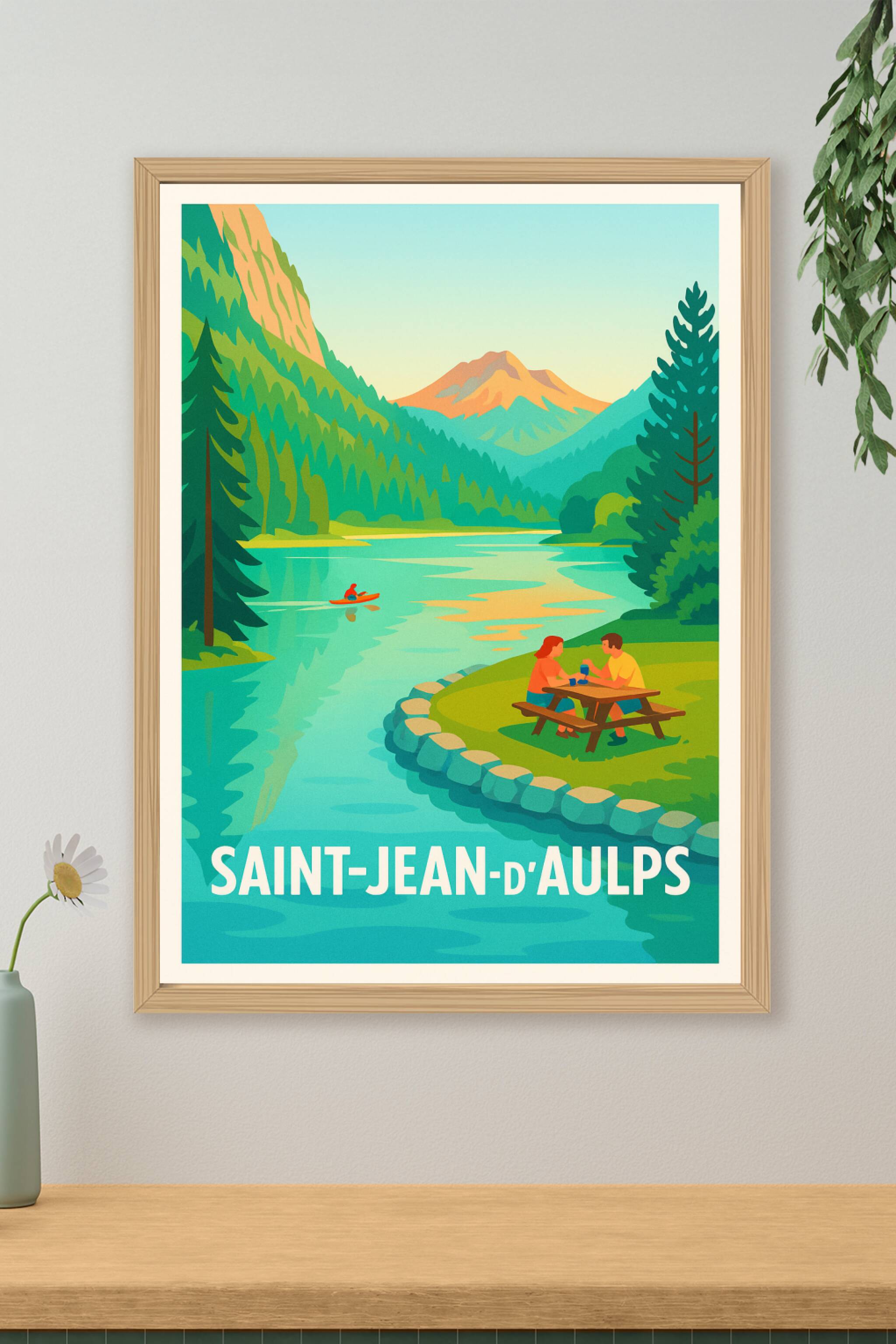 Découvrez la beauté authentique de Saint-Jean-d'Aulps avec cette affiche artistique qui capture un instant paisible au bord de l'eau, entouré de mo...