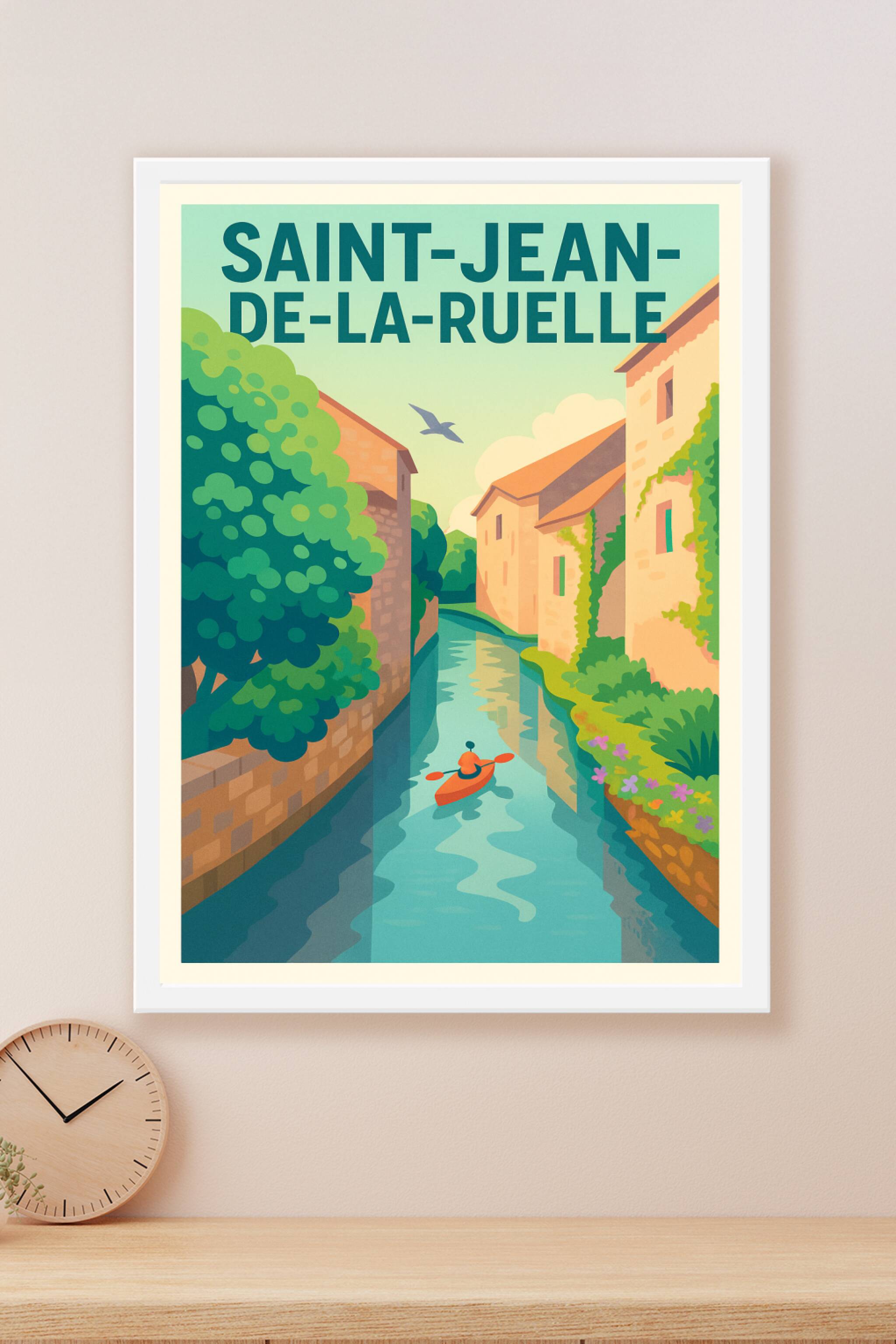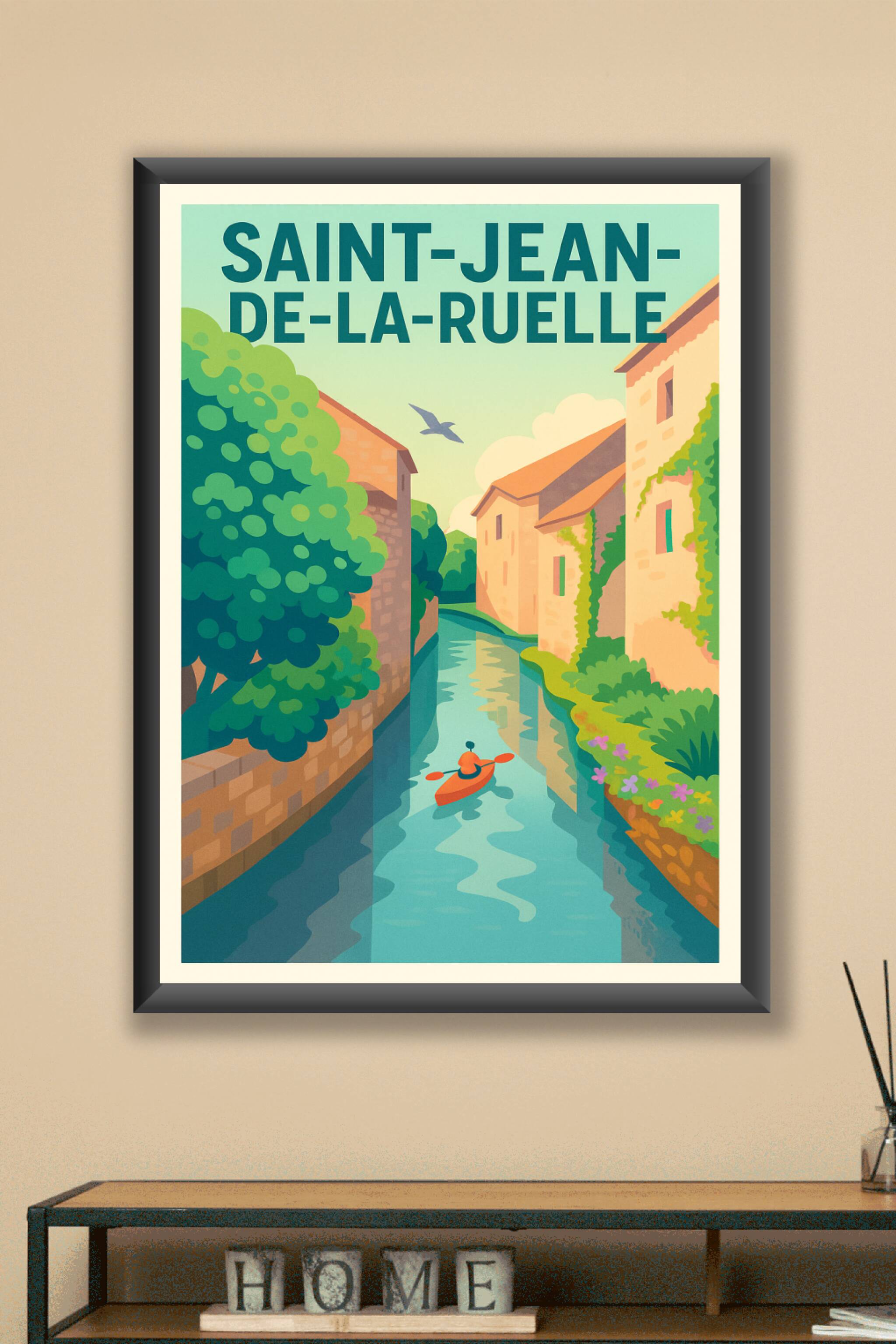 Découvrez la douceur de vivre à Saint-Jean-de-la-Ruelle avec cette magnifique affiche illustrée, mettant en scène un paisible kayak glissant le lon...