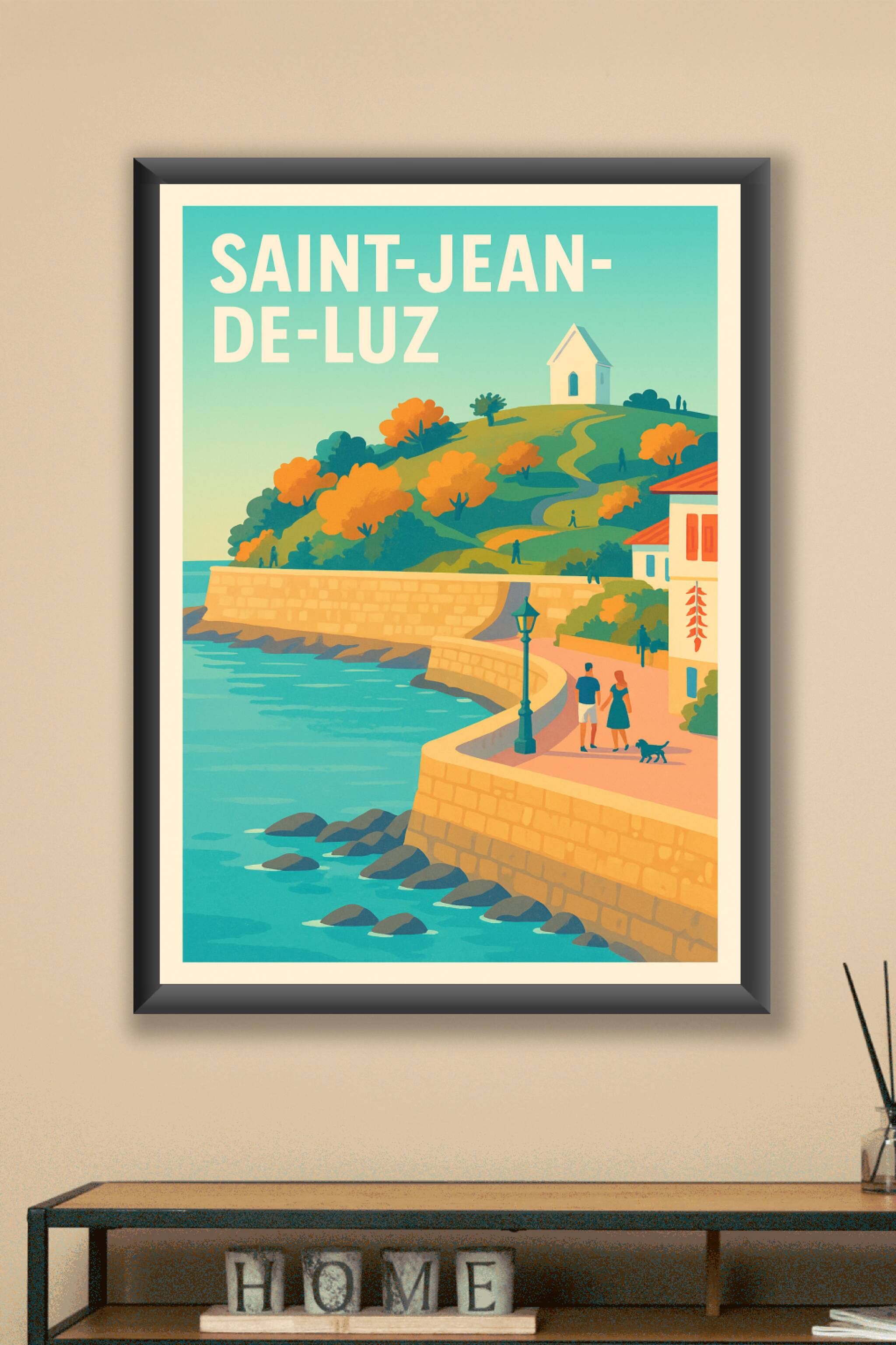 Découvrez la douceur de vivre basque avec cette affiche illustrée représentant la promenade en bord de mer de Saint-Jean-de-Luz. Cette scène paisible met en valeur les couleurs chaudes de l'automne et l'élégance des paysages maritimes, parfaits pour apporter une touche de sérénité à votre intérieur. Ce poster est disponible en tirage "Fine Art" sur papier 305g coton, garantissant une qualité d'impression exceptionnelle et des couleurs éclatantes qui durent dans le temps. Vous pouvez choisir entre les formats A1 à A4, avec ou sans cadre, afin d'adapter cette affiche à votre décoration ou d'en faire un cadeau raffiné pour les amoureux de la côte basque.