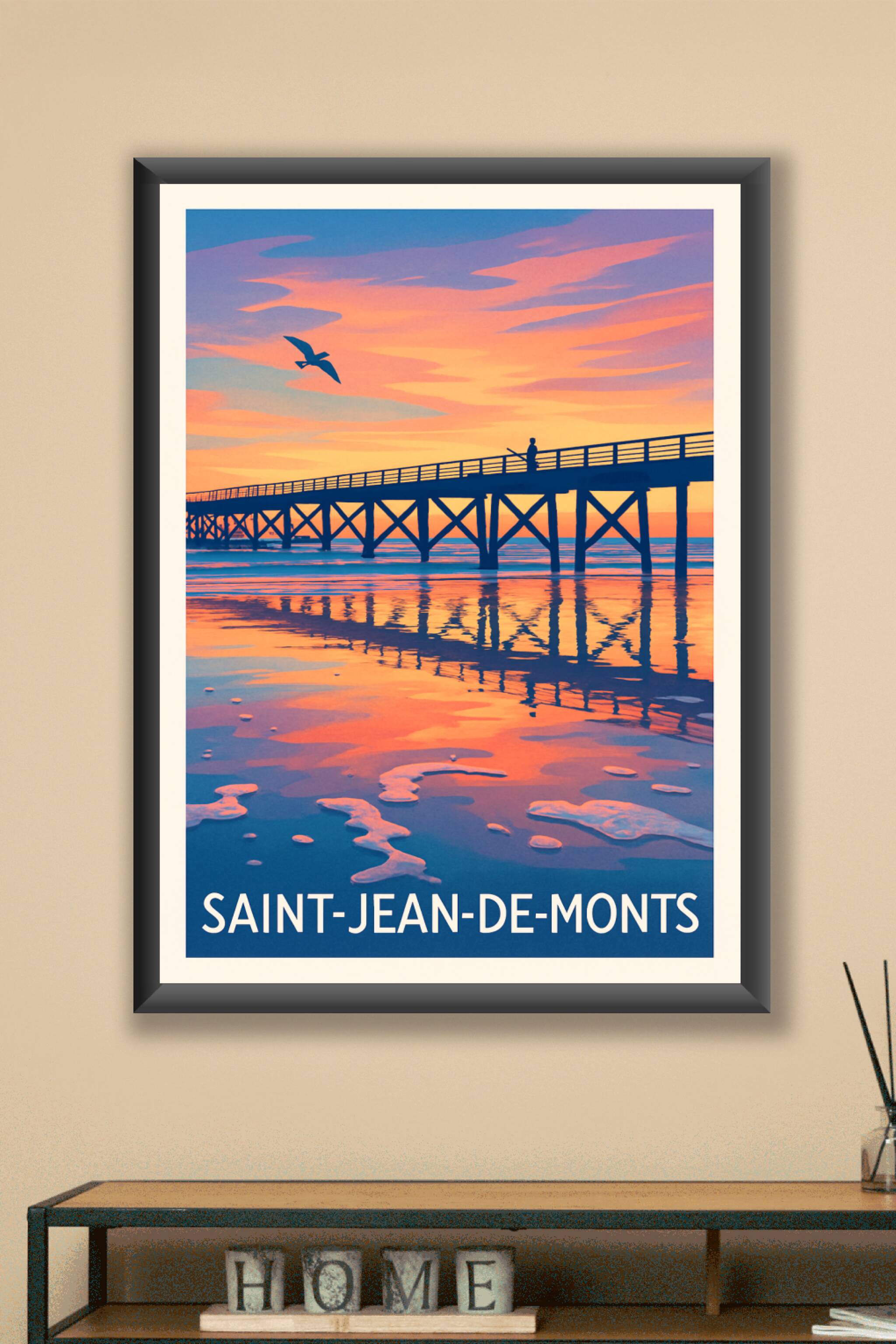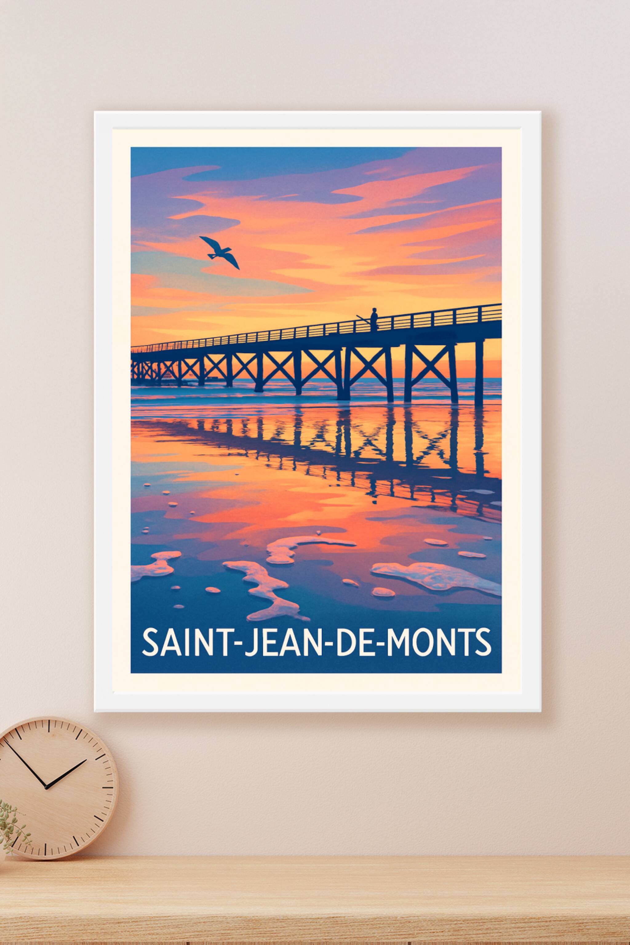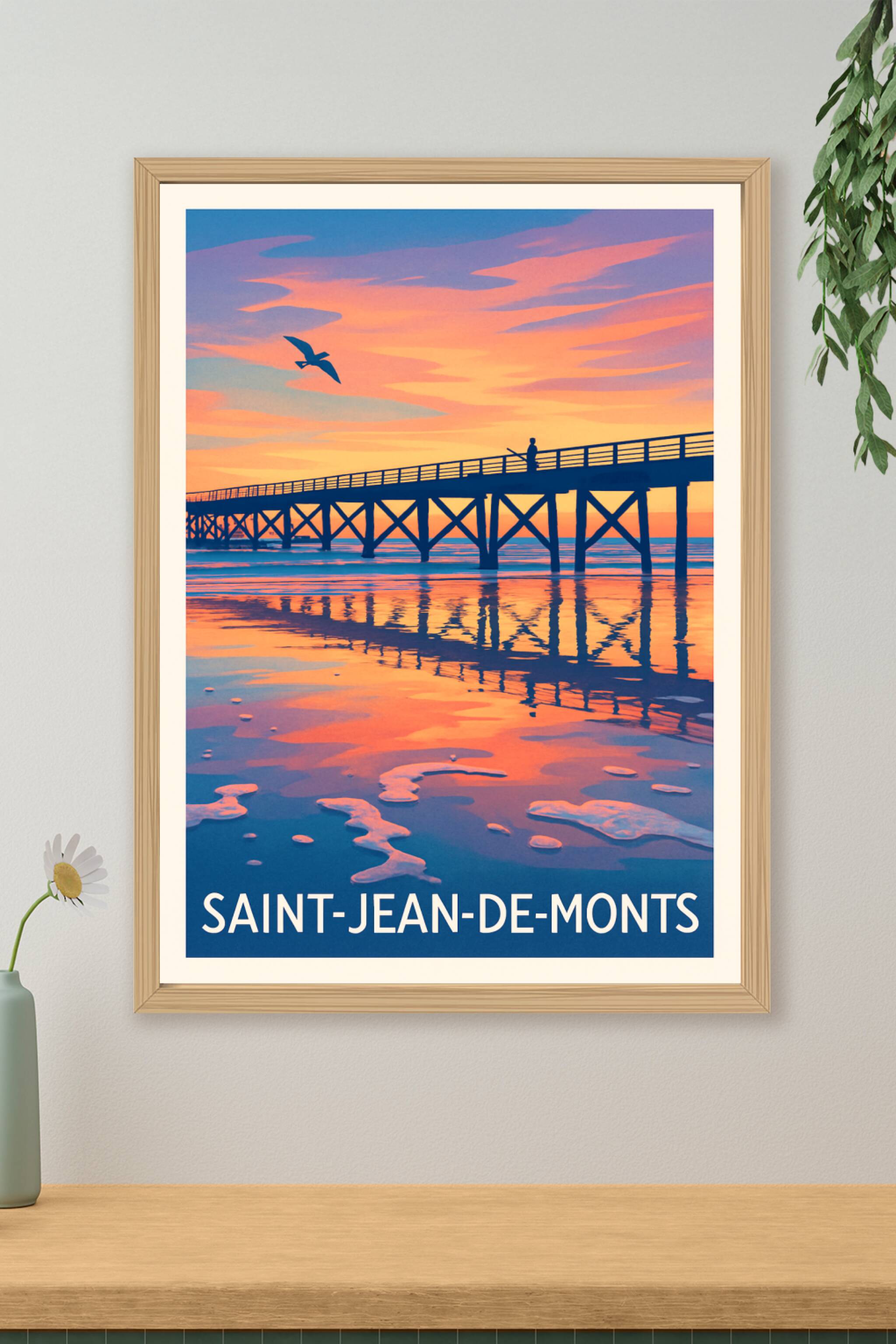 Capturez la douceur et la tranquillité des soirées à Saint-Jean-de-Monts avec cette affiche vibrante illustrant un pont se découpant sur un ciel au...