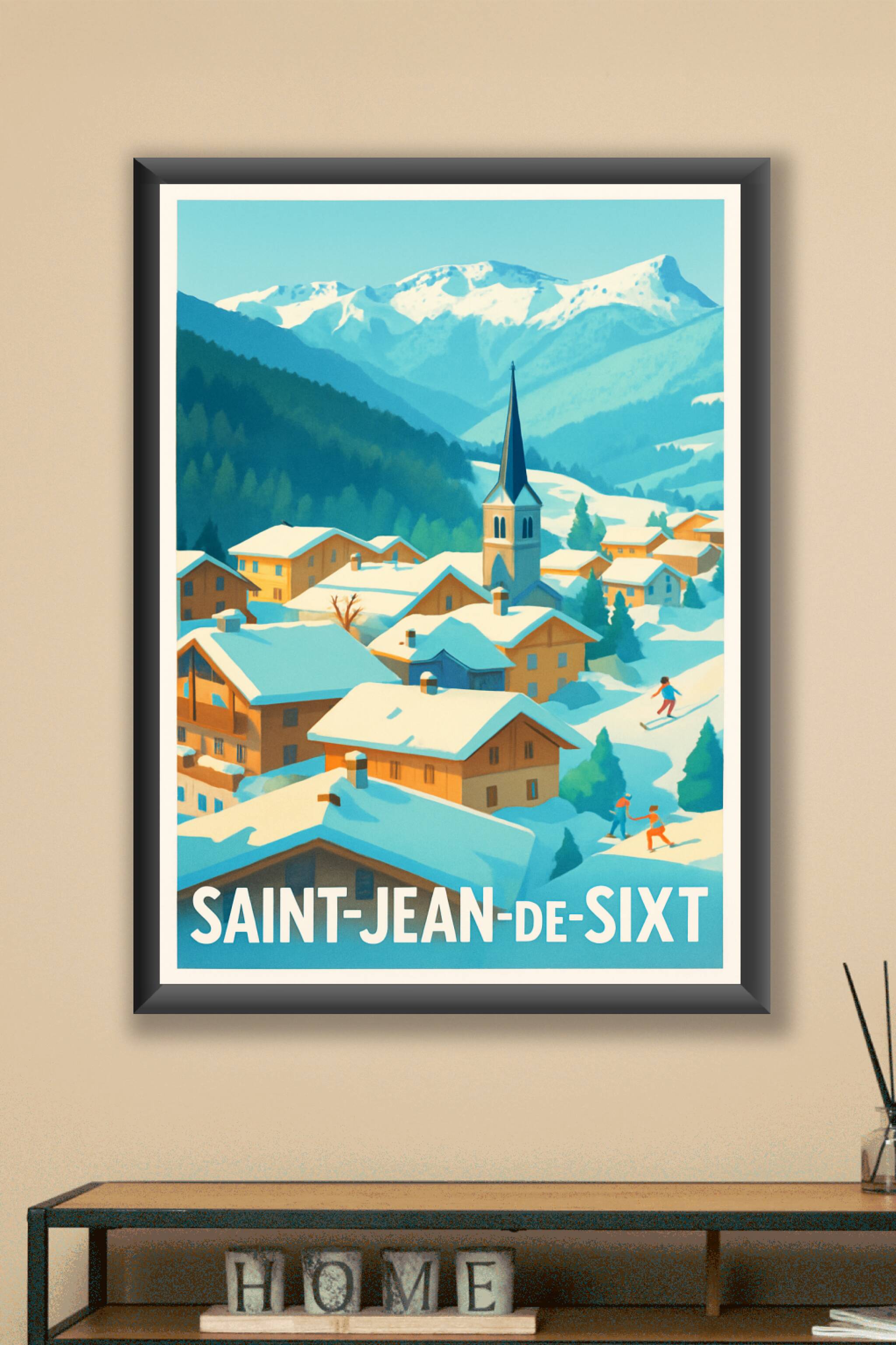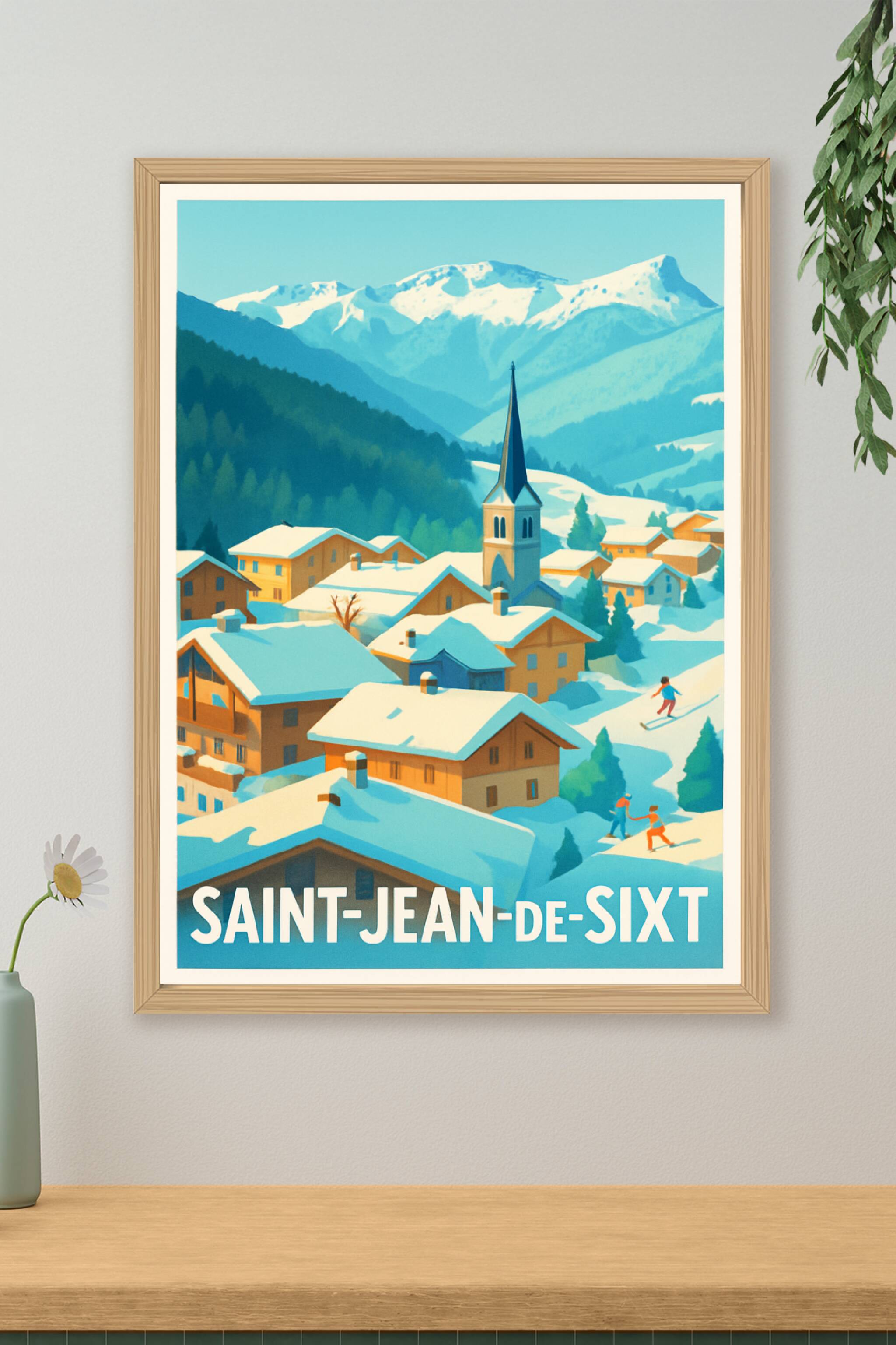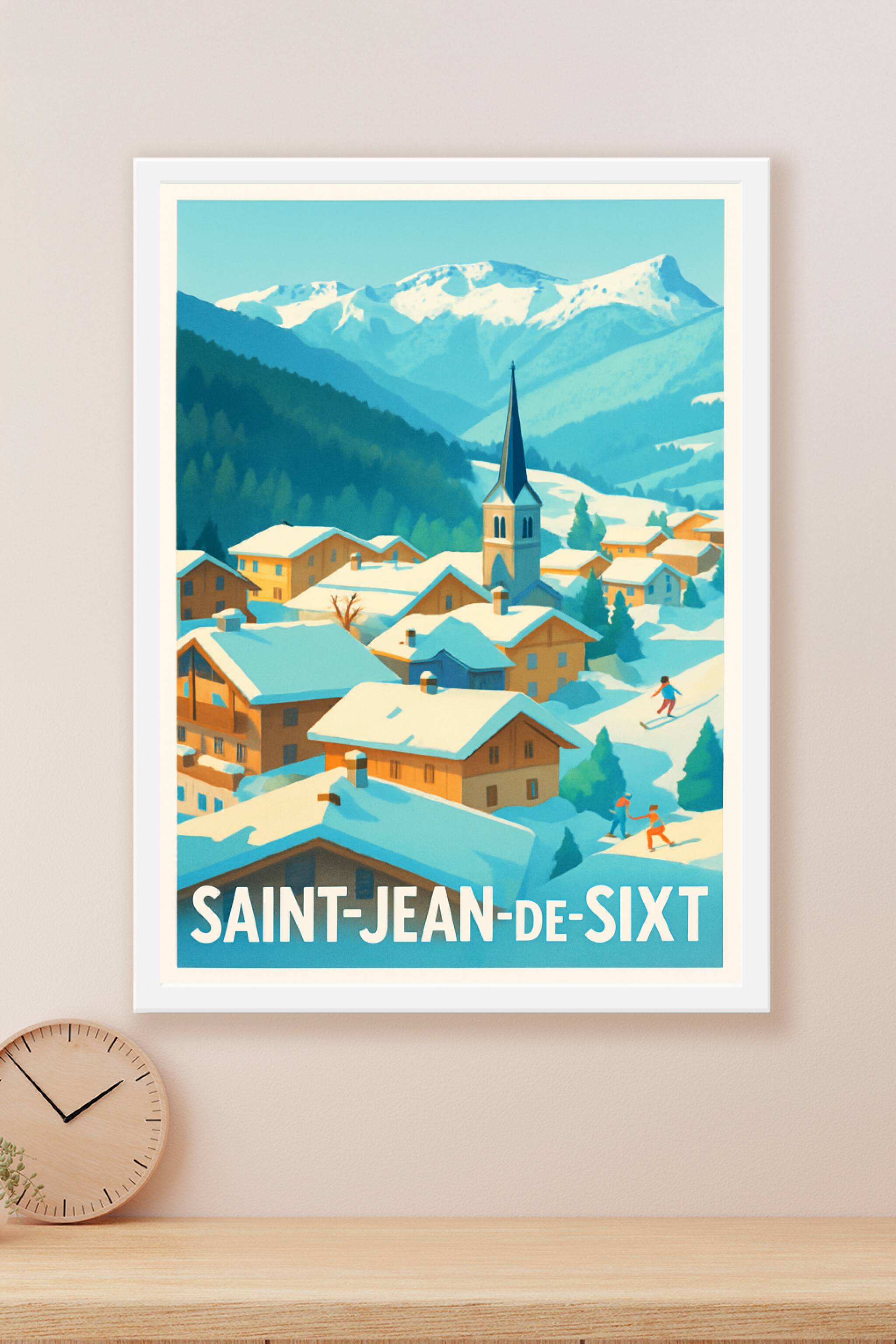 Découvrez la beauté pittoresque de Saint-Jean-de-Sixt à travers cette affiche vintage illustrée, qui capture l'essence d'un village alpin enneigé n...