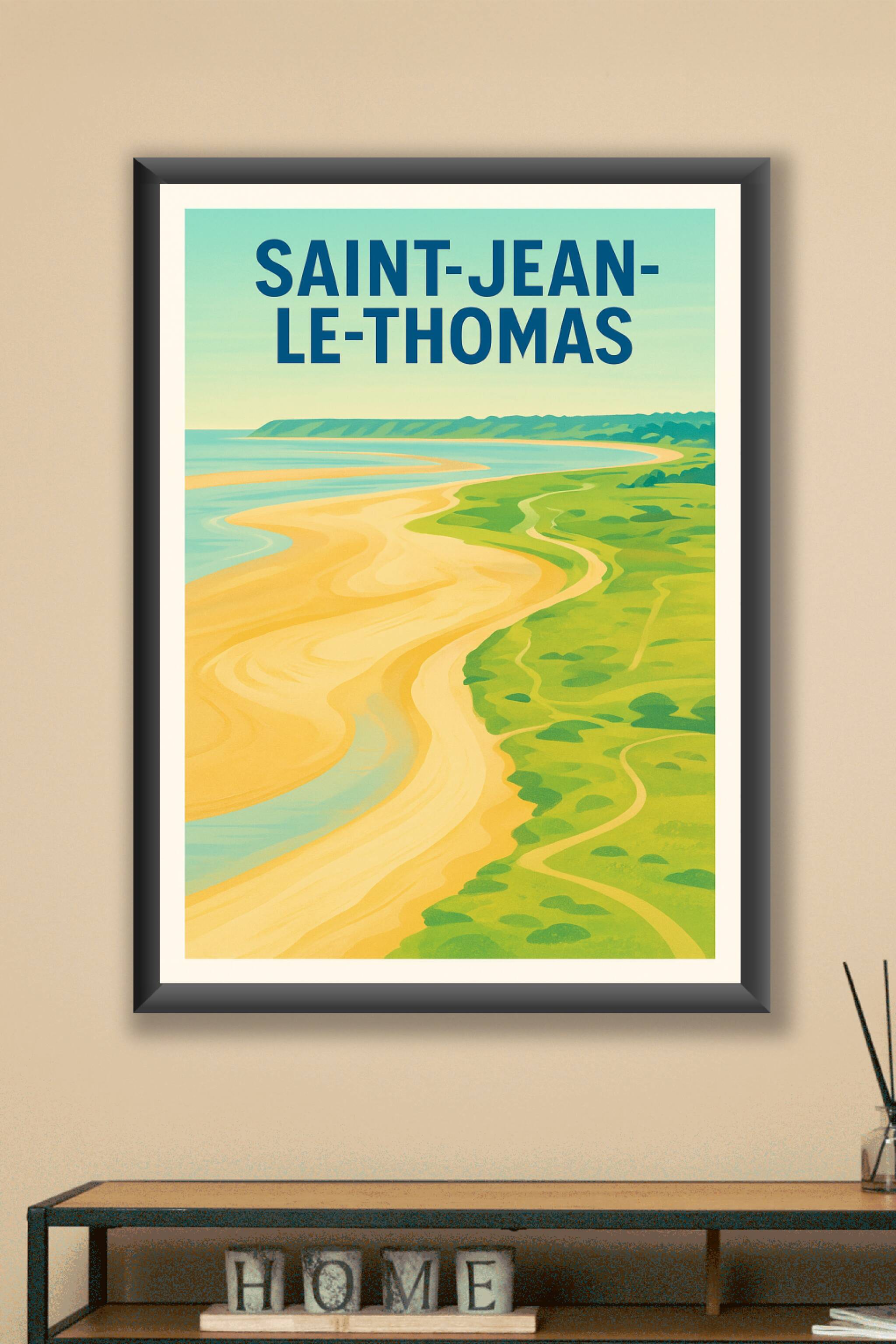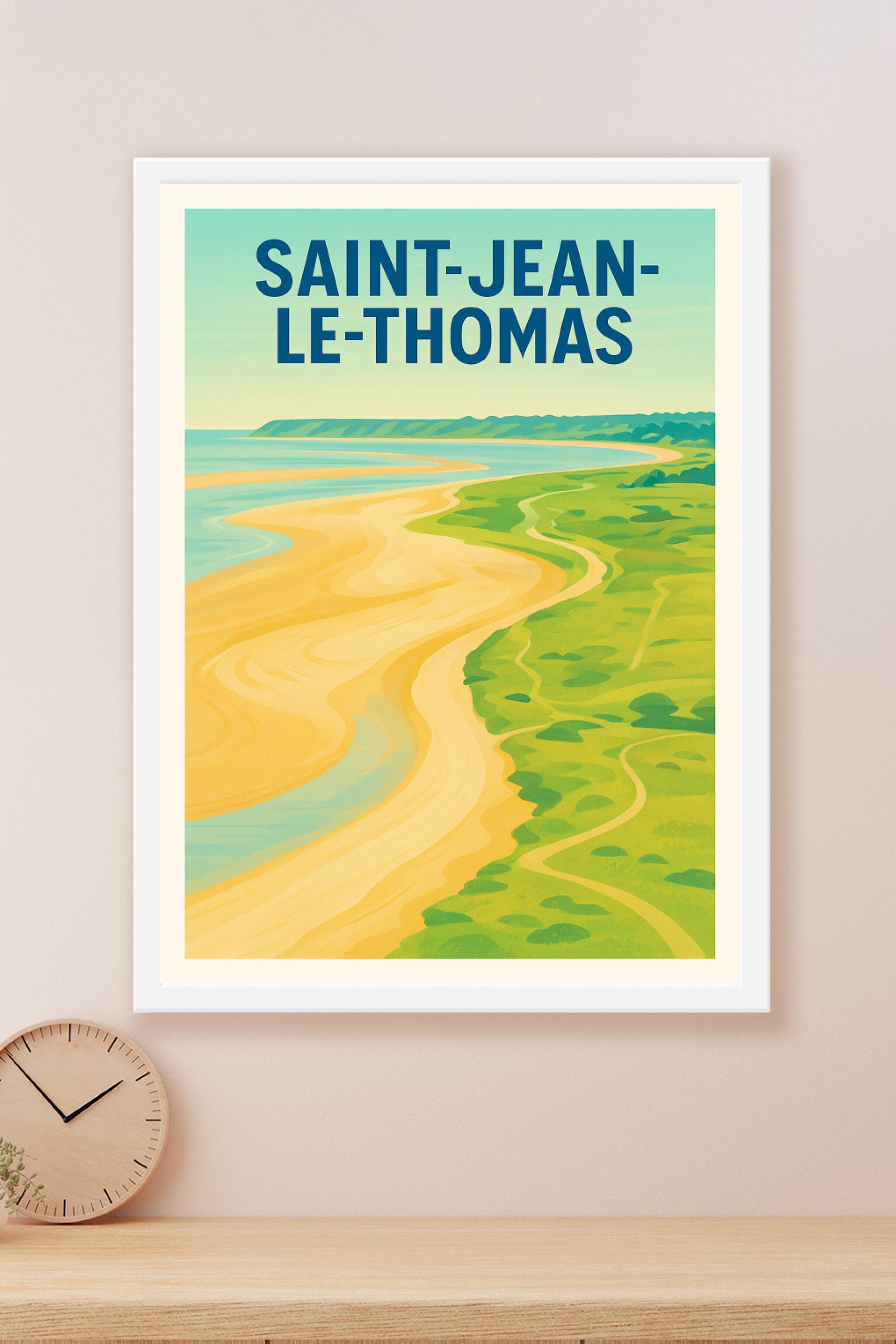 Découvrez la beauté naturelle et apaisante de Saint-Jean-le-Thomas avec cette affiche au style rétro et aux couleurs douces évoquant les paysages m...