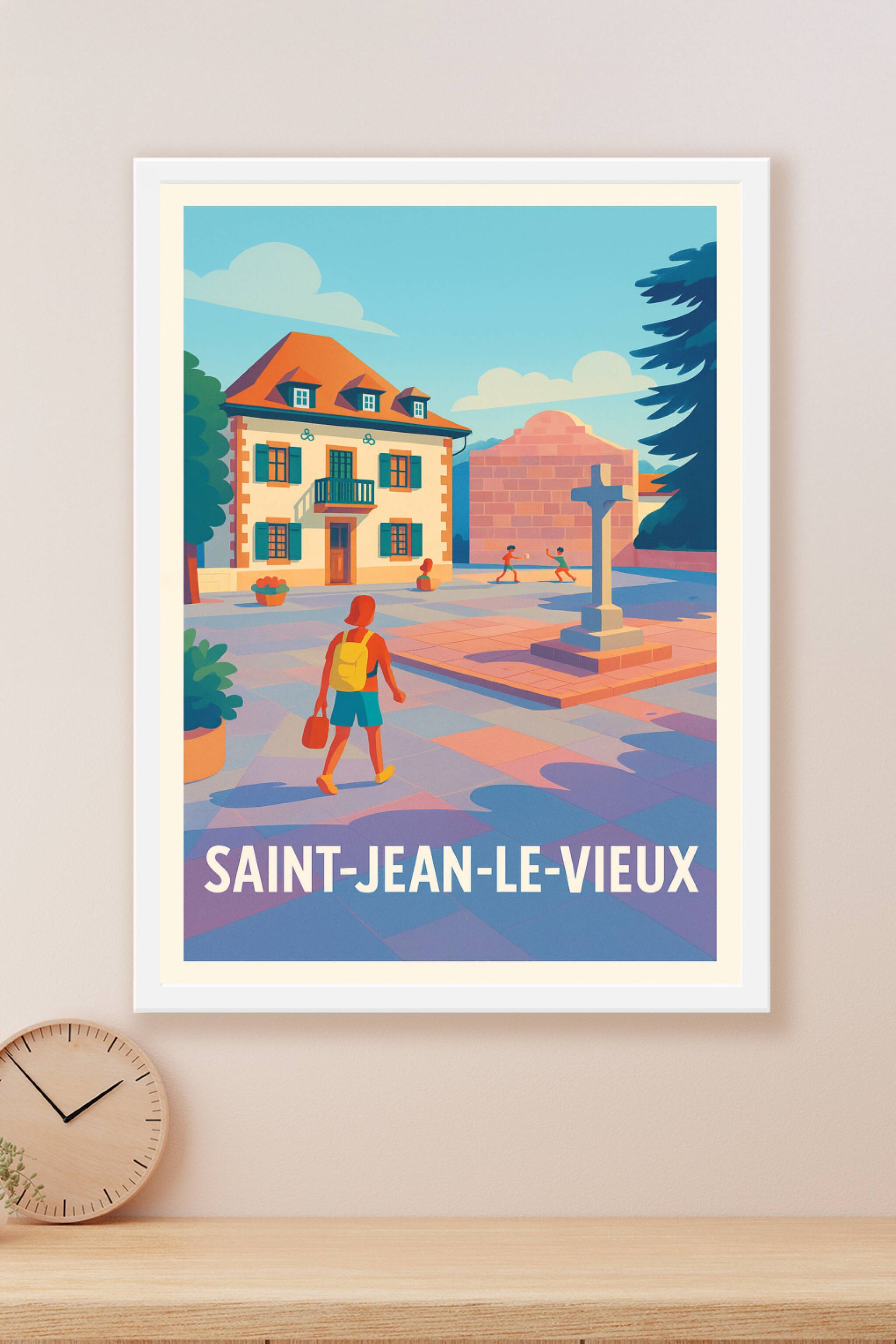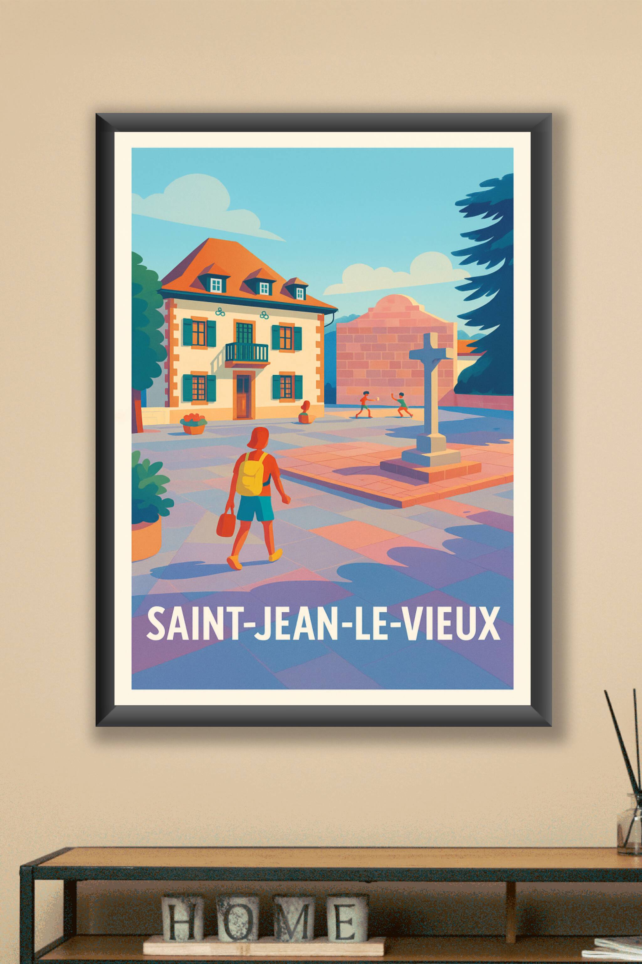 Découvrez l'atmosphère apaisante et colorée de Saint-Jean-le-Vieux à travers cette affiche illustrée avec un style rétro moderne. Le poster met en scène une scène paisible d'une place pavée où se mêlent architecture traditionnelle et vie locale authentique, parfait pour créer une ambiance chaleureuse chez vous. Imprimée en tirage "Fine Art" sur papier 305g coton, cette affiche offre une qualité d'impression exceptionnelle et une durabilité optimale. Disponible en plusieurs formats, du A1 au A4, avec ou sans cadre selon vos envies, elle s'adapte à tous les styles d'intérieur. Offrez-vous ou à vos proches ce poster unique, 100% fabriqué en France, pour une décoration délicate et pleine de caractère.