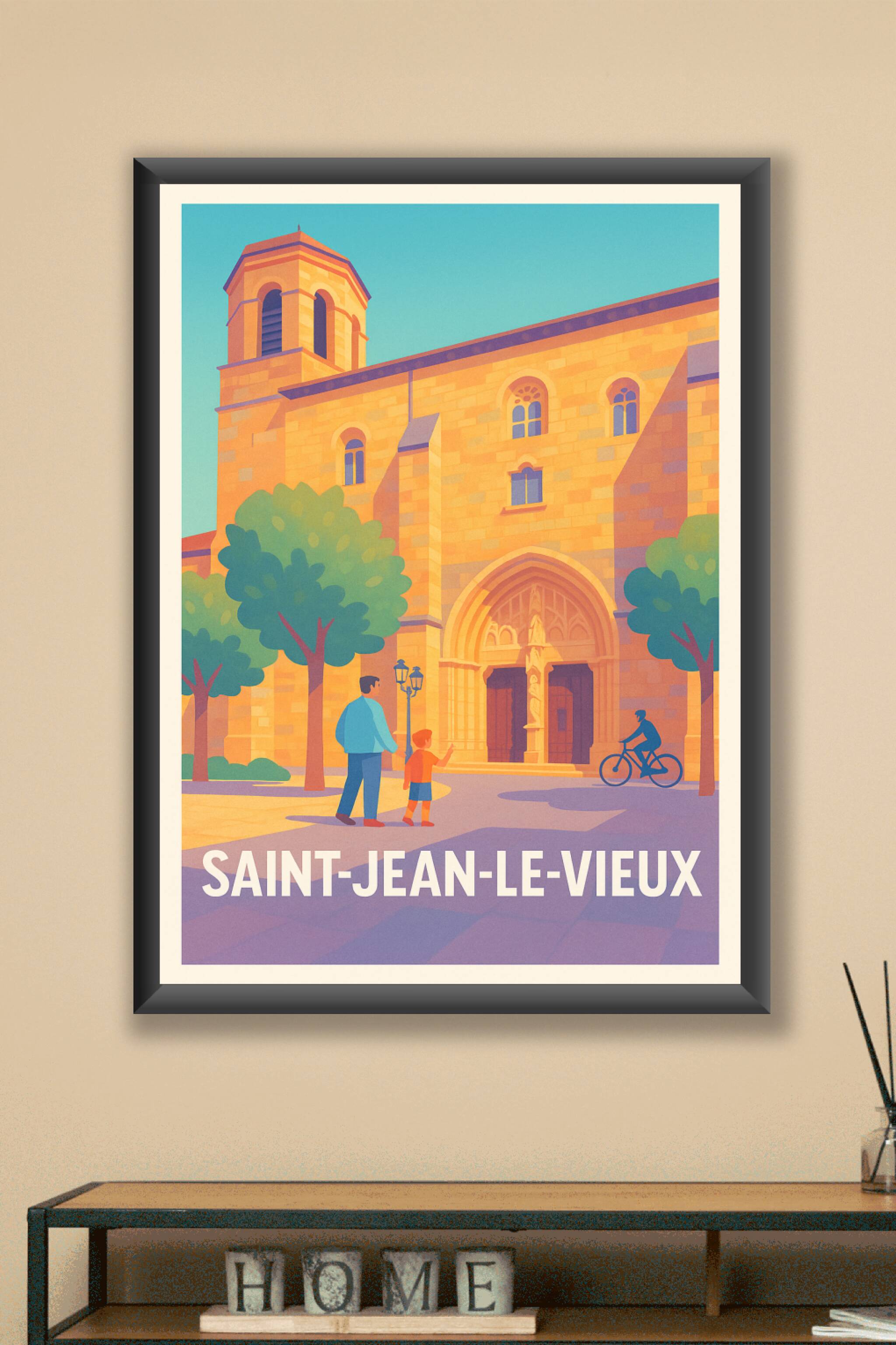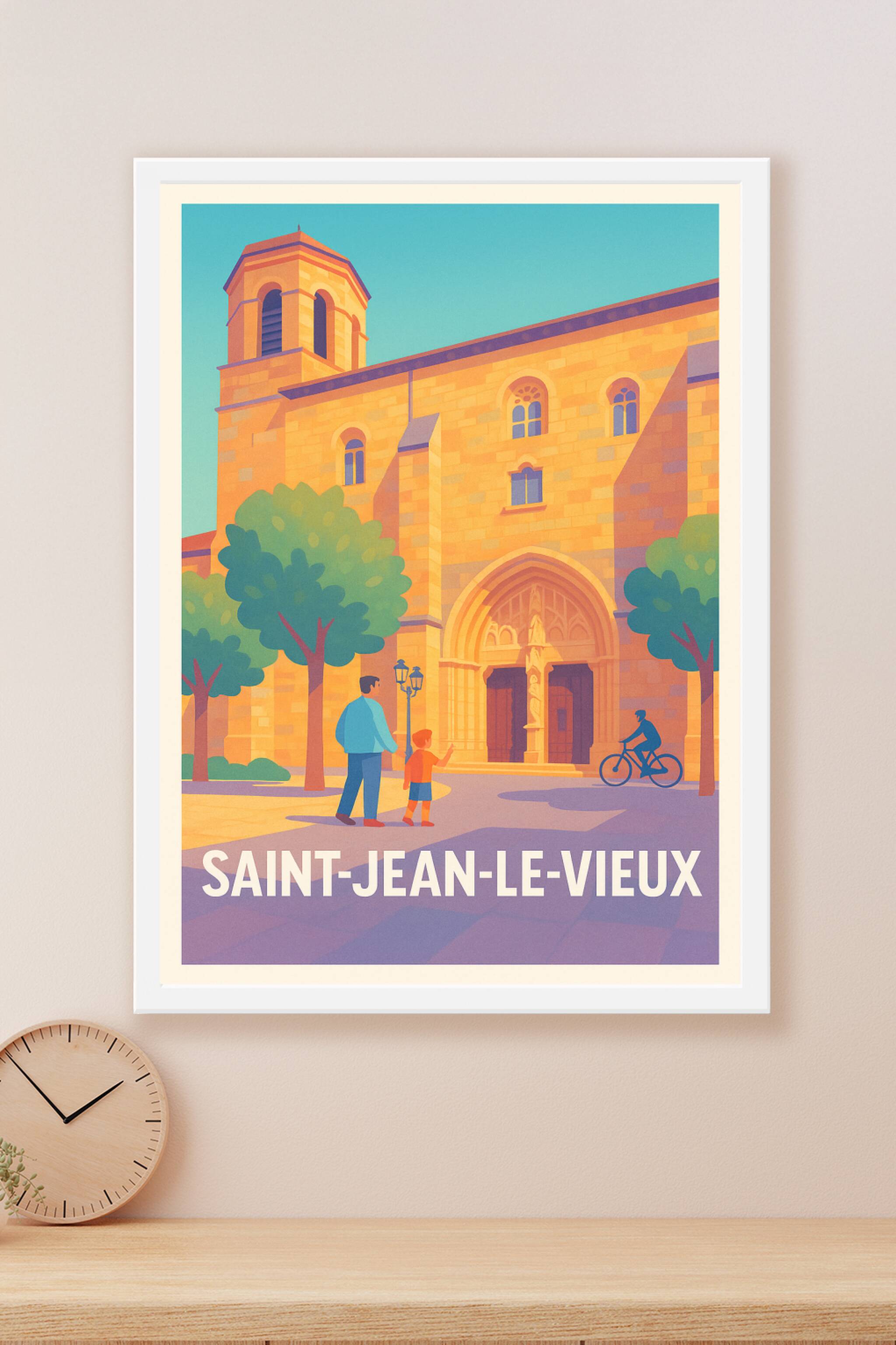Découvrez la beauté architecturale de Saint-Jean-le-Vieux avec cette affiche illustrée mettant en valeur l'église emblématique baignée de lumière d...