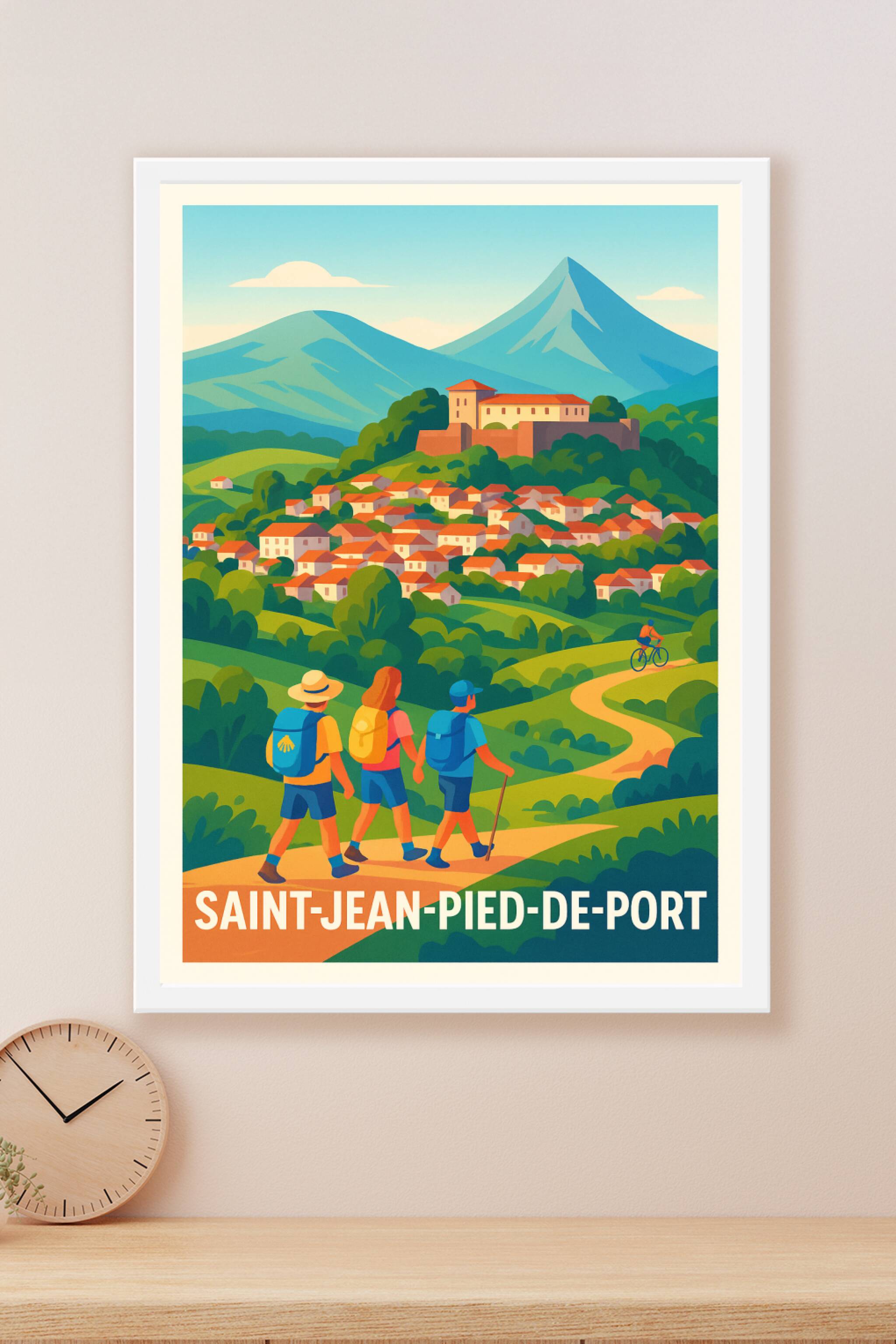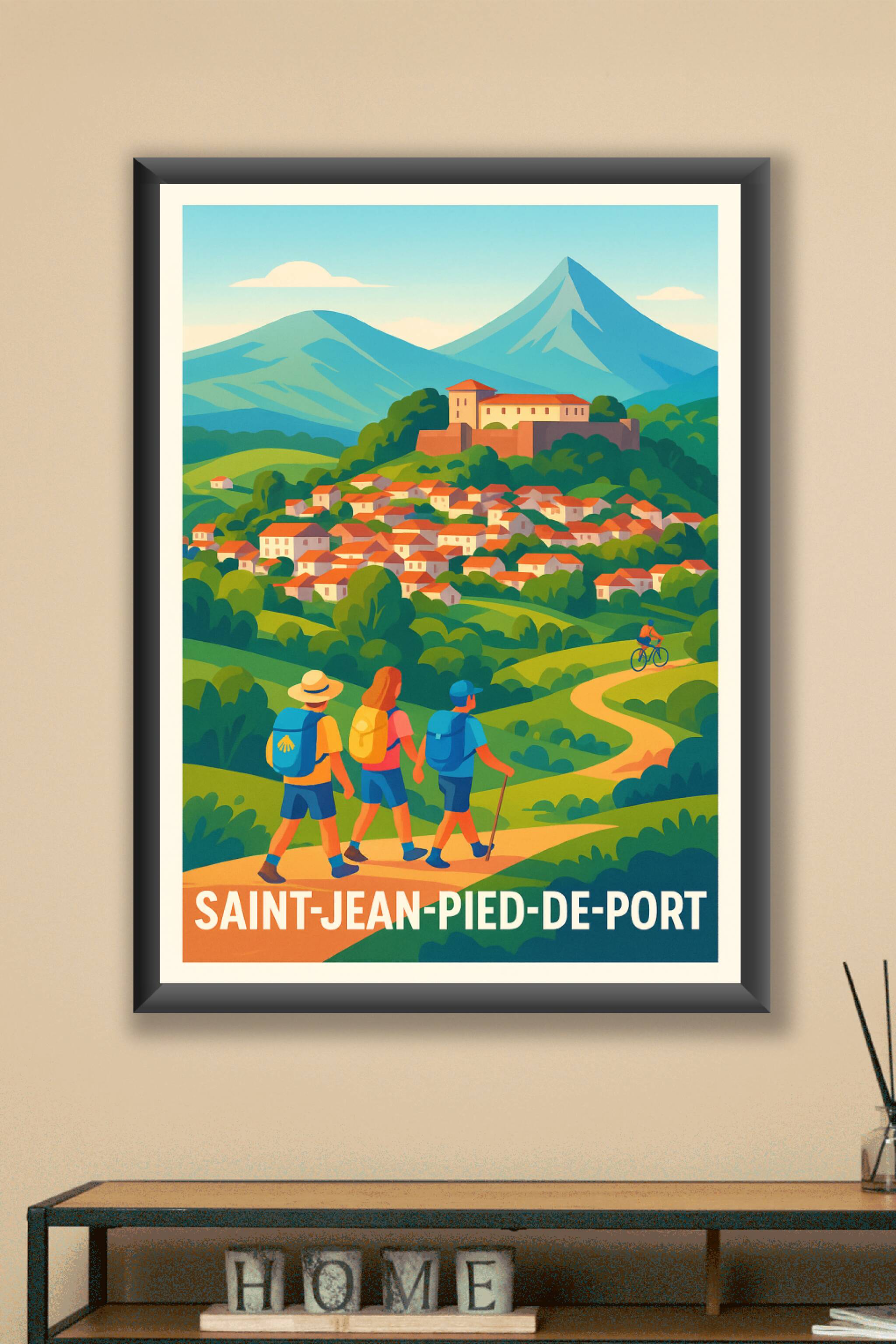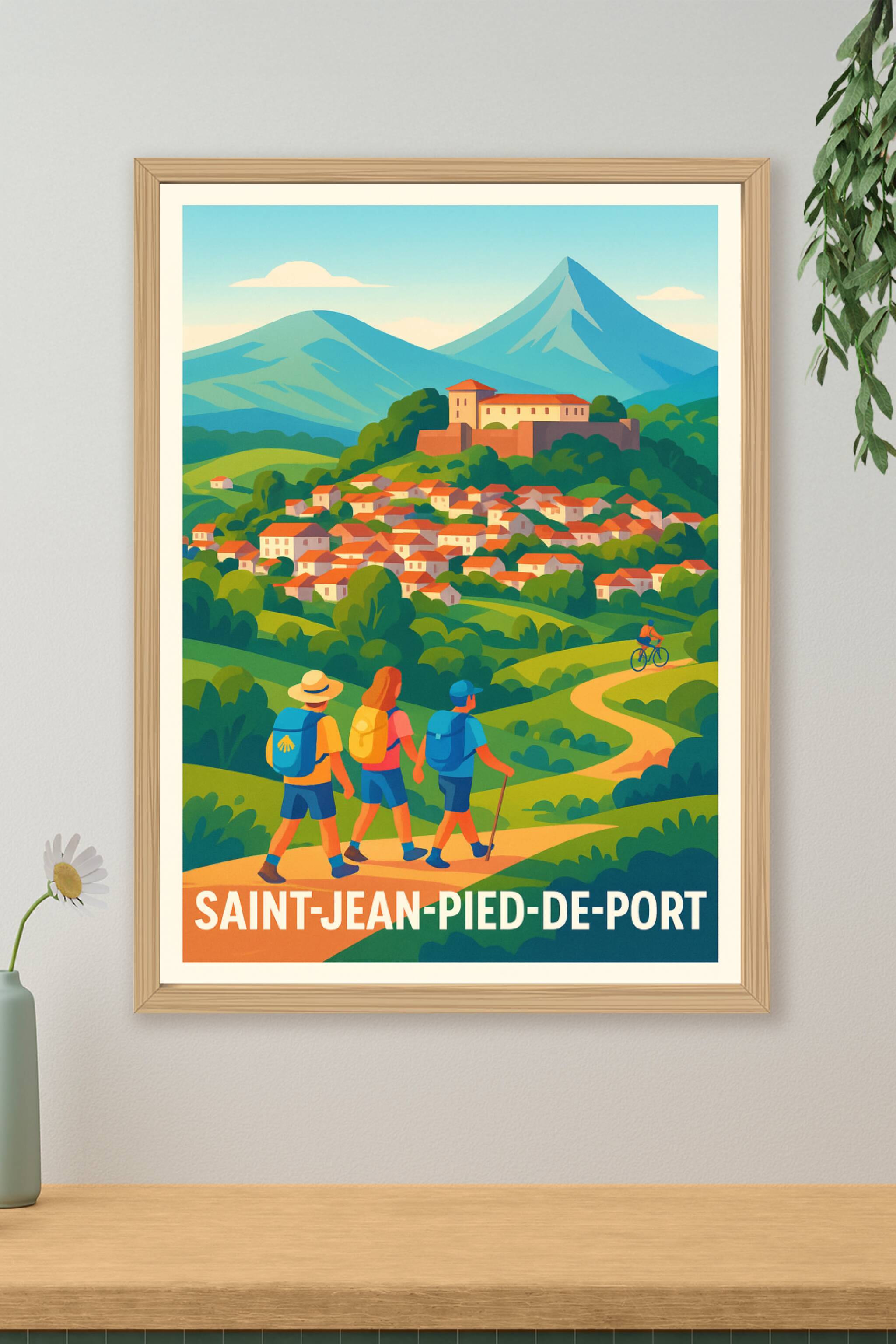 Découvrez le charme authentique de Saint-Jean-Pied-de-Port avec cette affiche illustrée évoquant les paysages verdoyants, les sentiers de randonnée...
