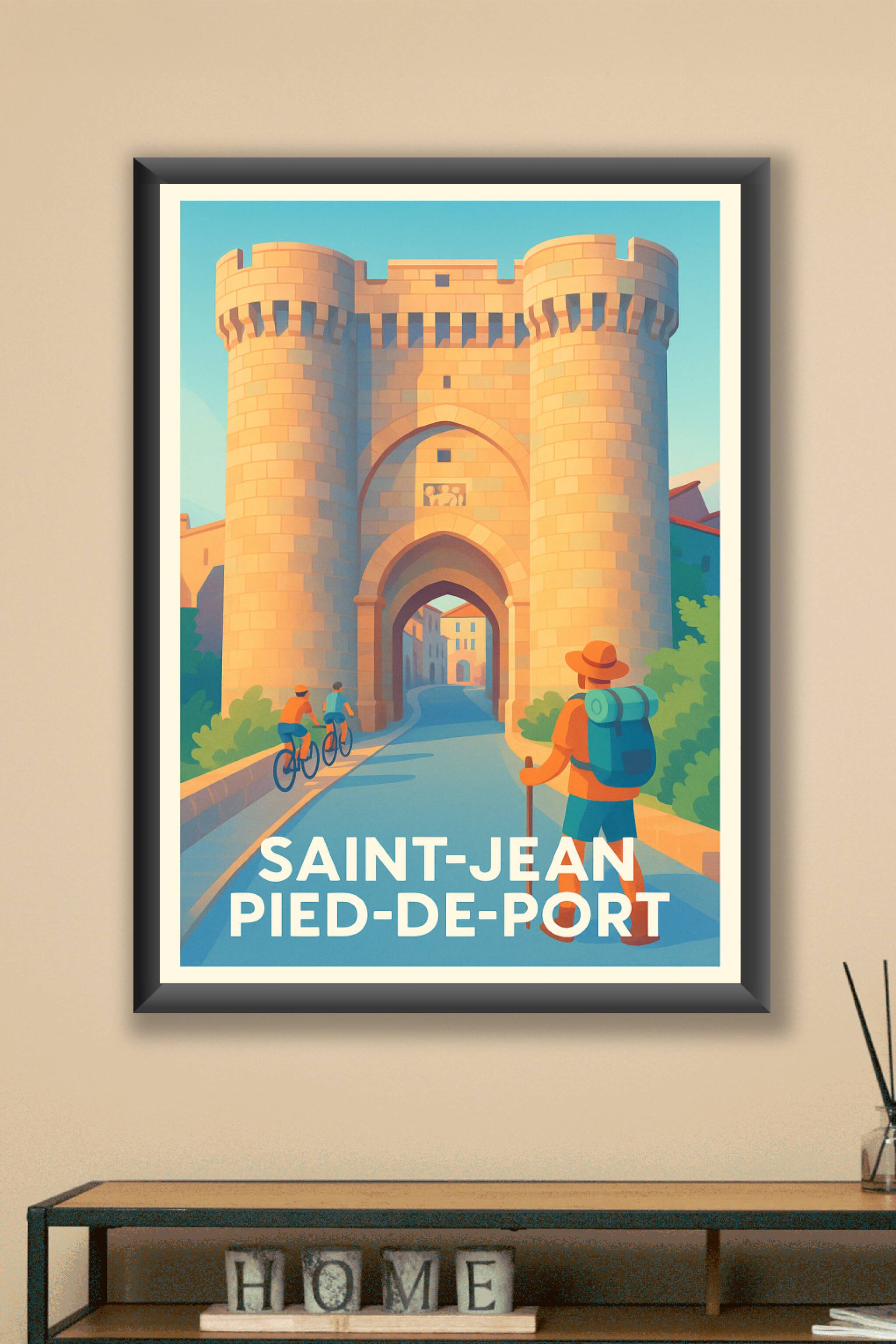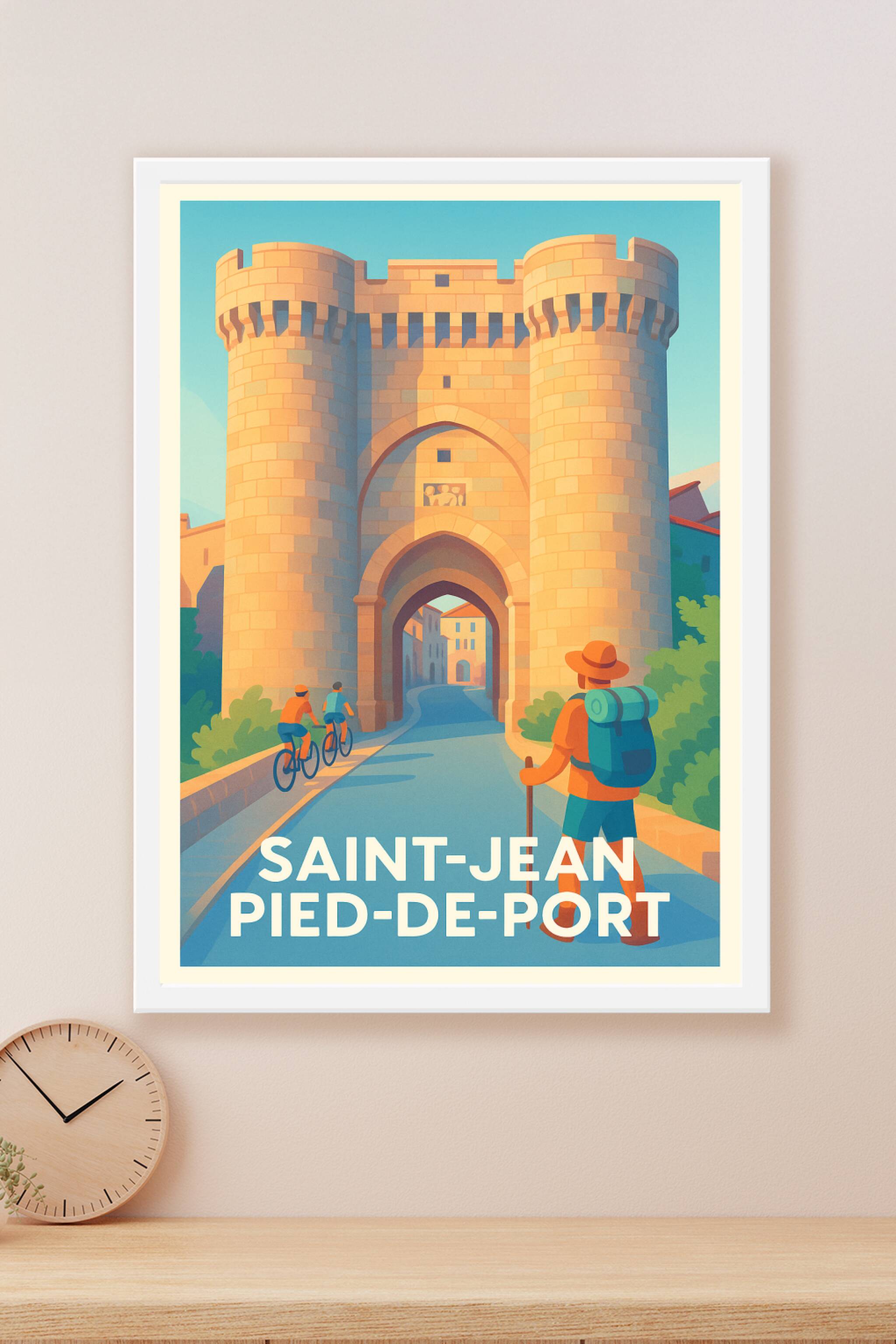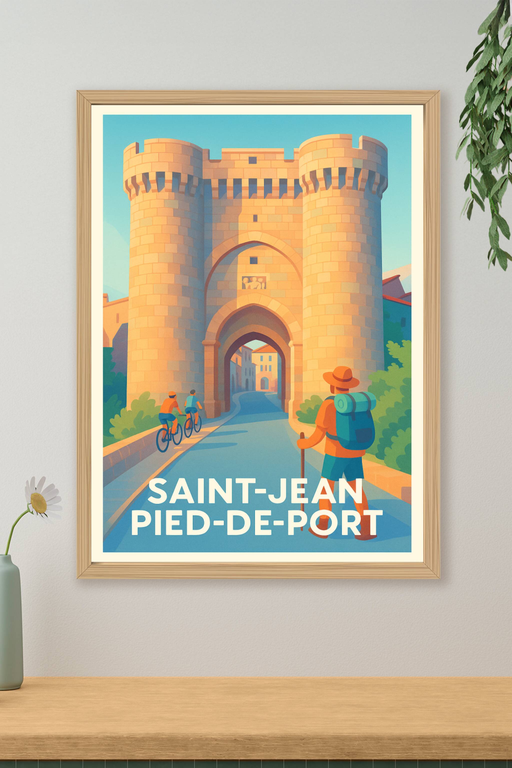 Découvrez l'ambiance unique de Saint-Jean-Pied-de-Port avec cette affiche illustrée, mettant en scène la célèbre porte fortifiée de la cité embléma...