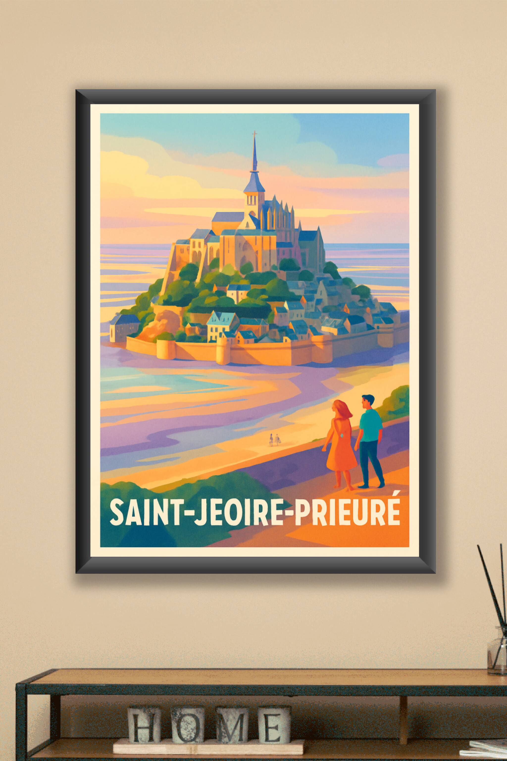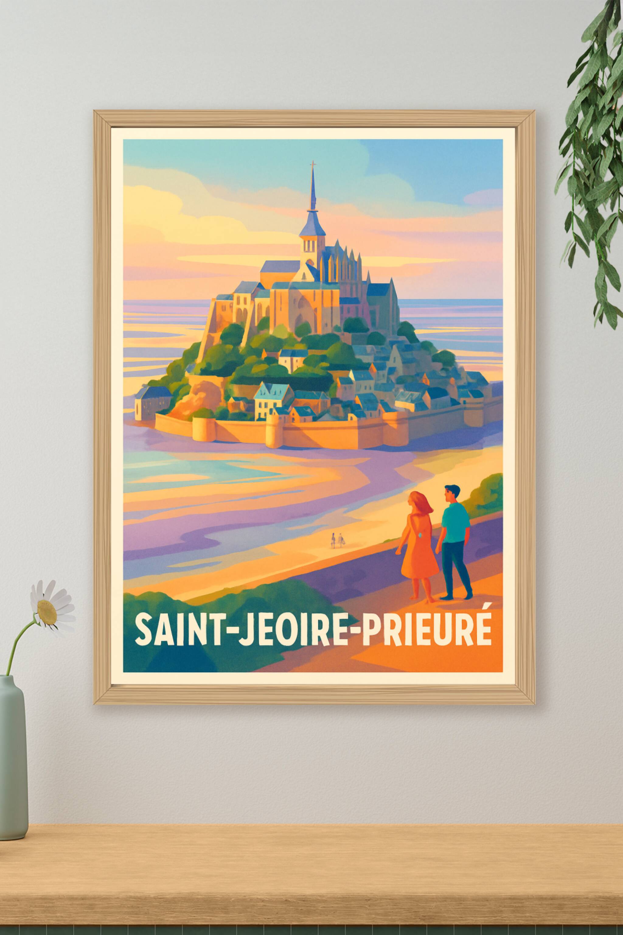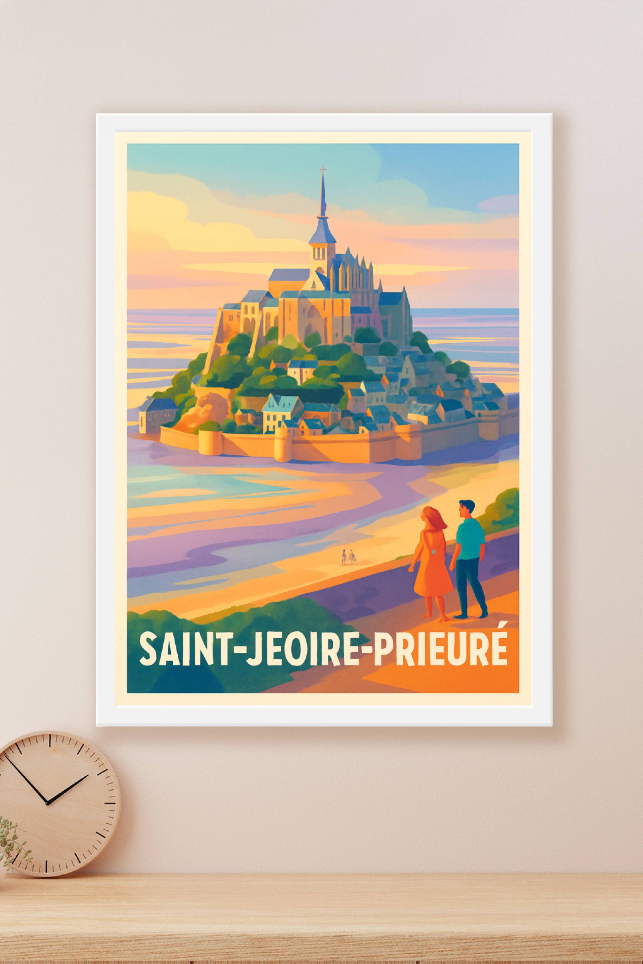Découvrez la magie de Saint-Jeoire-Prieuré à travers cette affiche délicatement illustrée au style rétro, mettant en lumière l'architecture embléma...