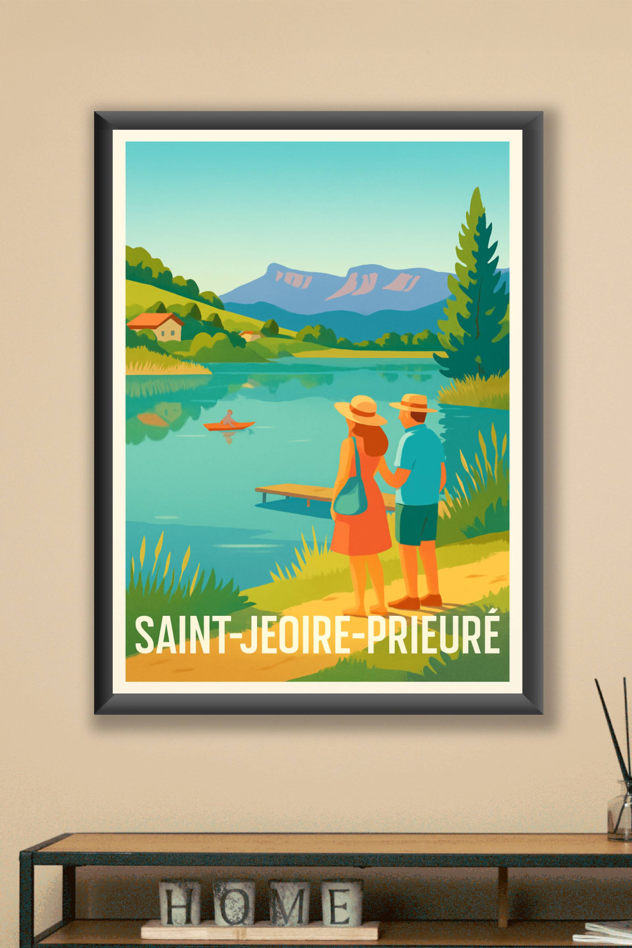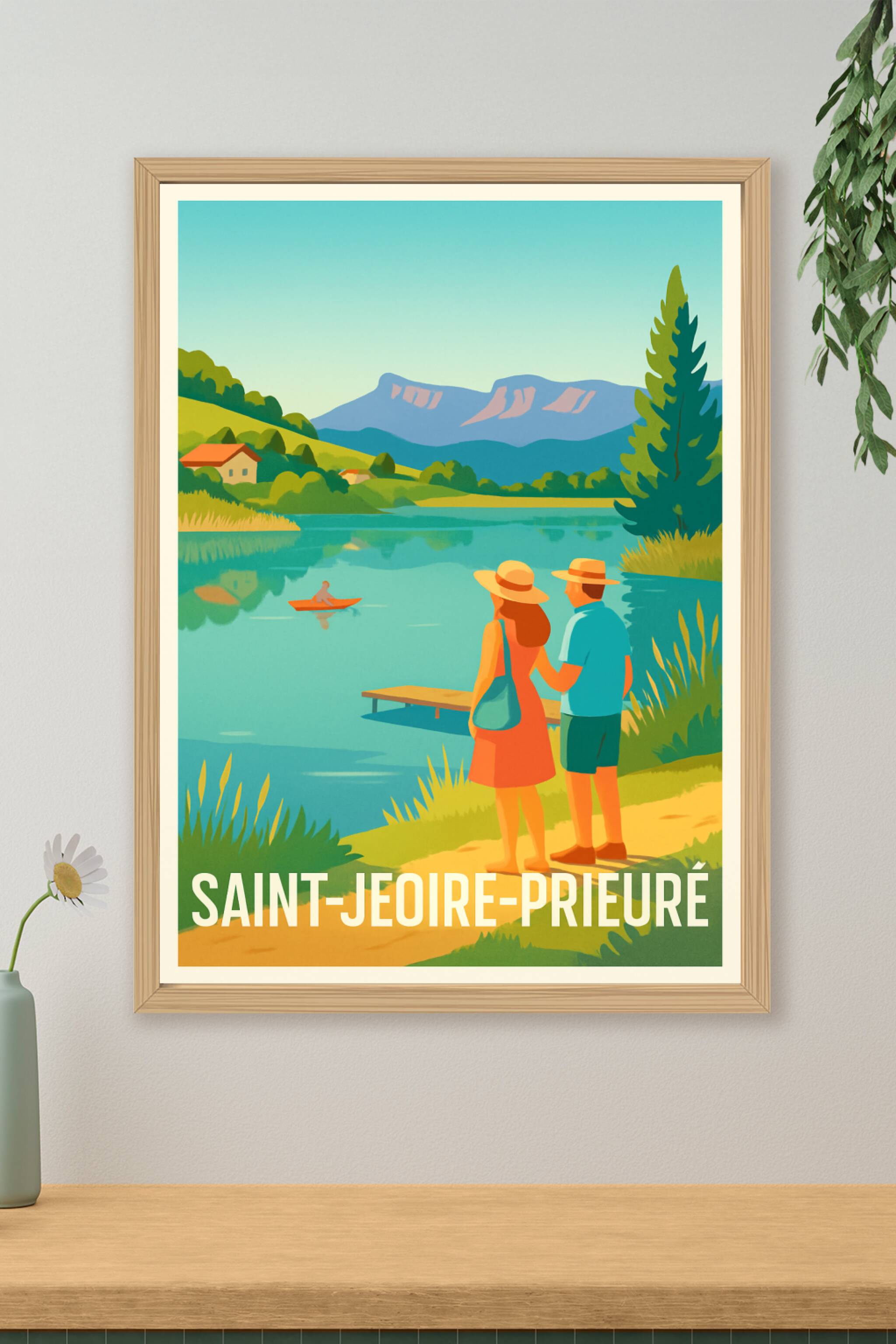 Découvrez la sérénité de Saint-Jeoire-Prieuré avec cette affiche au style rétro illustrant un couple admirant un paisible lac entouré de montagnes ...