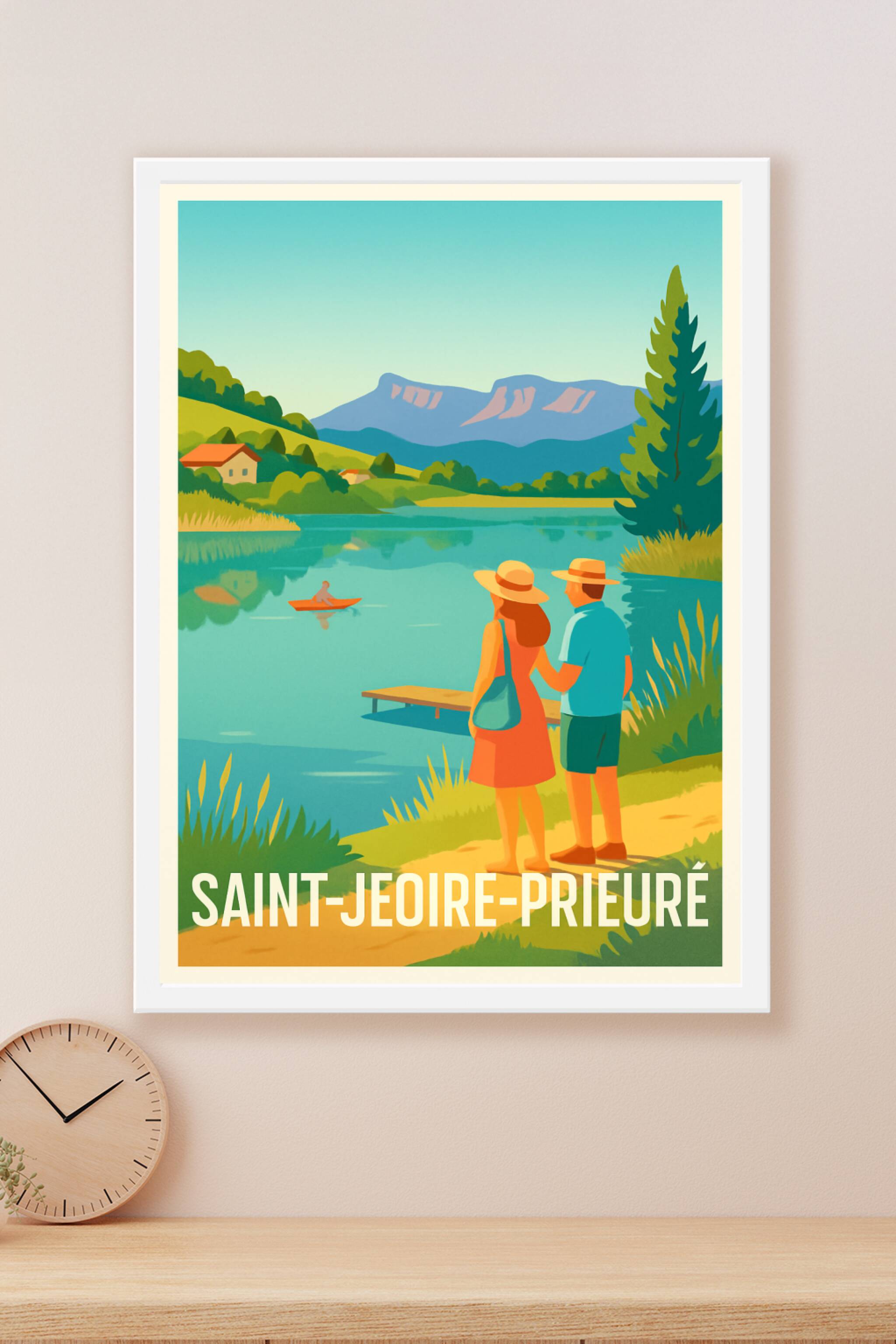 Découvrez la sérénité de Saint-Jeoire-Prieuré avec cette affiche au style rétro illustrant un couple admirant un paisible lac entouré de montagnes verdoyantes. Ce poster capture l'essence d'une promenade estivale tranquille, idéale pour apporter une touche de calme et de nature à votre intérieur. Imprimée en tirage "Fine Art" sur un papier 305g coton d'exception, cette affiche vous garantit un rendu d'une grande finesse et une durabilité remarquable. Disponible en formats A1 à A4, avec ou sans cadre, elle embellira votre décoration tout en évoquant de doux souvenirs de vacances. Un poster de qualité premium, 100% fabriqué en France, parfait pour offrir ou se faire plaisir.