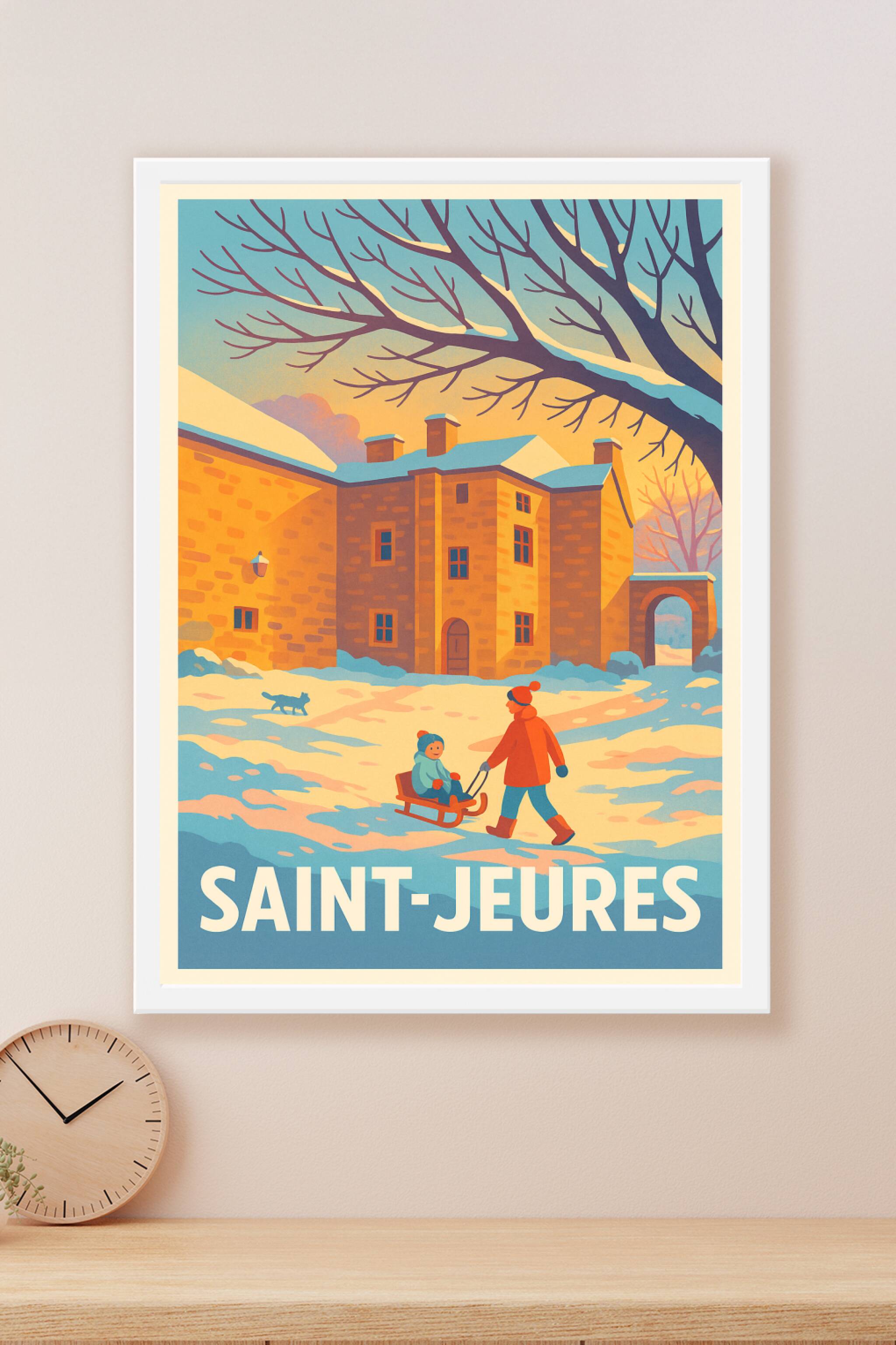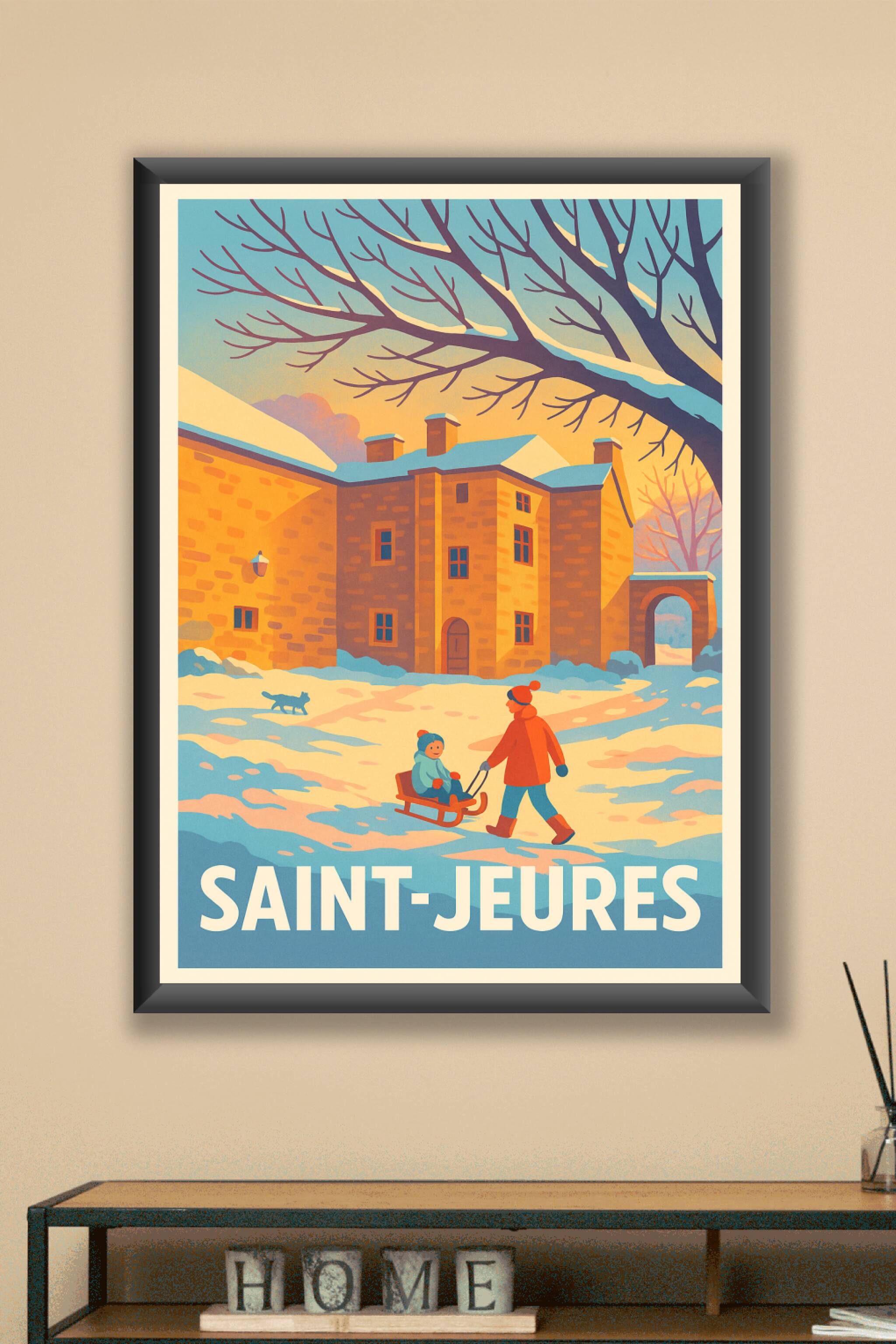 Découvrez l'atmosphère douce et chaleureuse de Saint-Jeures en hiver avec cette affiche illustrée au style vintage, mettant en scène un paysage enn...
