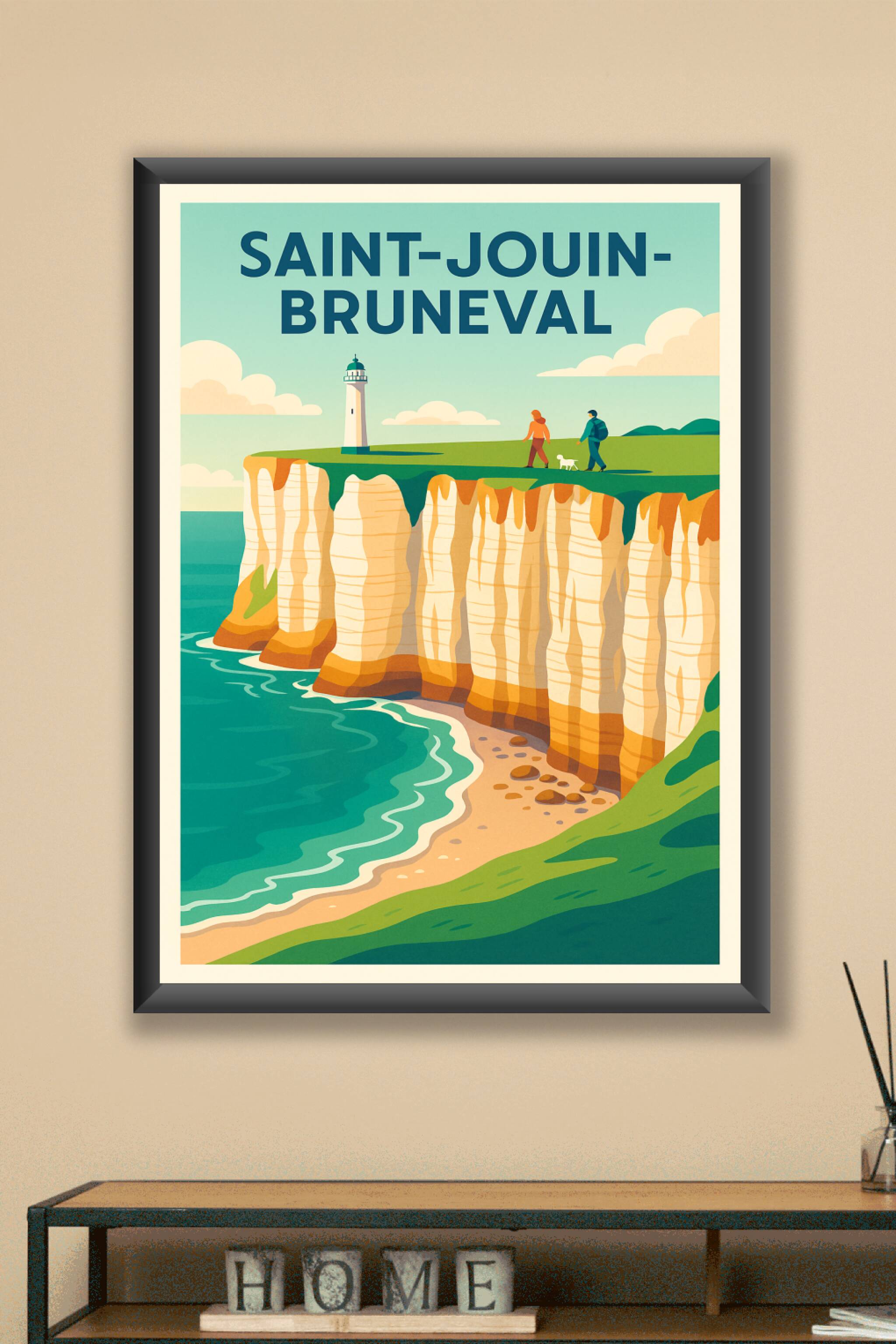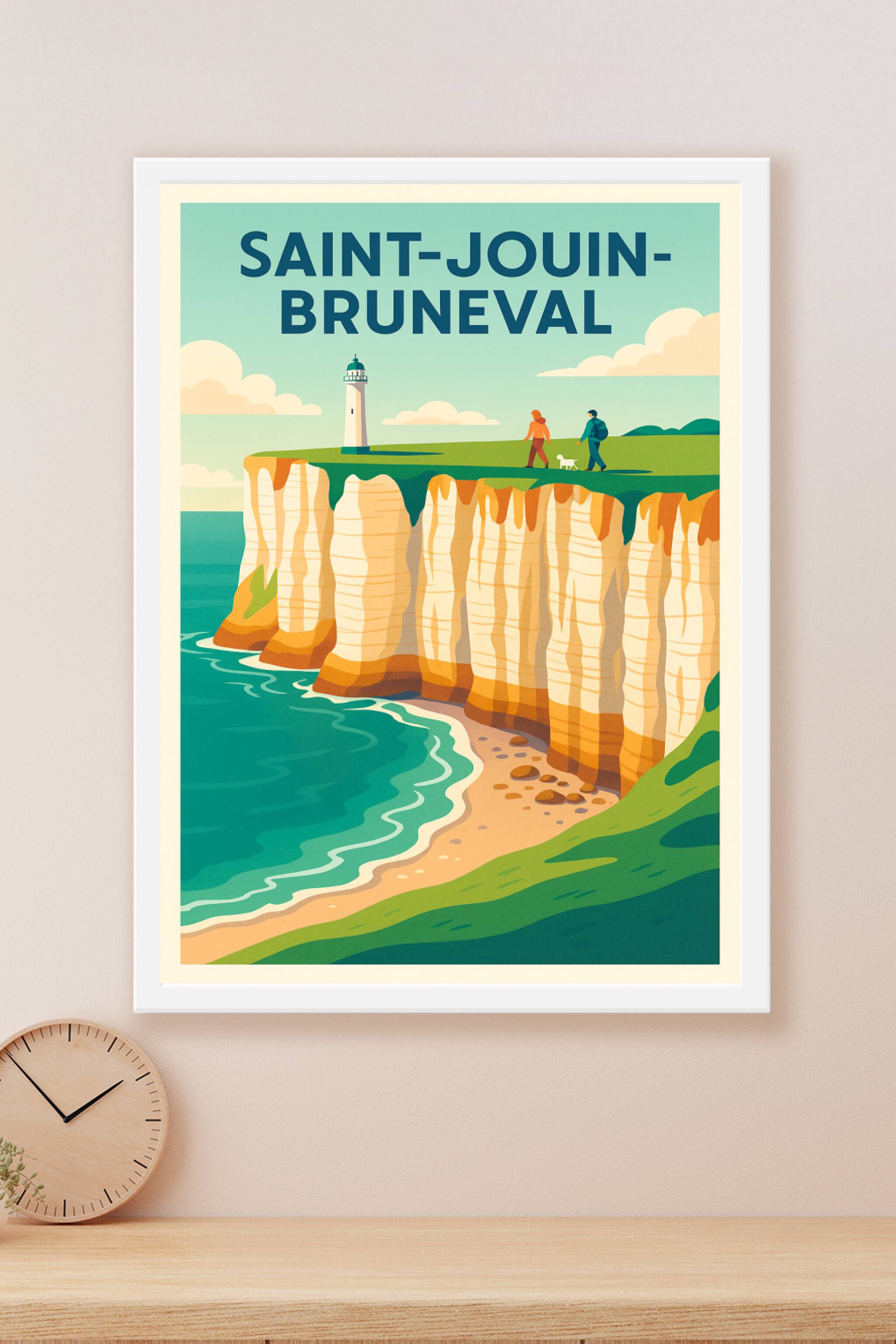 Découvrez la beauté spectaculaire des falaises de Saint-Jouin-Bruneval avec cette affiche illustrée au style vintage et épuré. Le poster capture la...