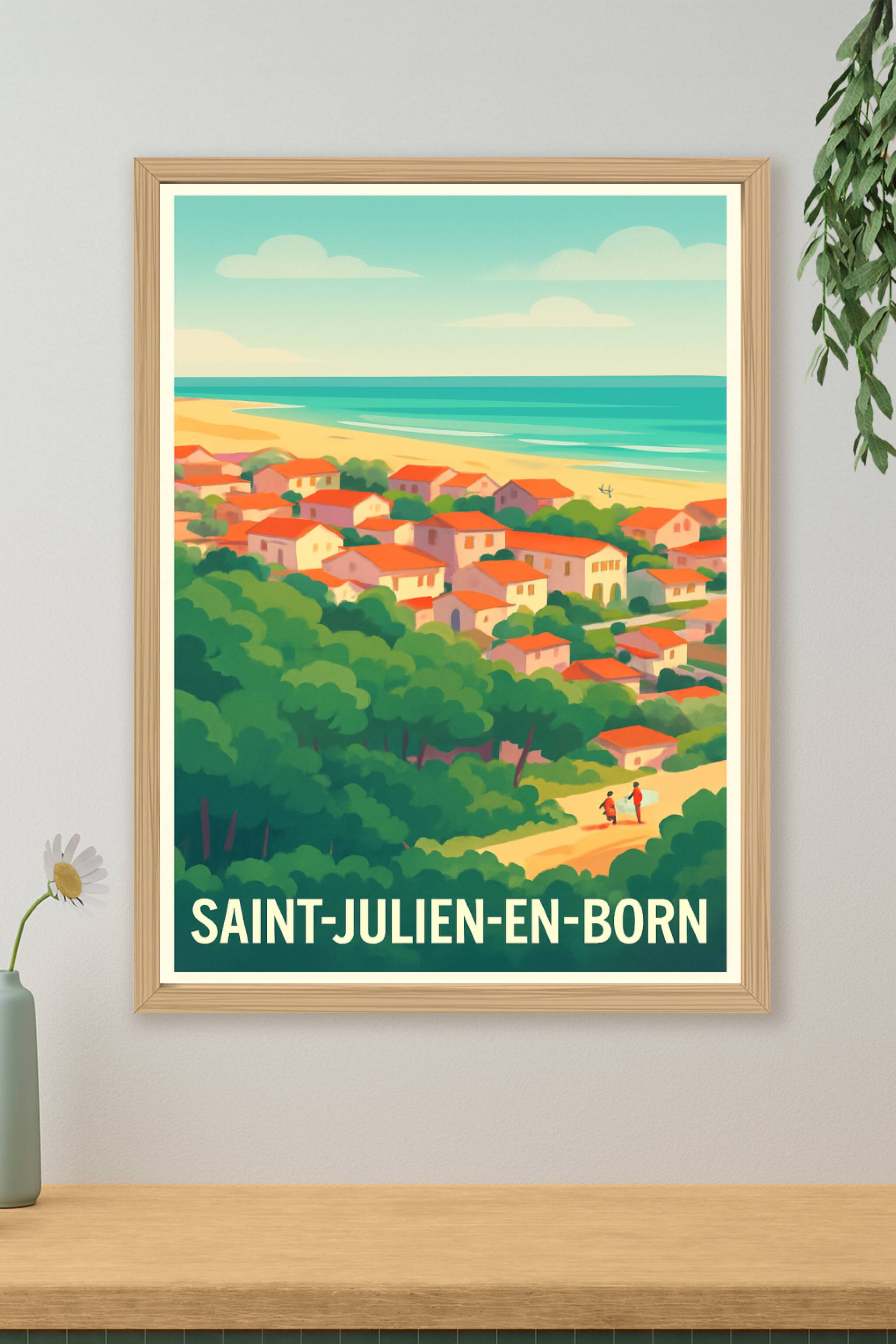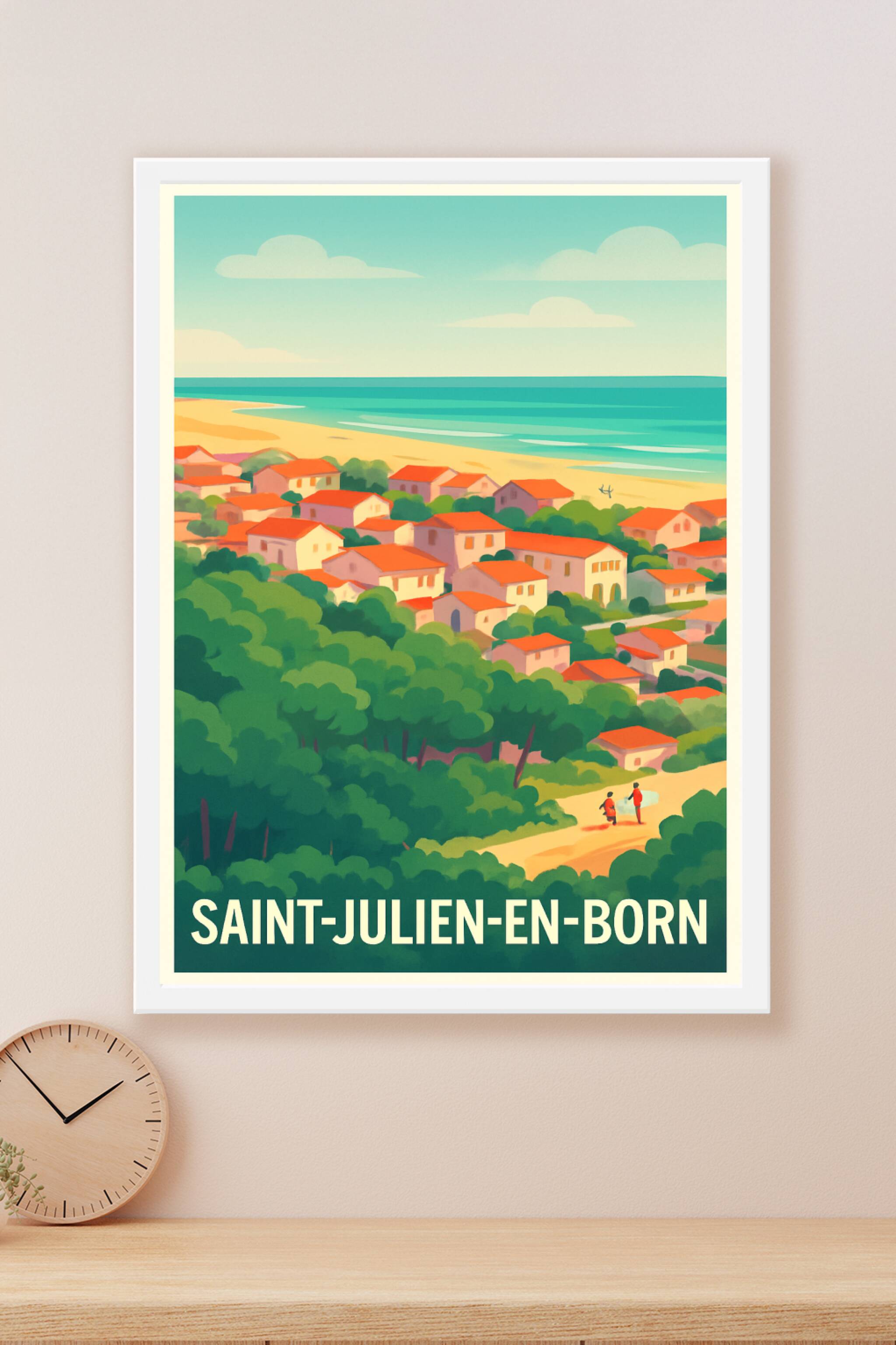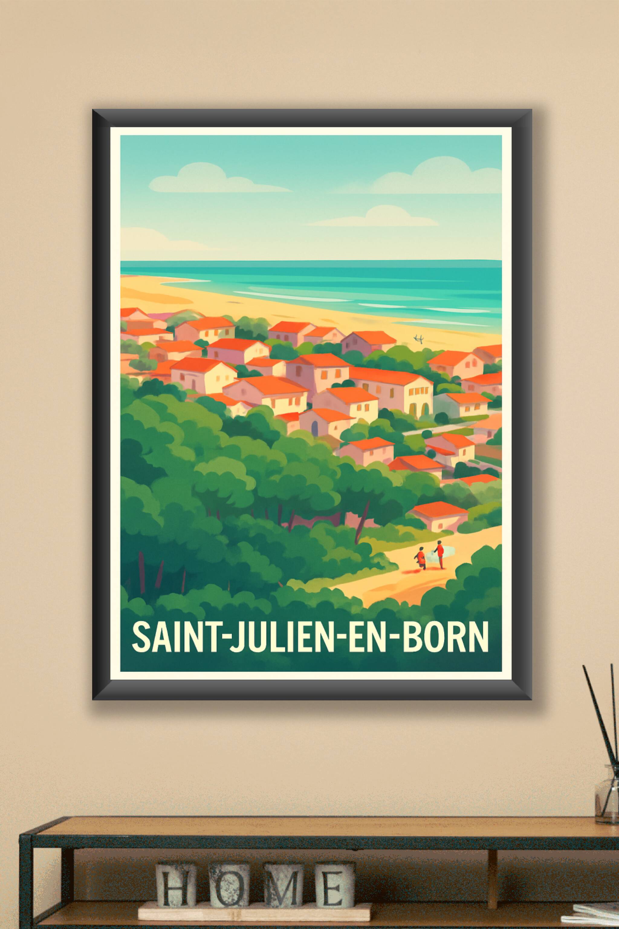 Découvrez la douceur de vivre de Saint-Julien-en-Born avec ce poster au style vintage évoquant ses maisons au toit rouge nichées entre forêt et océ...