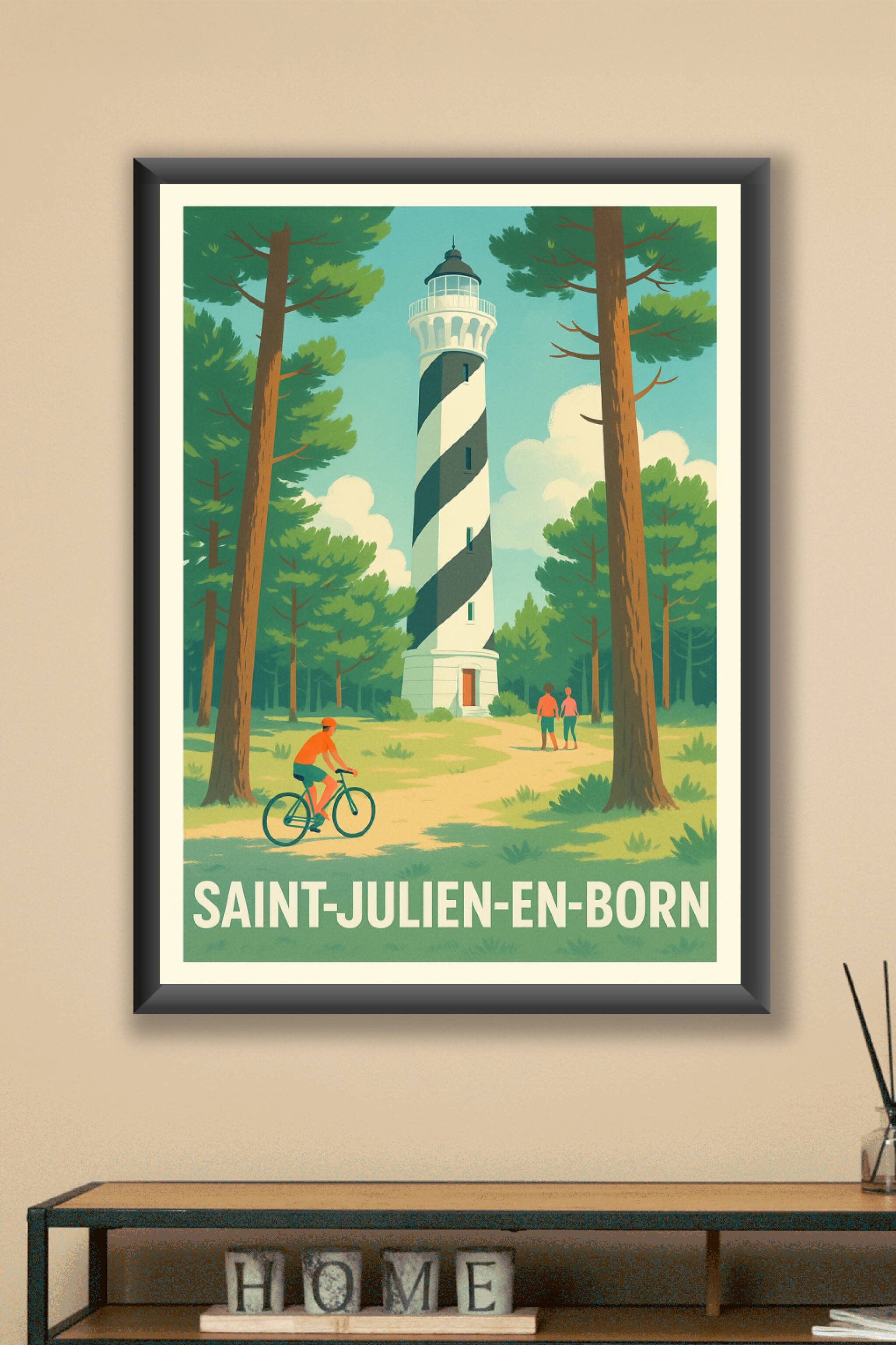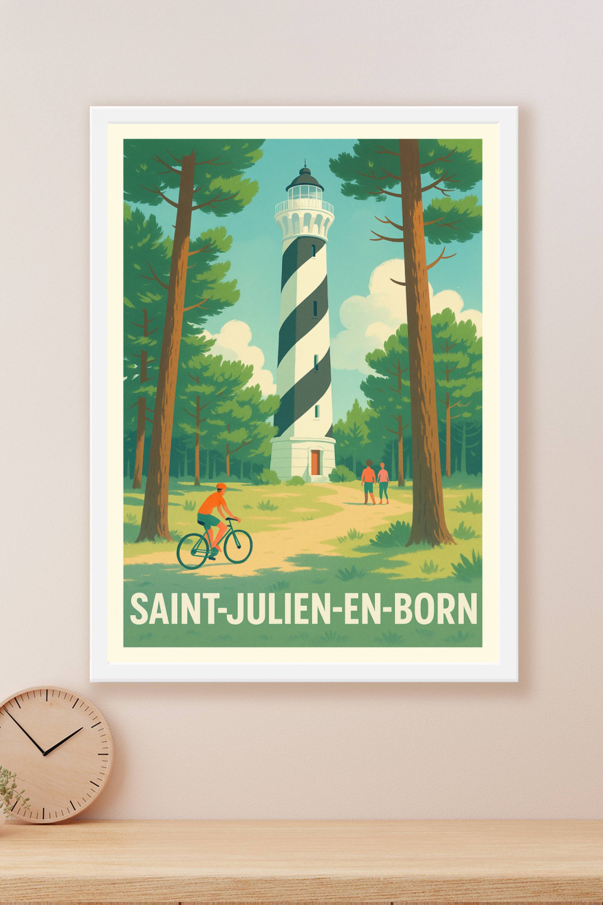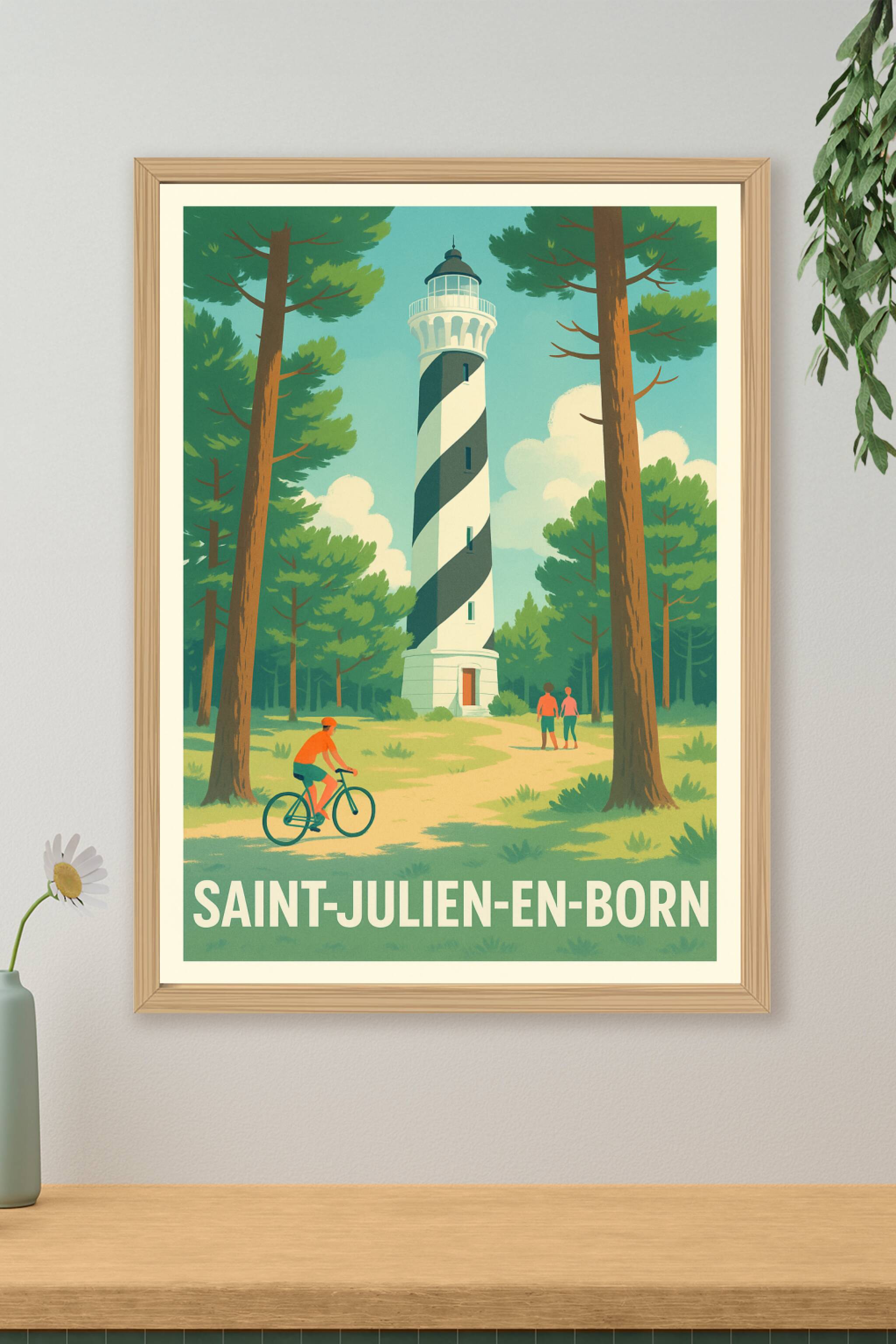 Découvrez la sérénité de Saint-Julien-en-Born avec cette affiche illustrée mettant en scène son phare iconique au cœur d'une forêt verdoyante. Ce p...