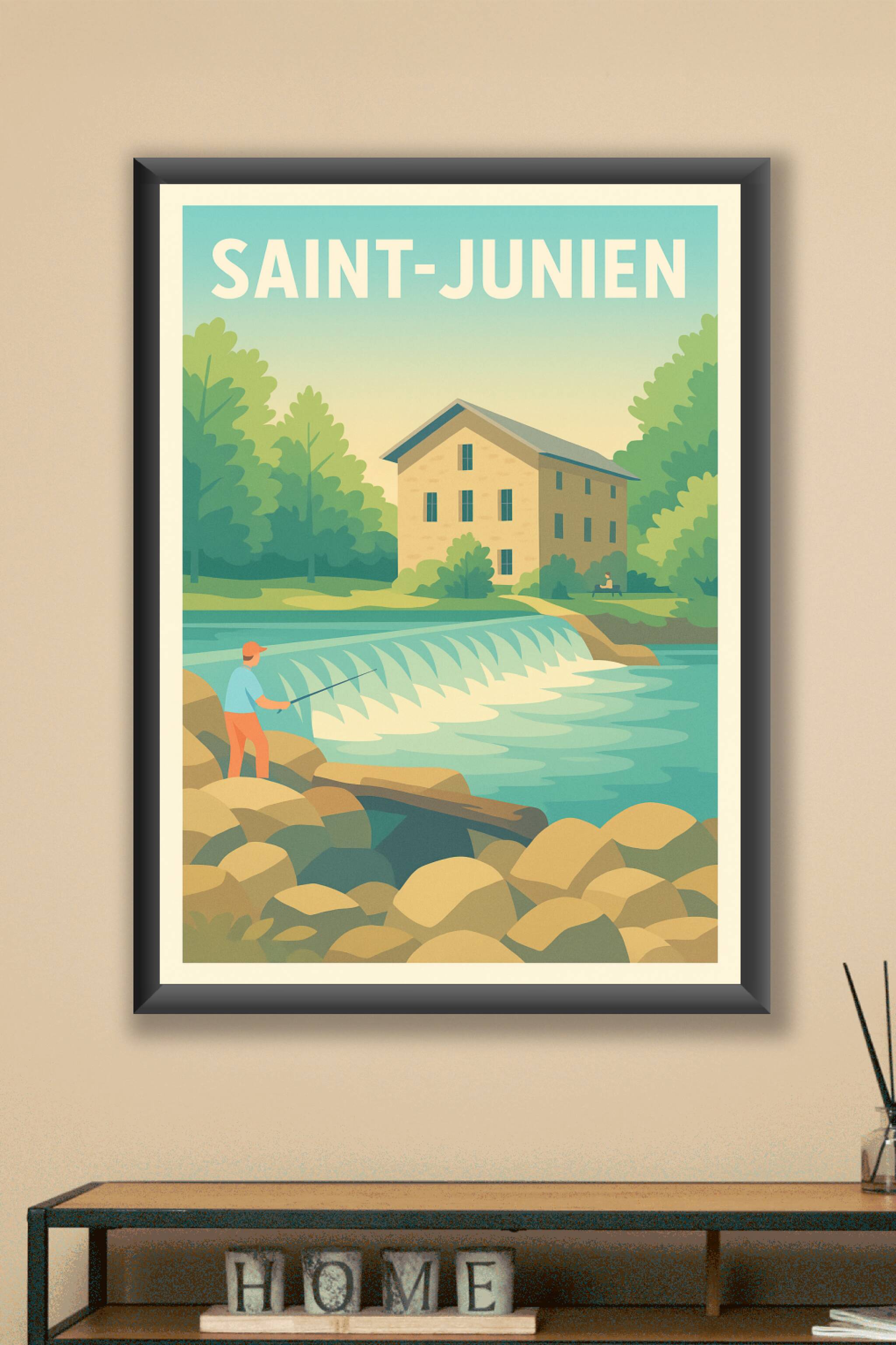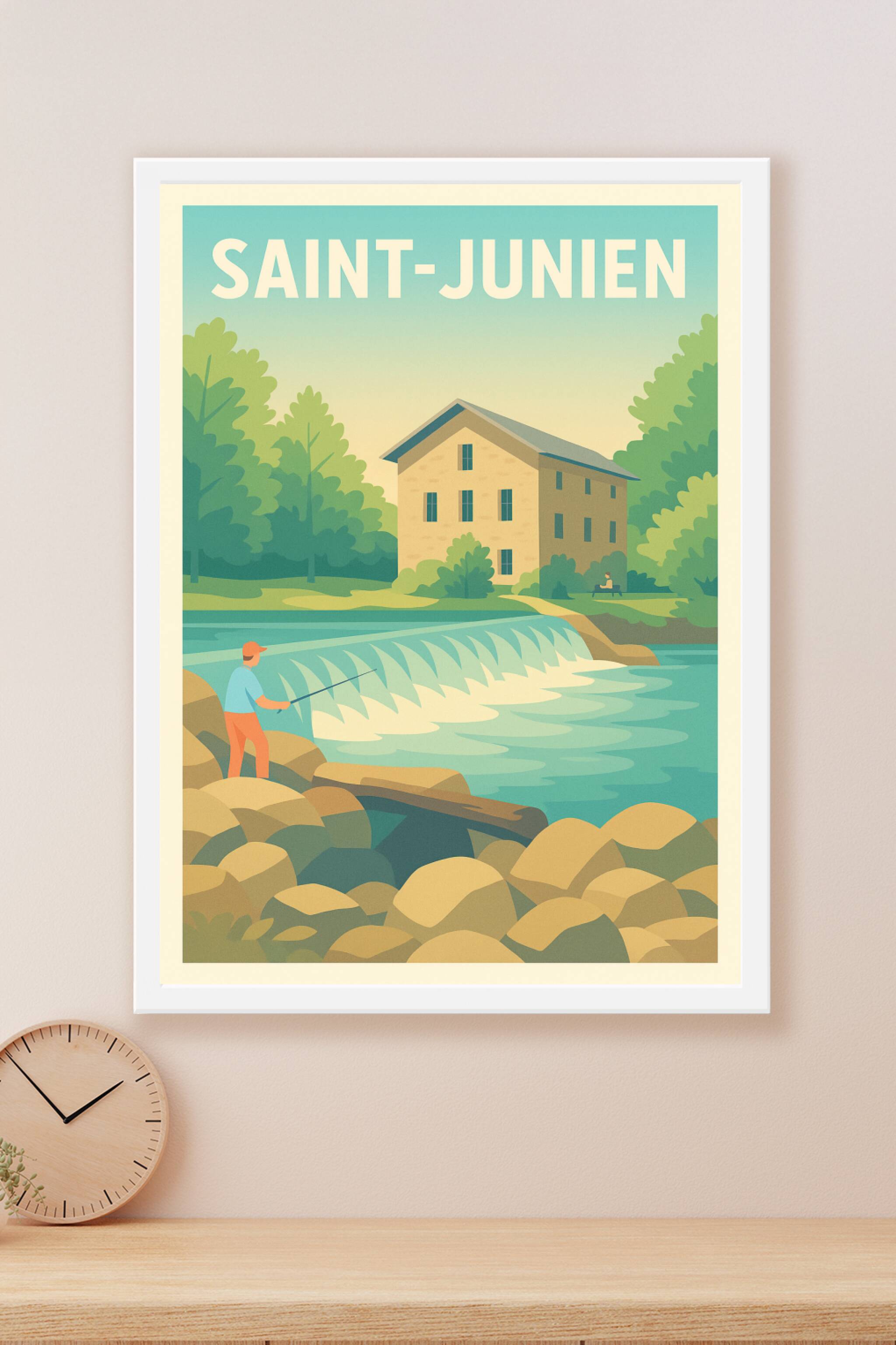 Découvrez la sérénité de Saint-Junien à travers cette affiche illustrée aux couleurs douces et apaisantes. Représentant un pêcheur au bord d'une ri...