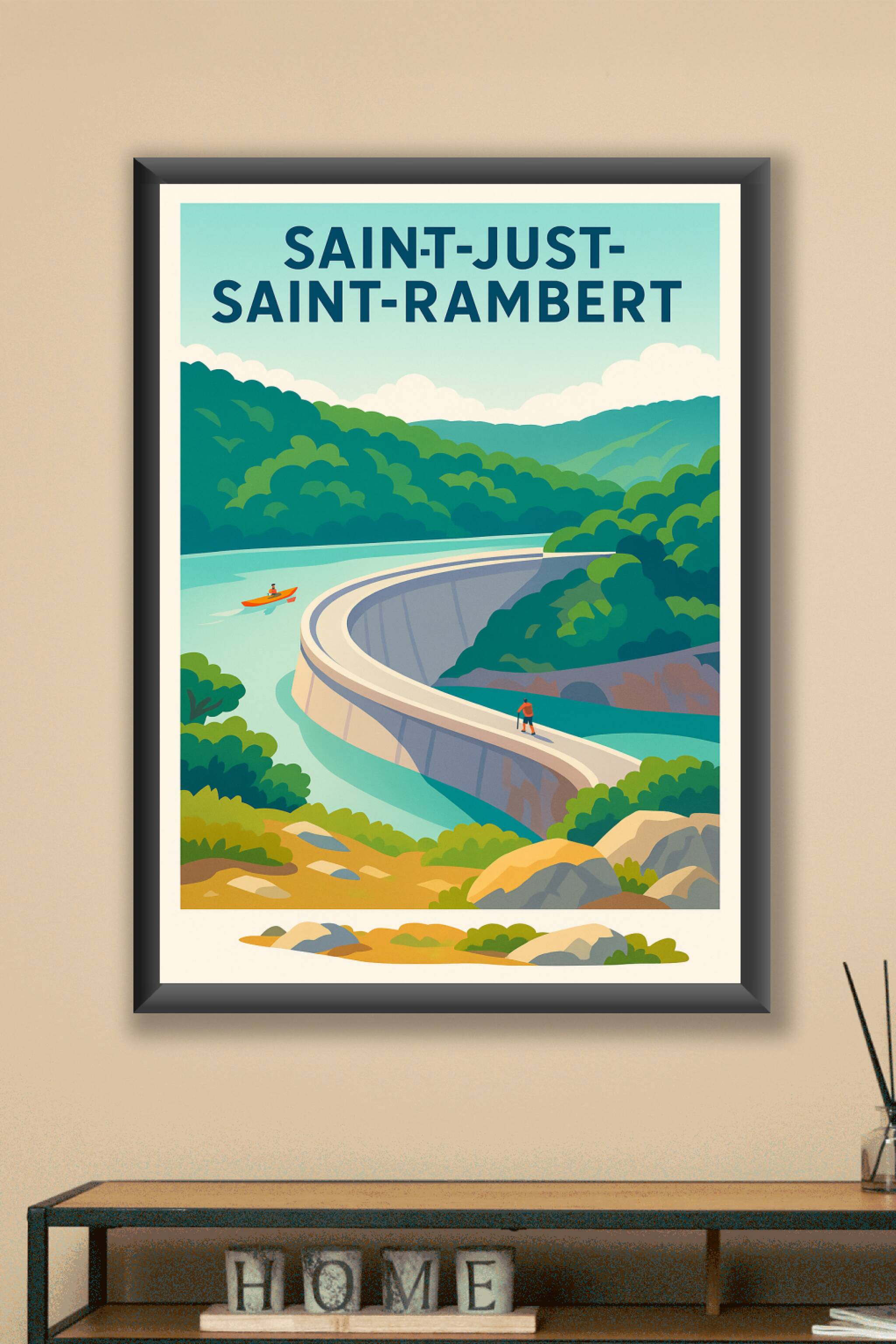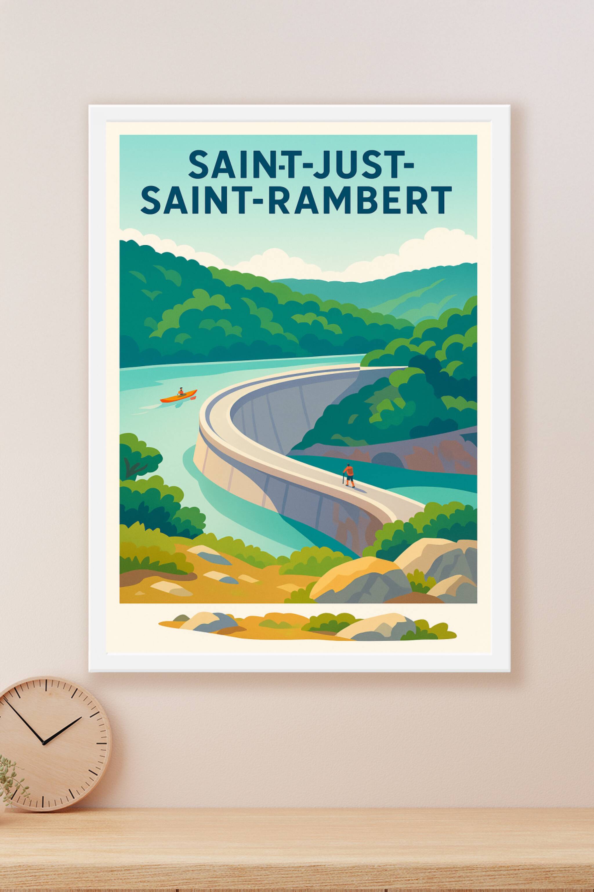Découvrez la beauté sereine de Saint-Just-Saint-Rambert à travers cette affiche illustrée représentant un magnifique barrage entouré d'une nature l...