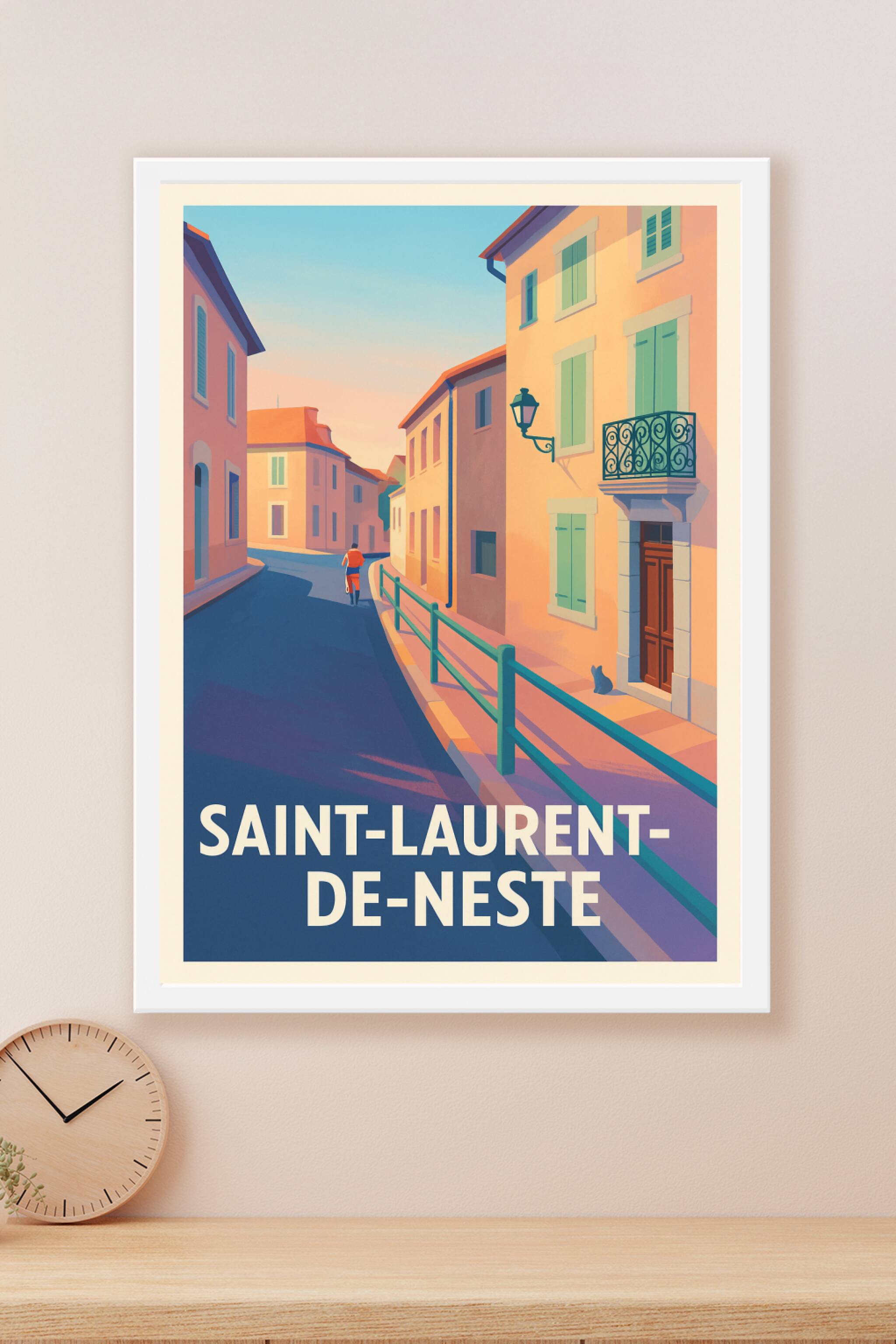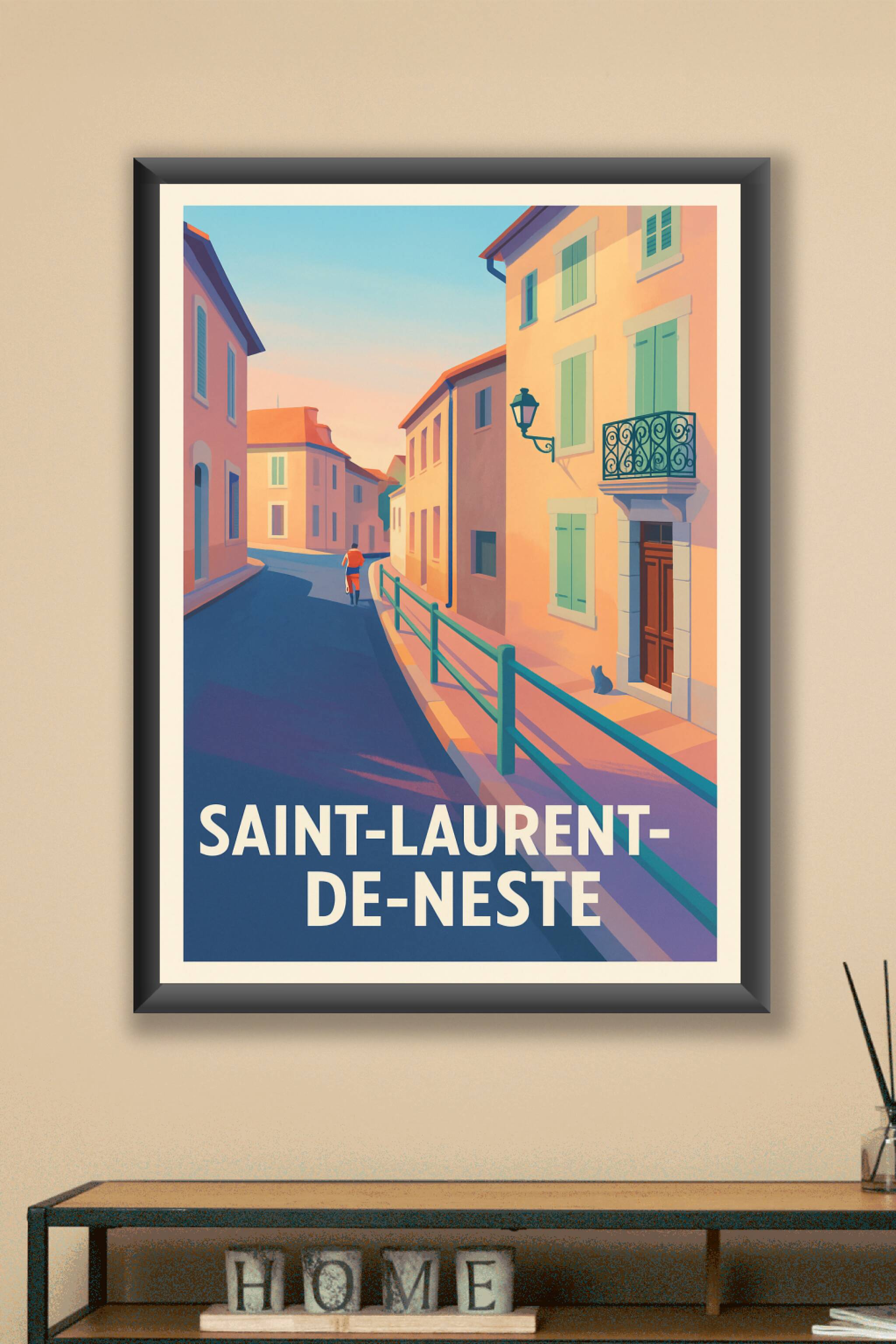Découvrez le calme et la douceur de vivre de Saint-Laurent-de-Neste avec cette affiche illustrant une ruelle baignée par la lumière dorée du soleil...