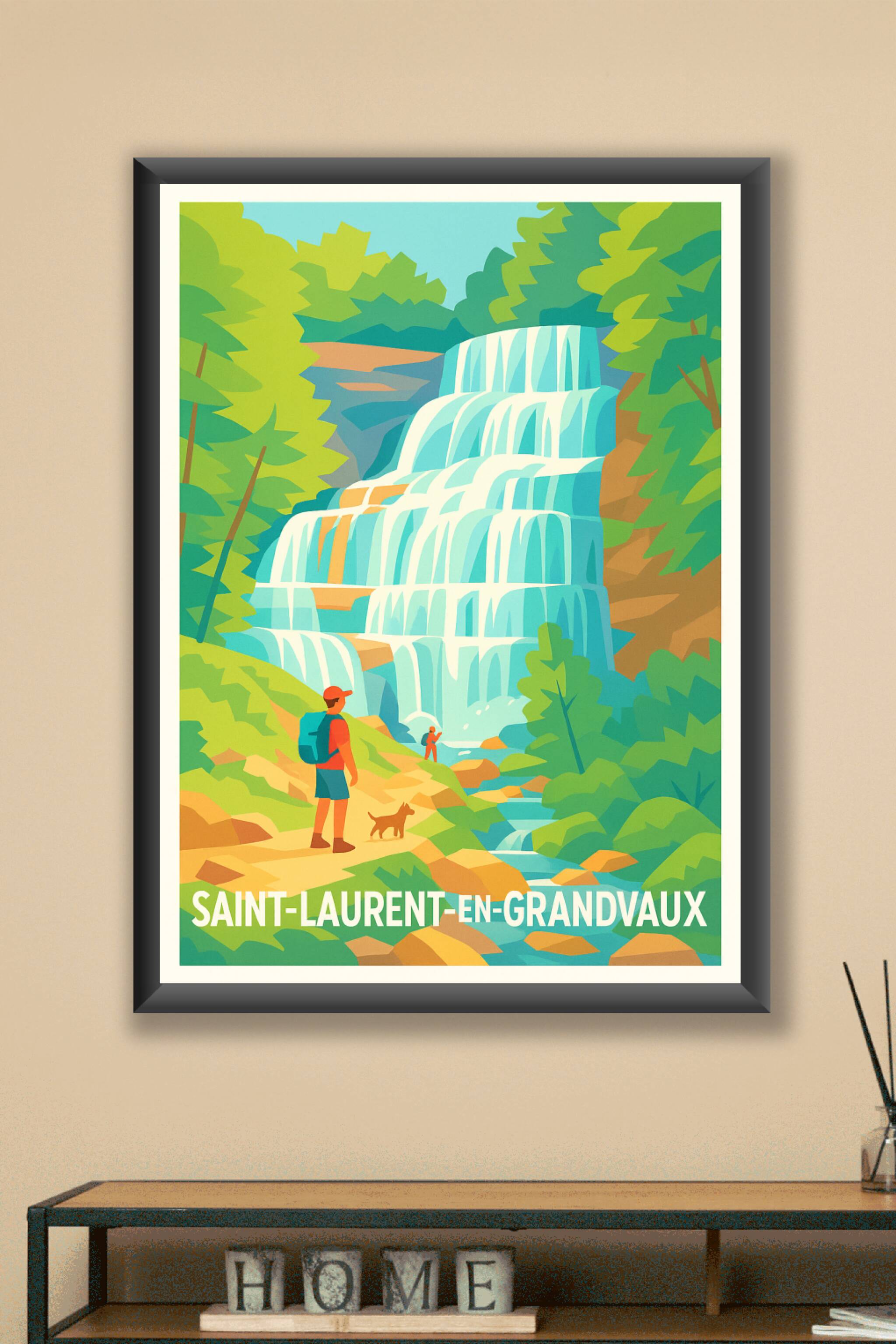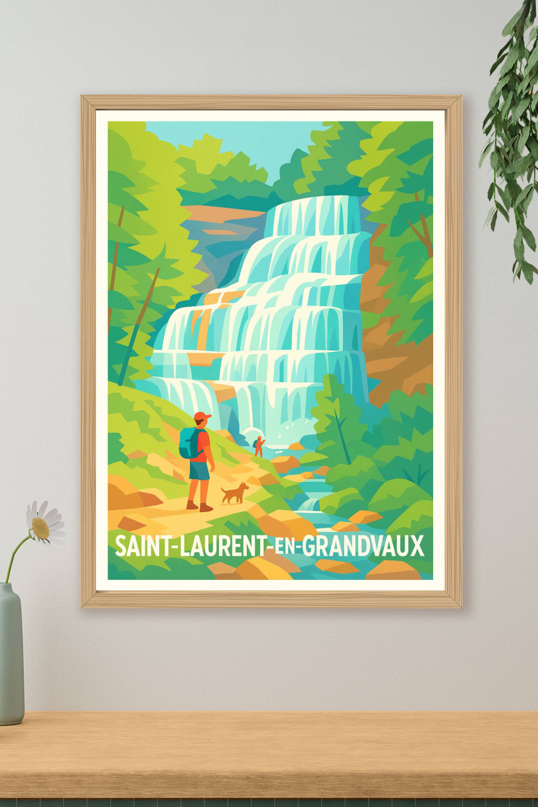Évadez-vous au cœur de la nature avec cette affiche illustrant les majestueuses cascades de Saint-Laurent-en-Grandvaux. Ce poster vibrant met en sc...