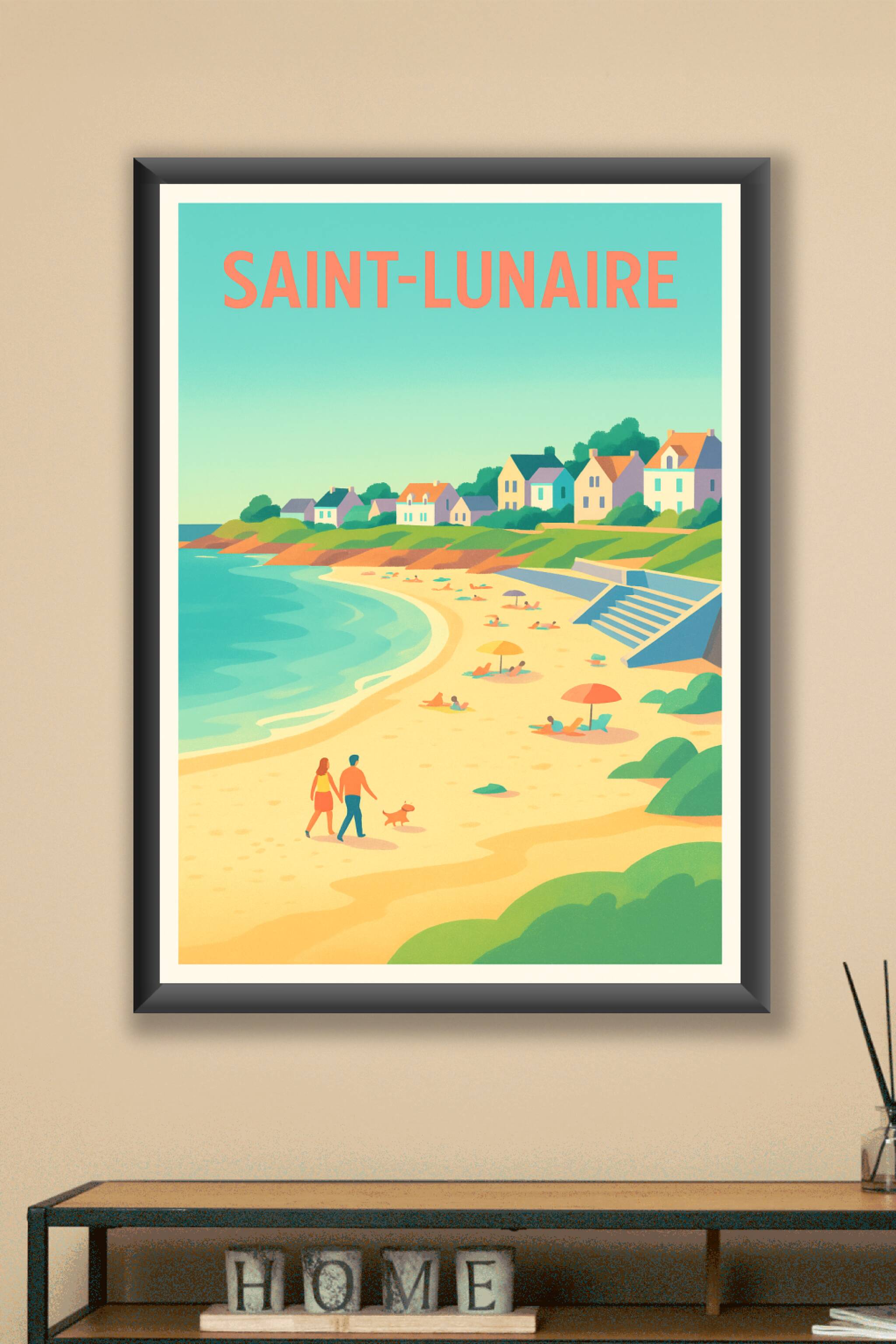 Offrez-vous une pause détente au bord de la mer avec cette affiche illustrant la plage iconique de Saint-Lunaire et ses maisons au charme typique b...