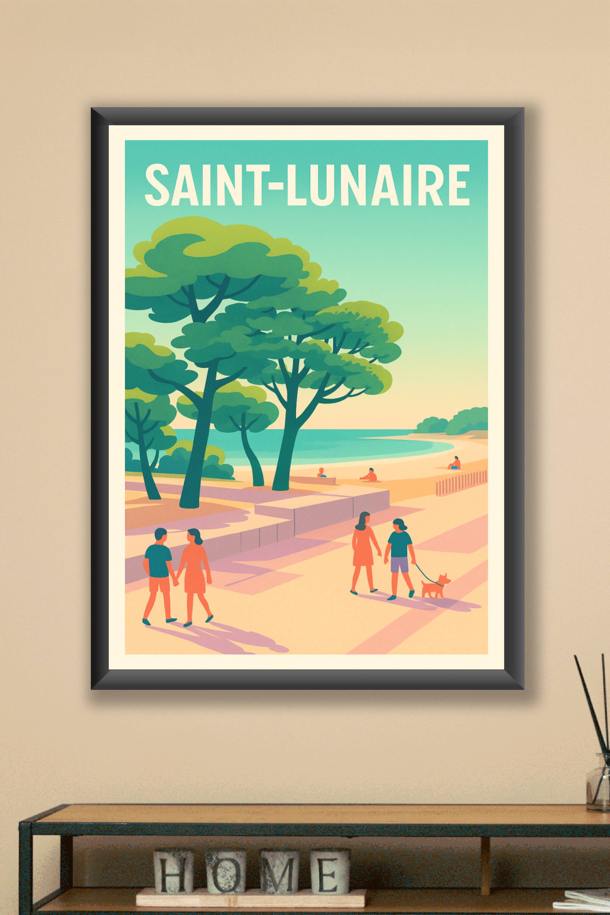 Découvrez la douceur de vivre de Saint-Lunaire avec cette affiche au design épuré et aux couleurs pastel qui évoquent la tranquillité des balades e...