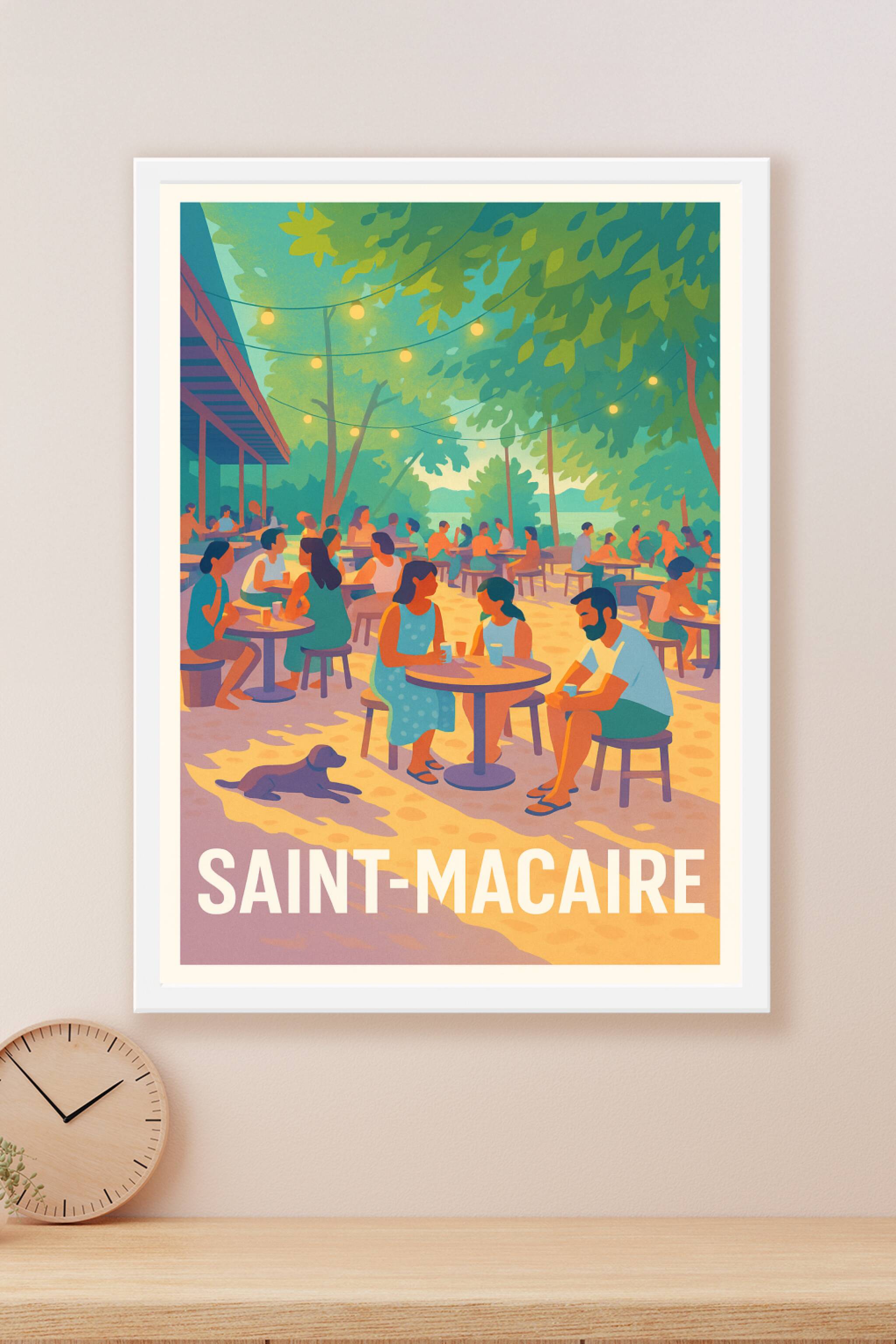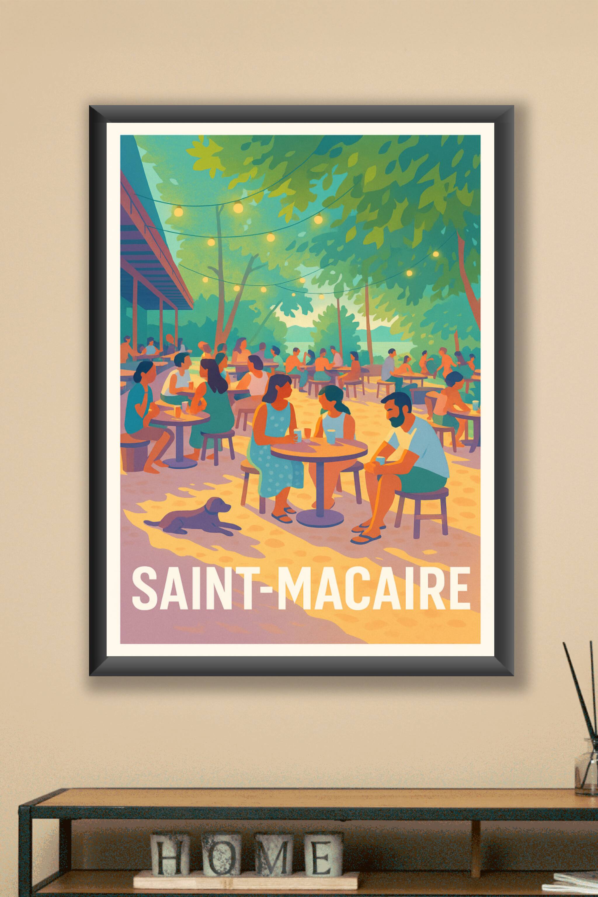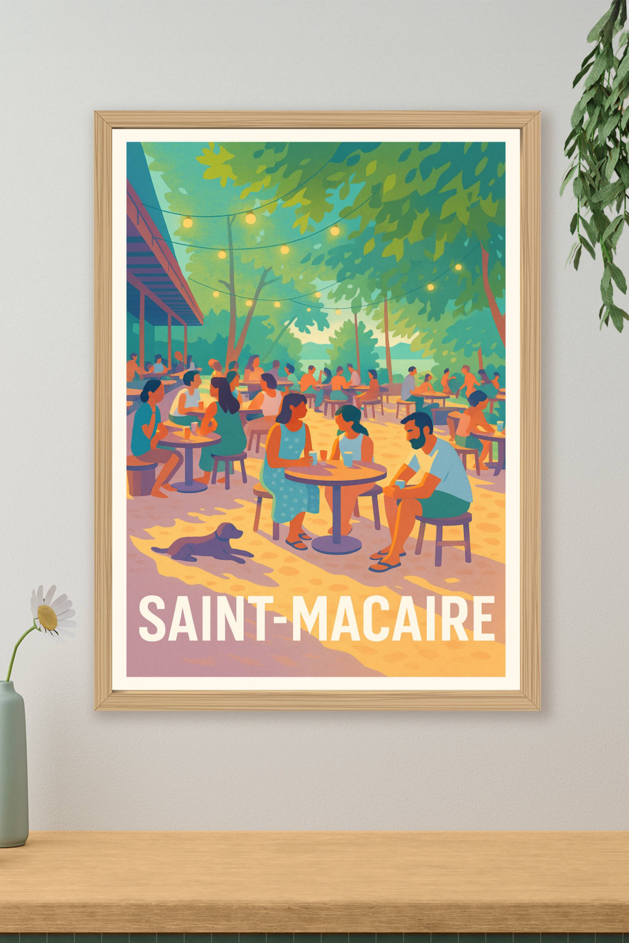 Découvrez l'atmosphère chaleureuse et paisible de Saint-Macaire avec cette affiche illustrée, mettant en scène une terrasse animée sous un feuillag...