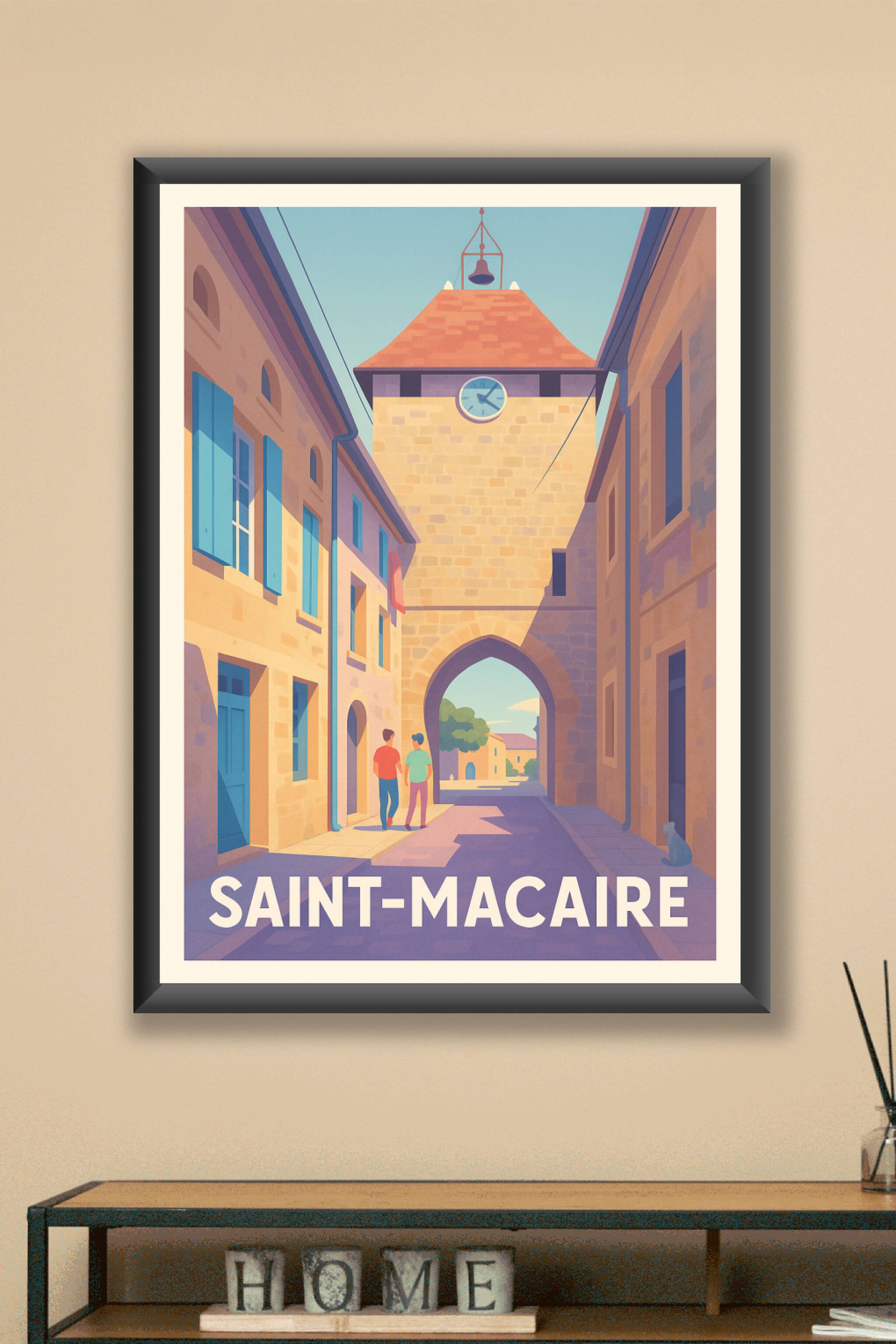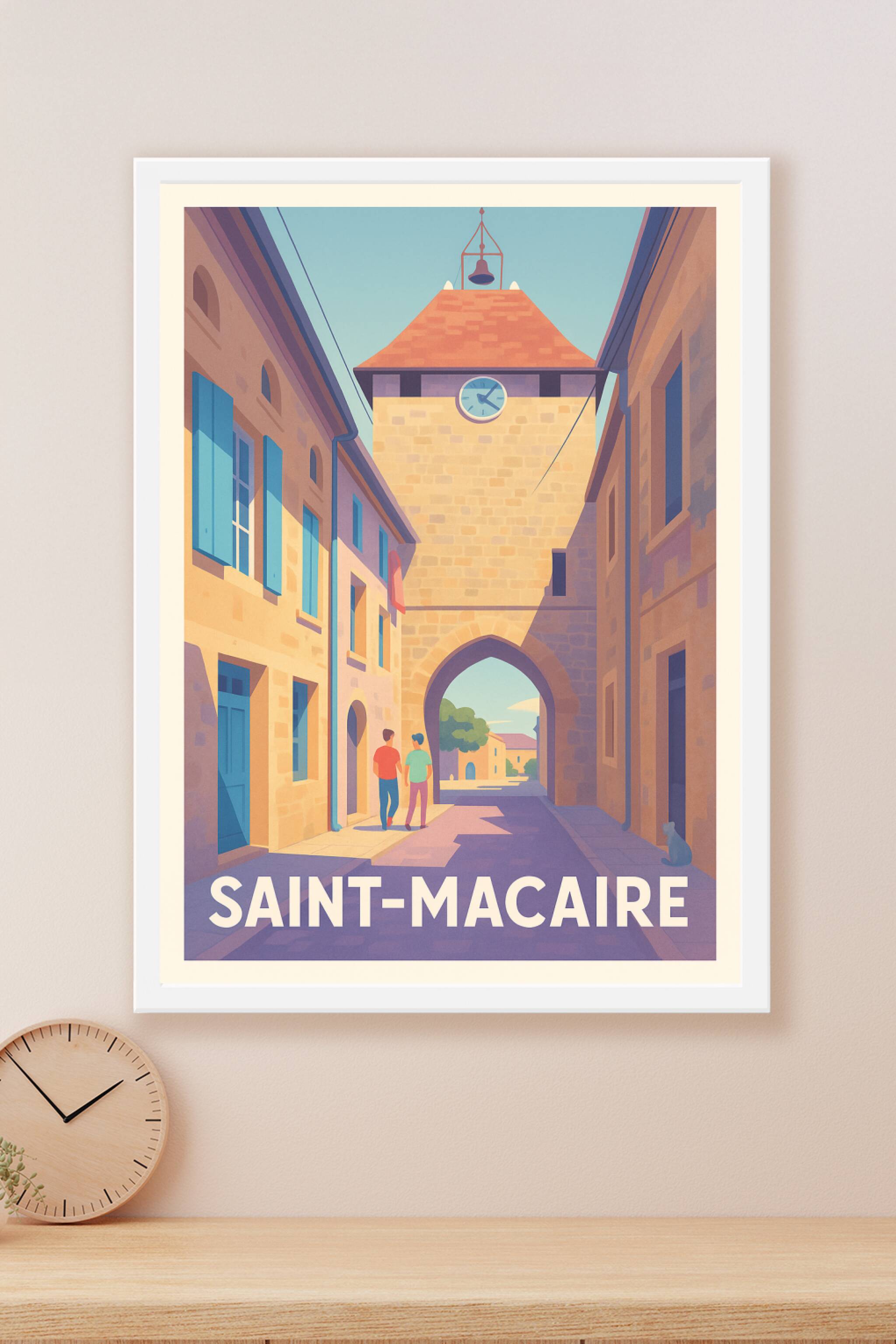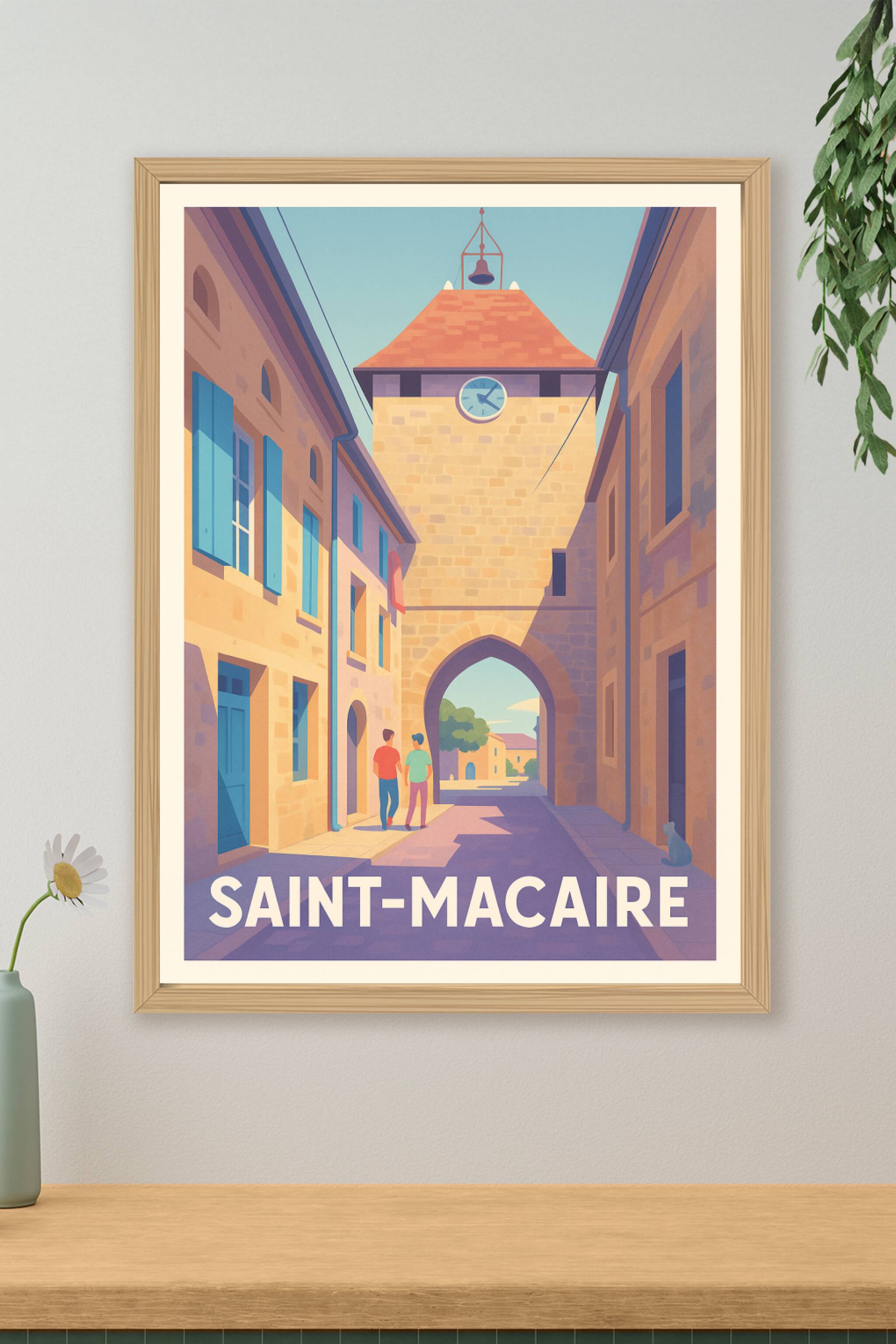 Découvrez l'atmosphère paisible et authentique de Saint-Macaire avec cette affiche au style vintage mettant en scène une rue historique dominée par...