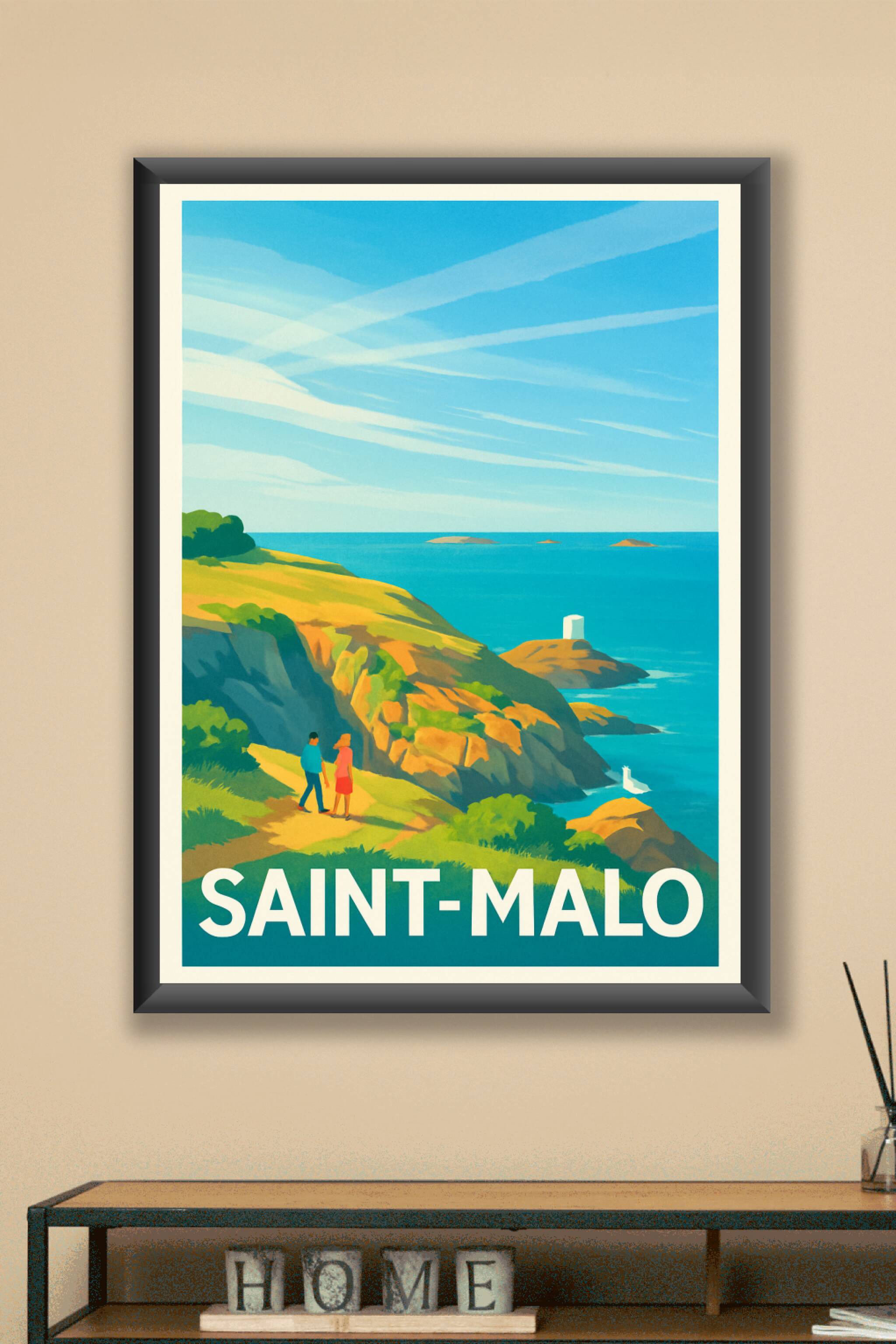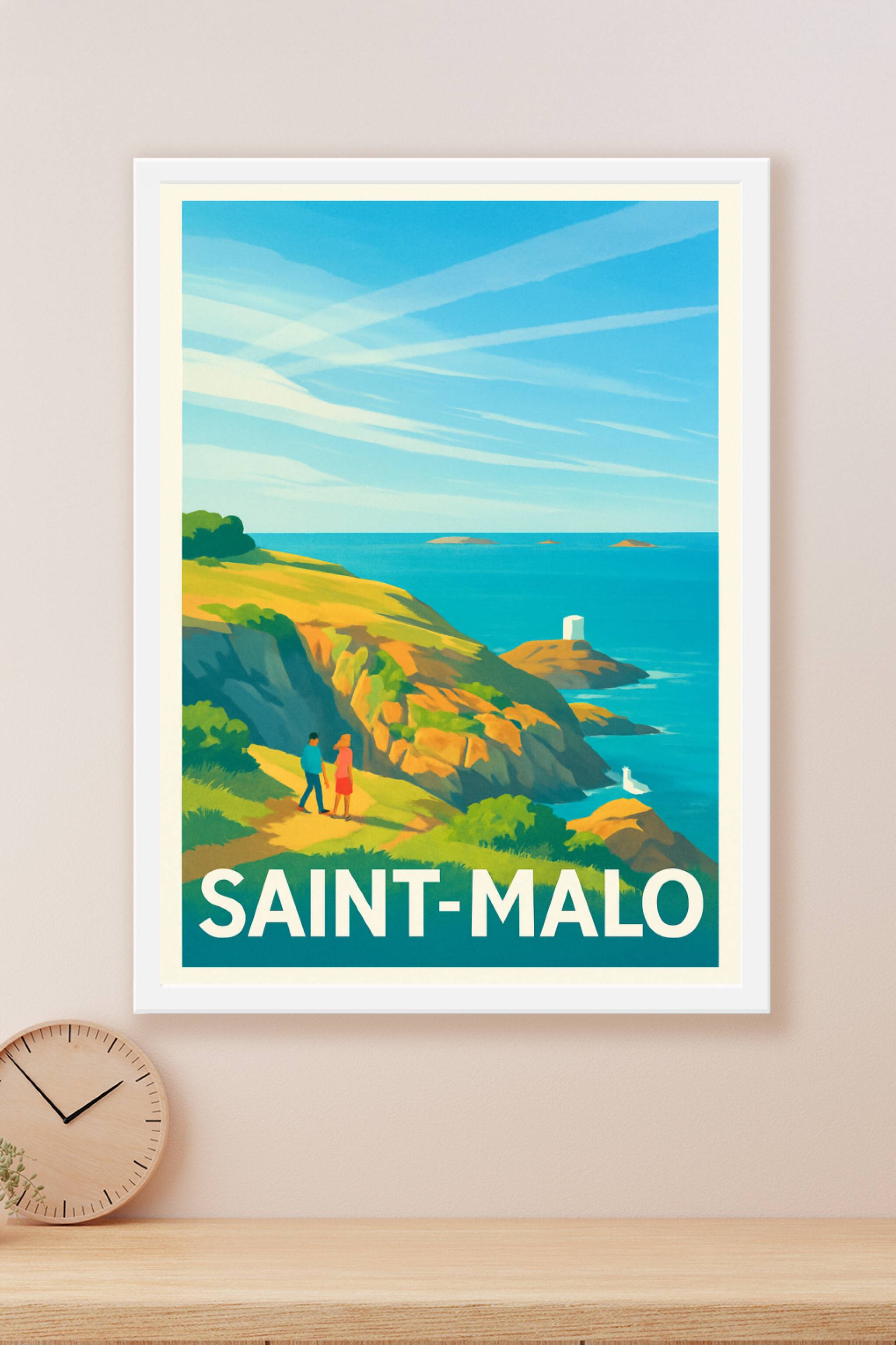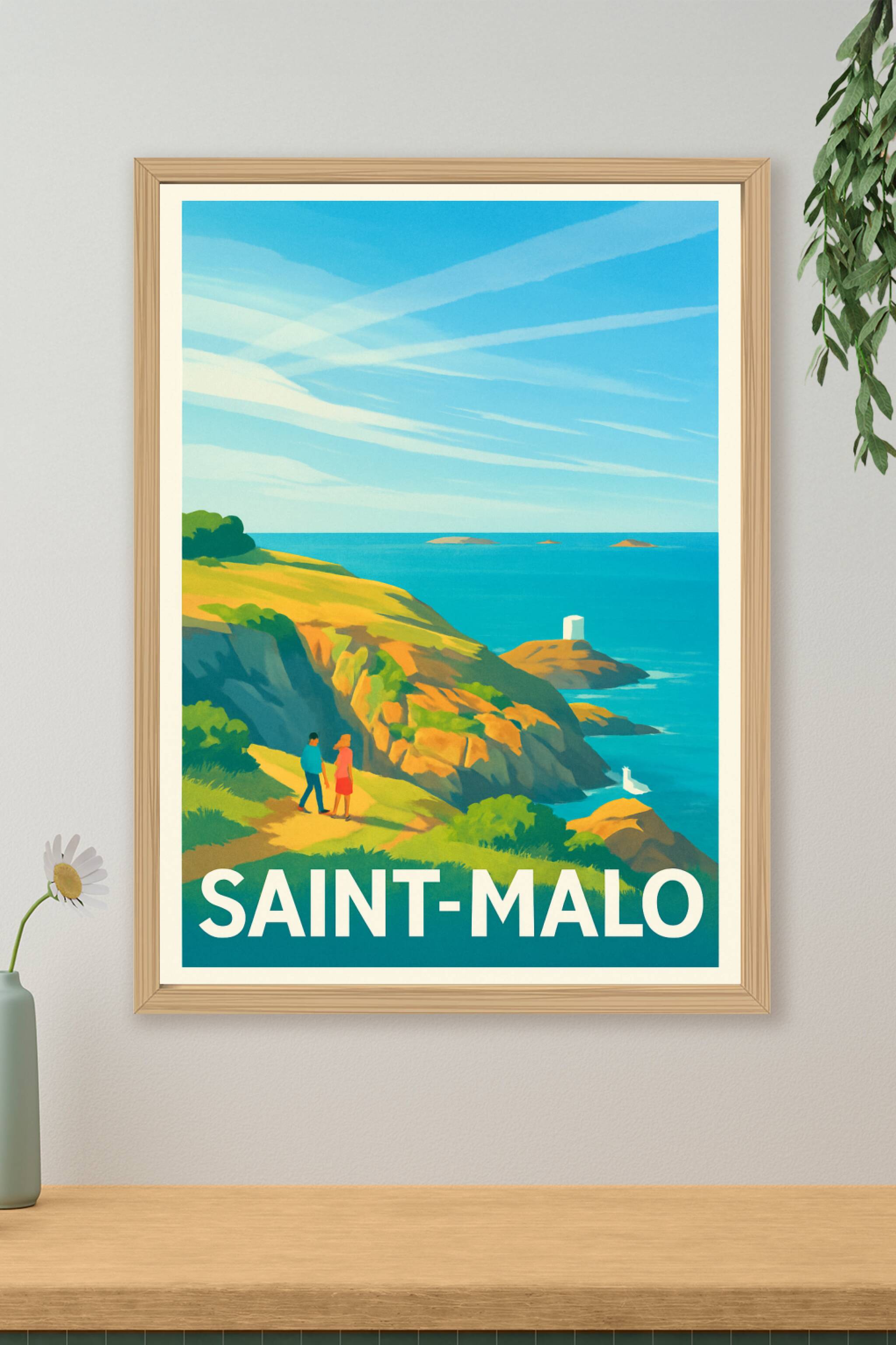 Découvrez la beauté sauvage de Saint-Malo avec cette affiche illustrée qui capture un moment paisible en bord de mer, entre falaises et horizon azu...