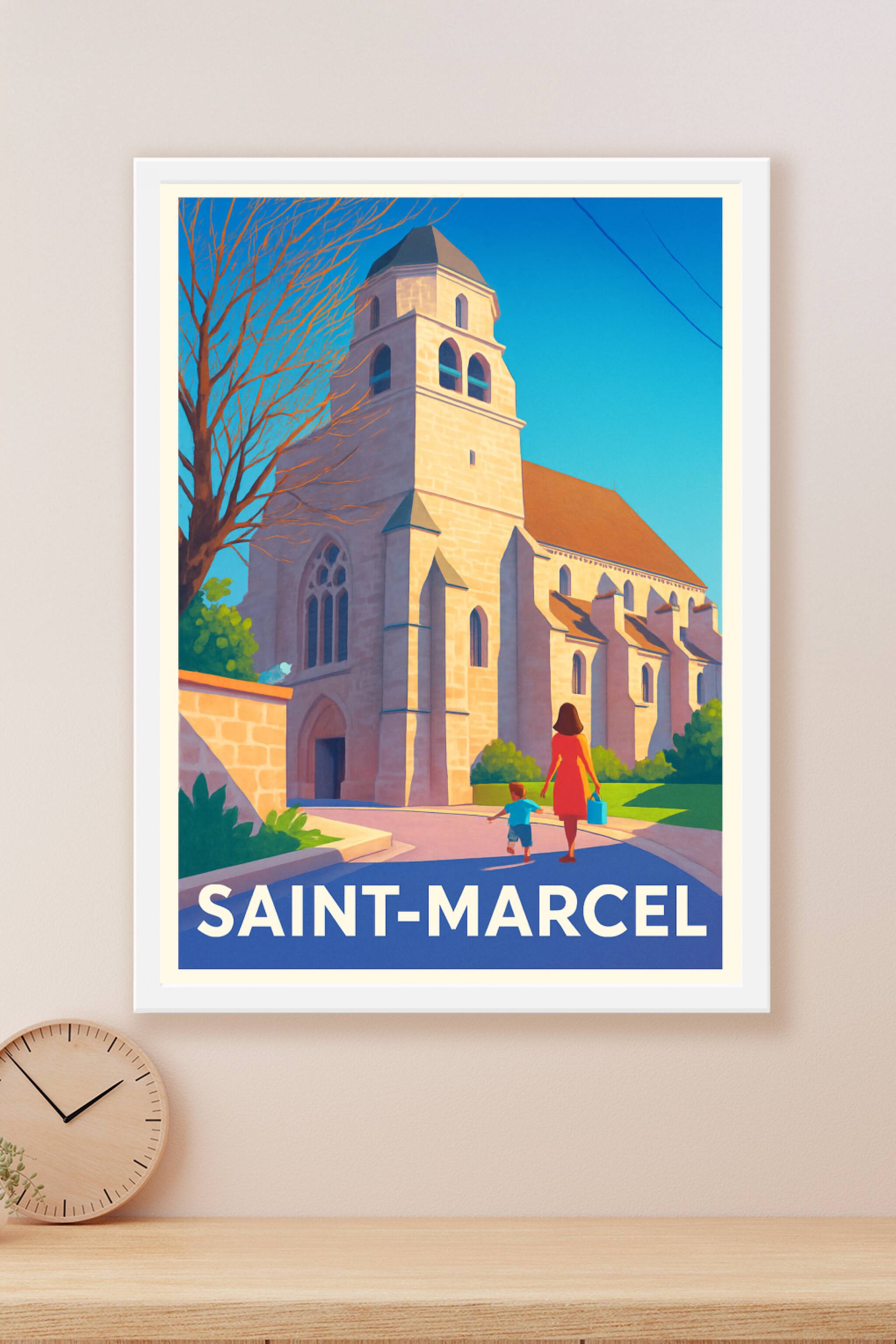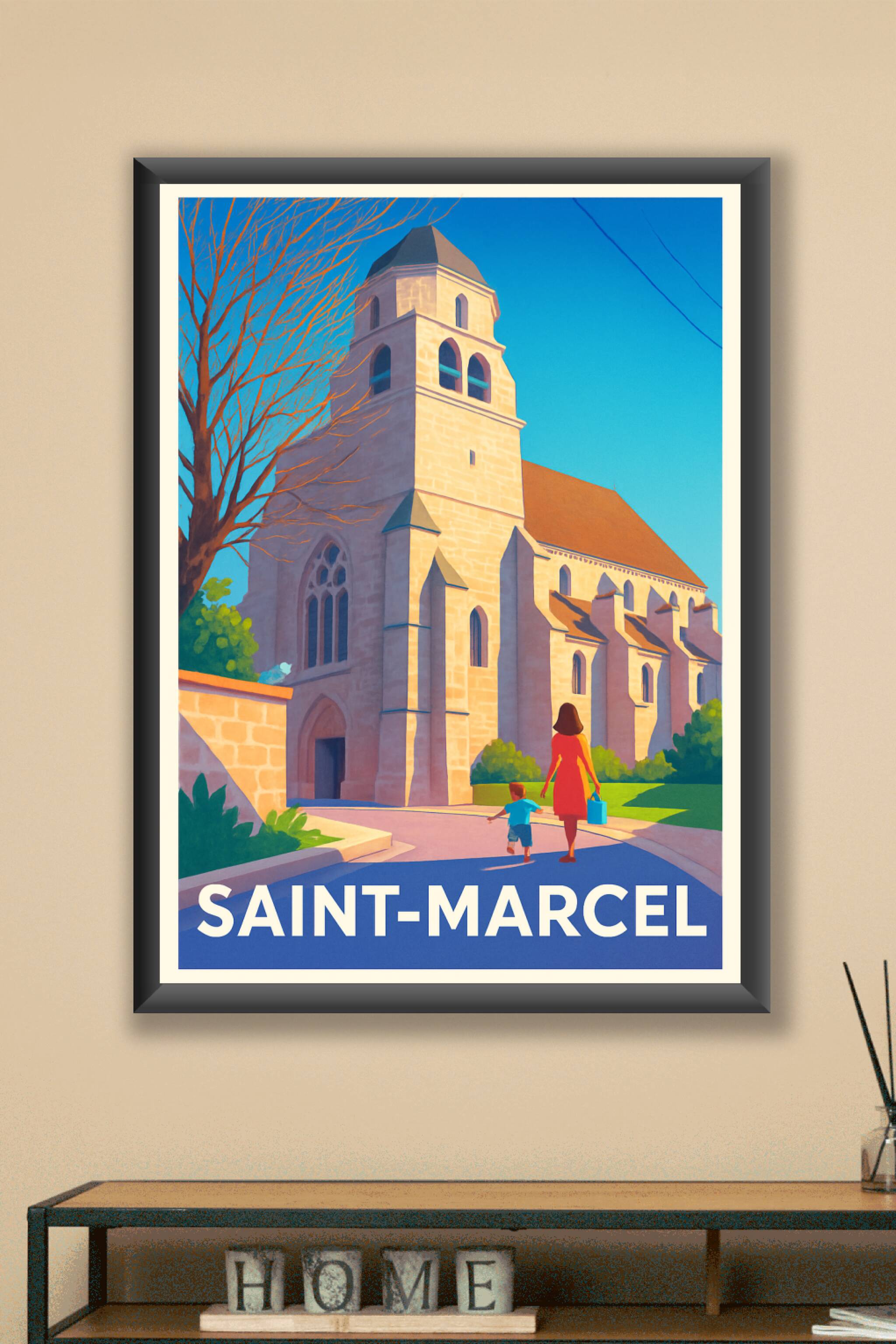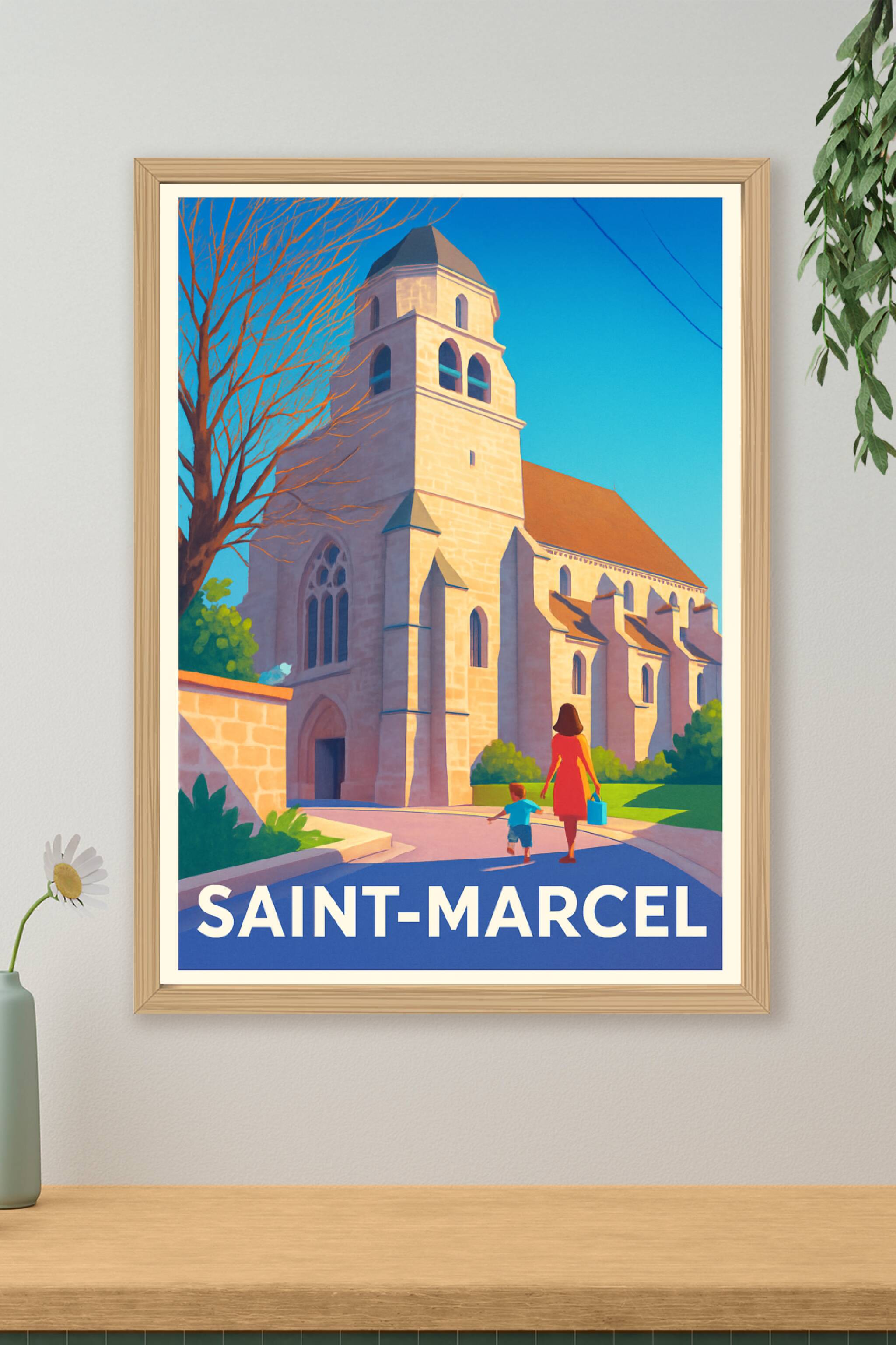 Découvrez l'élégance intemporelle de Saint-Marcel avec cette affiche illustrée mettant en scène une église historique baignée par une lumière douce...