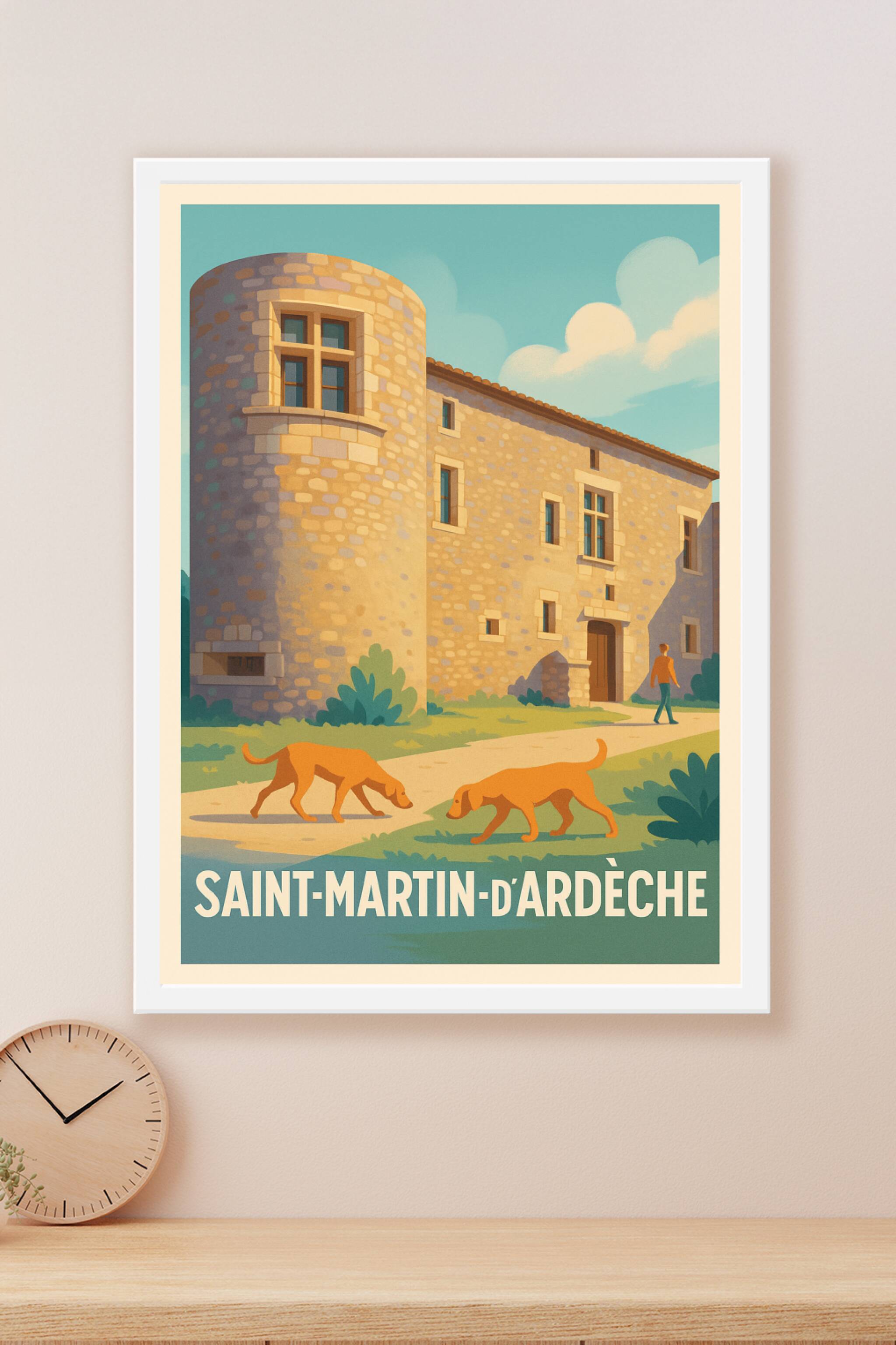 Découvrez l'atmosphère paisible et authentique de Saint-Martin-d'Ardèche à travers cette affiche au style rétro vintage. Le poster met en scène une...