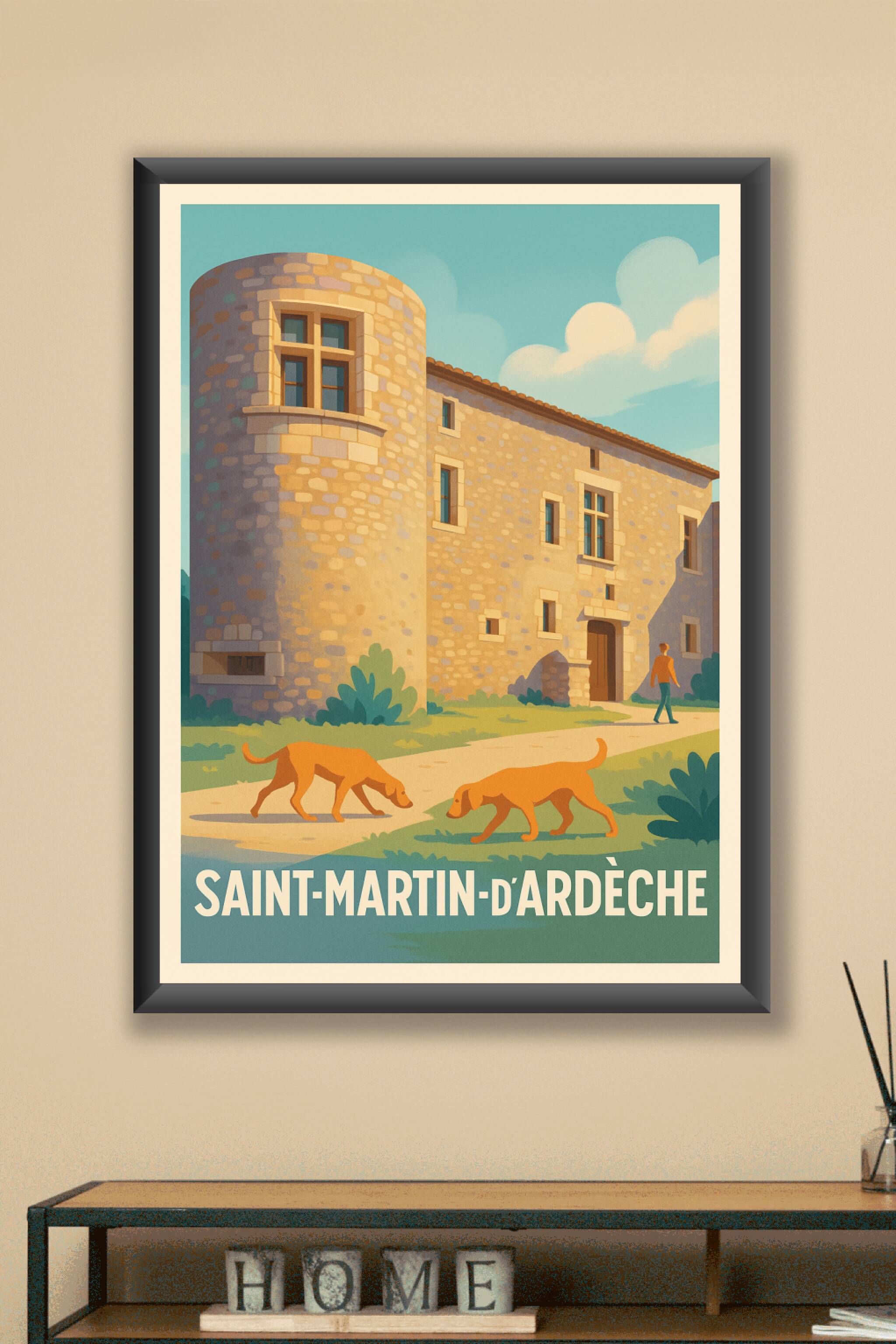 Découvrez l'atmosphère paisible et authentique de Saint-Martin-d'Ardèche à travers cette affiche au style rétro vintage. Le poster met en scène une bâtisse en pierre typique de la région, baignée par une lumière douce d'après-midi, avec deux chiens et un promeneur pour souligner la tranquillité du lieu. Cette affiche est imprimée en tirage "Fine Art" sur papier 305g coton, garantissant une qualité d'impression exceptionnelle et une longévité remarquable. Disponible en formats A1 à A4, avec ou sans cadre, elle s'intègre parfaitement à toute décoration d'intérieur, apportant une touche chaleureuse et rustique. Offrez-vous ou offrez à un proche un souvenir authentique et élégant de l'Ardèche, 100% fabriqué en France.