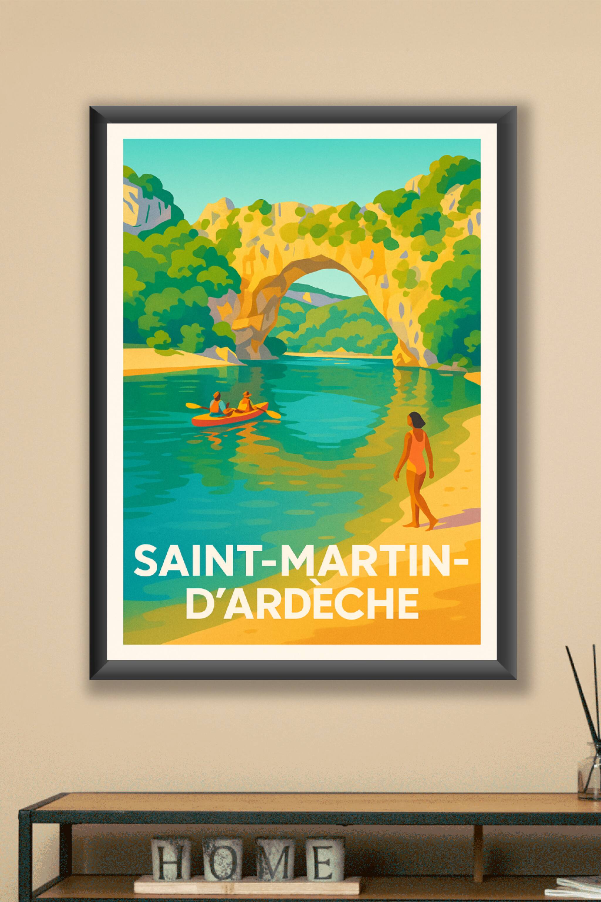 Découvrez la beauté emblématique de Saint-Martin-d'Ardèche à travers cette affiche vintage illustrée mettant en scène l'arche naturelle lumineuse et les eaux calmes idéales pour une balade en canoë. Ce poster donne vie à l'atmosphère chaleureuse et paisible de cette destination prisée des amoureux de nature et de paysages authentiques.Ce tirage "Fine Art" est réalisé sur un papier 305g coton, garantissant une qualité d'impression supérieure et des couleurs éclatantes qui sublimeront toute décoration intérieure. Disponible en formats A1 à A4, avec ou sans cadre selon votre choix, cette affiche Saint-Martin-d'Ardèche apportera une touche d'évasion et de douceur à votre espace de vie. Profitez d'une impression premium 100% française pour offrir ou vous offrir un morceau de la douceur ardéchoise.