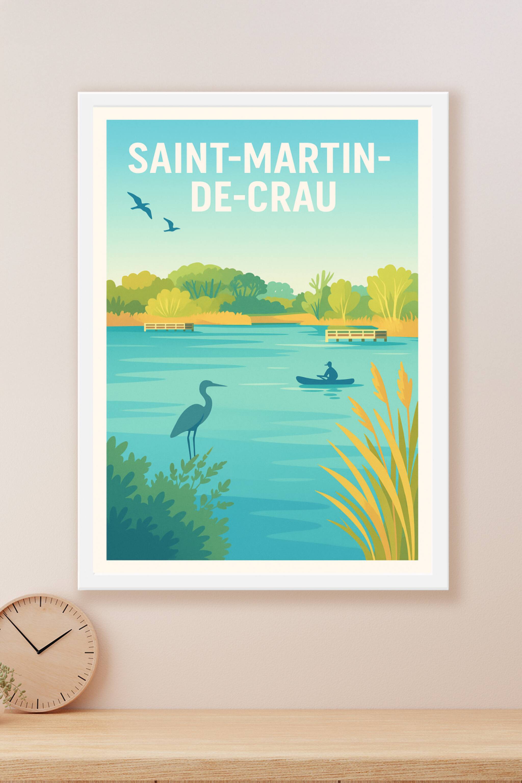 Découvrez la sérénité des paysages de Saint-Martin-de-Crau avec cette affiche illustrée qui capture un moment paisible au bord de l'eau, entre oise...