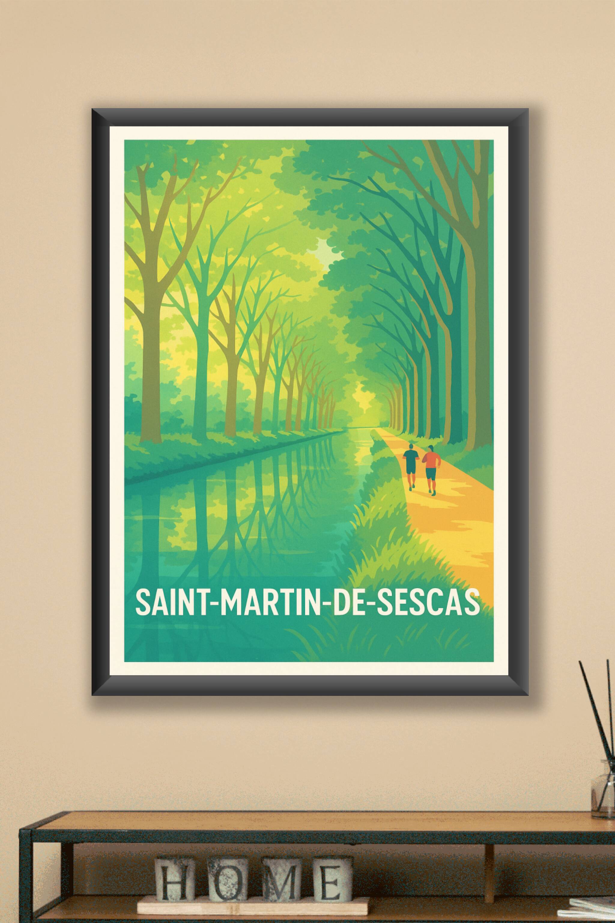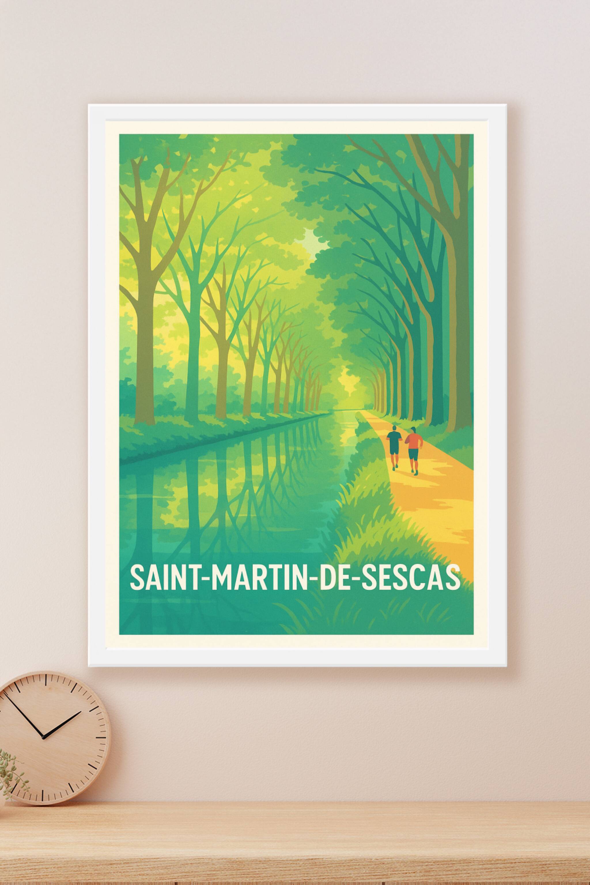 Découvrez la sérénité de Saint-Martin-de-Sescas avec cette affiche qui capture une balade en bord de canal, enveloppée par une allée d'arbres majes...